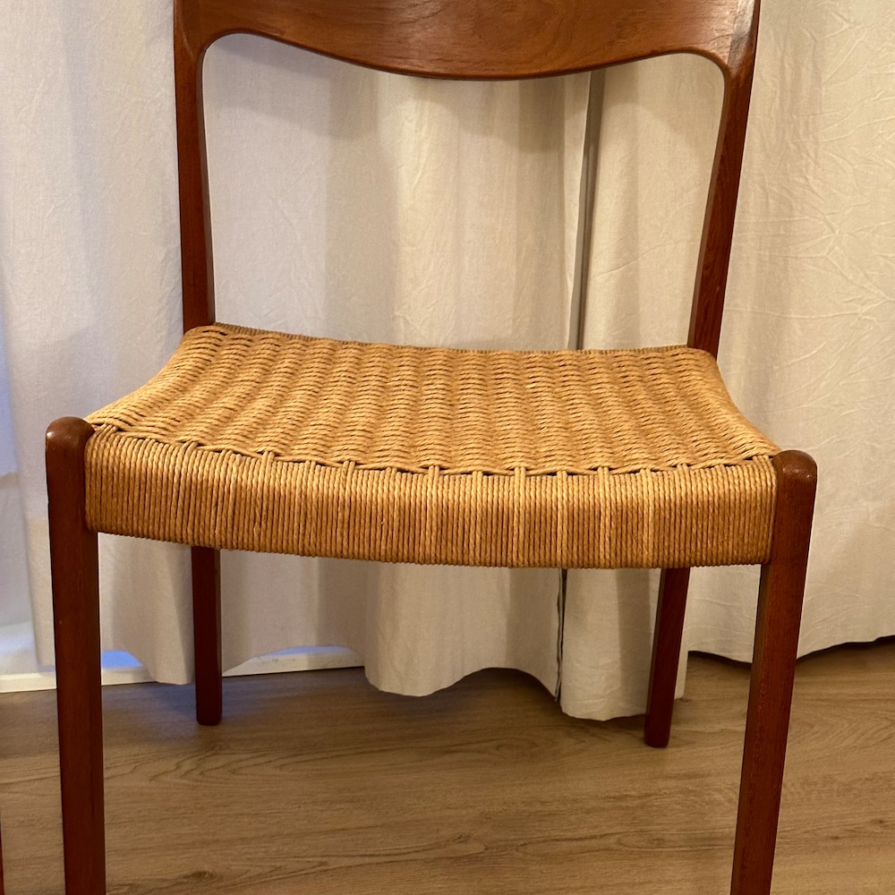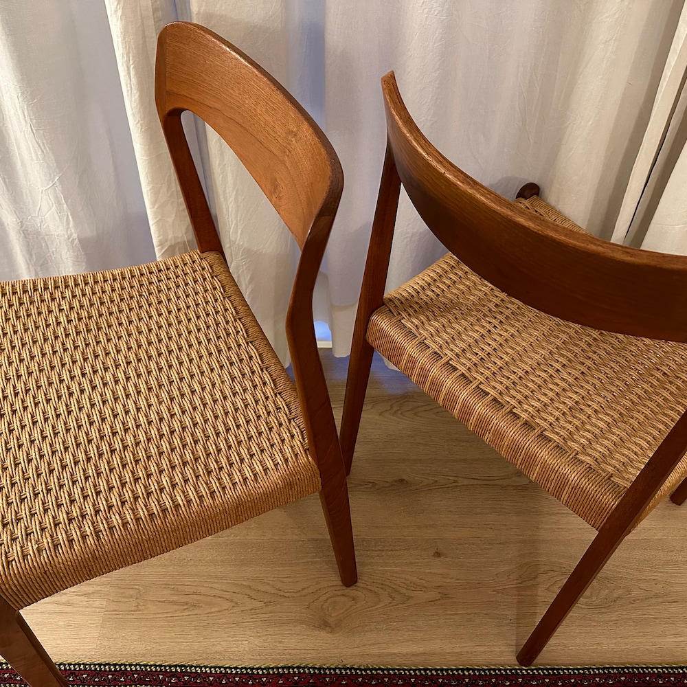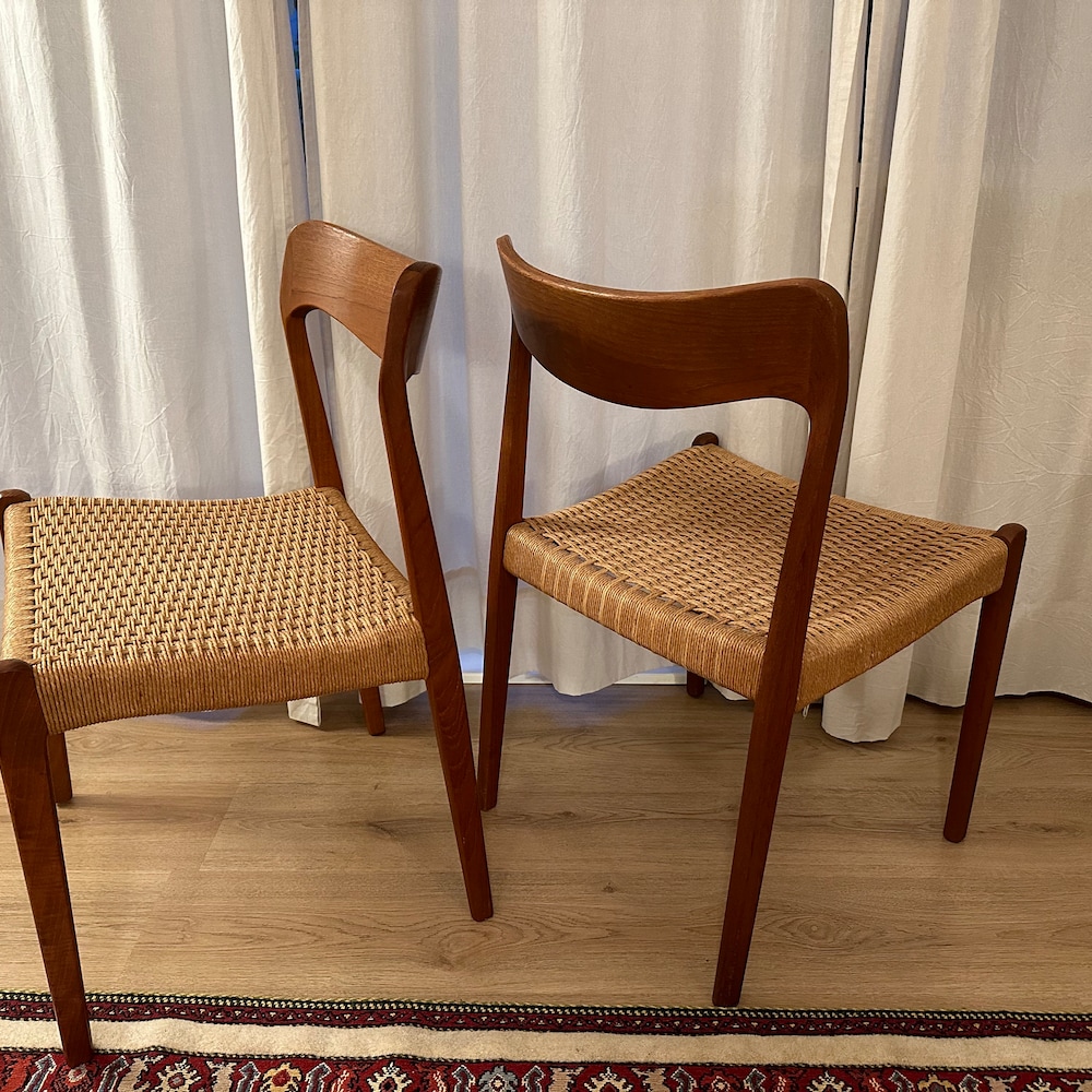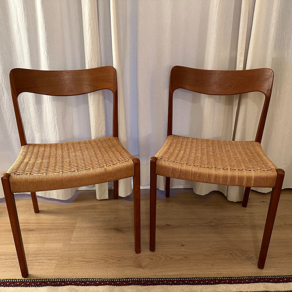 The price is for each item!2 chairs are available. A set of beautiful chairs designed and made in Denmark. Warm, dark-colored teak tone. Wonderfully curved, very comfortable backrest.Seat made of braided cord/paper cord.The chairs are in good and well-kept condition. Minor signs of wear (e.g. minor stains in the cord weave) ********************************************************** Materials Teak wood […]