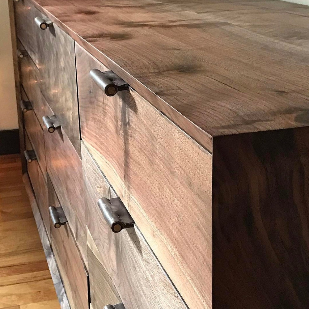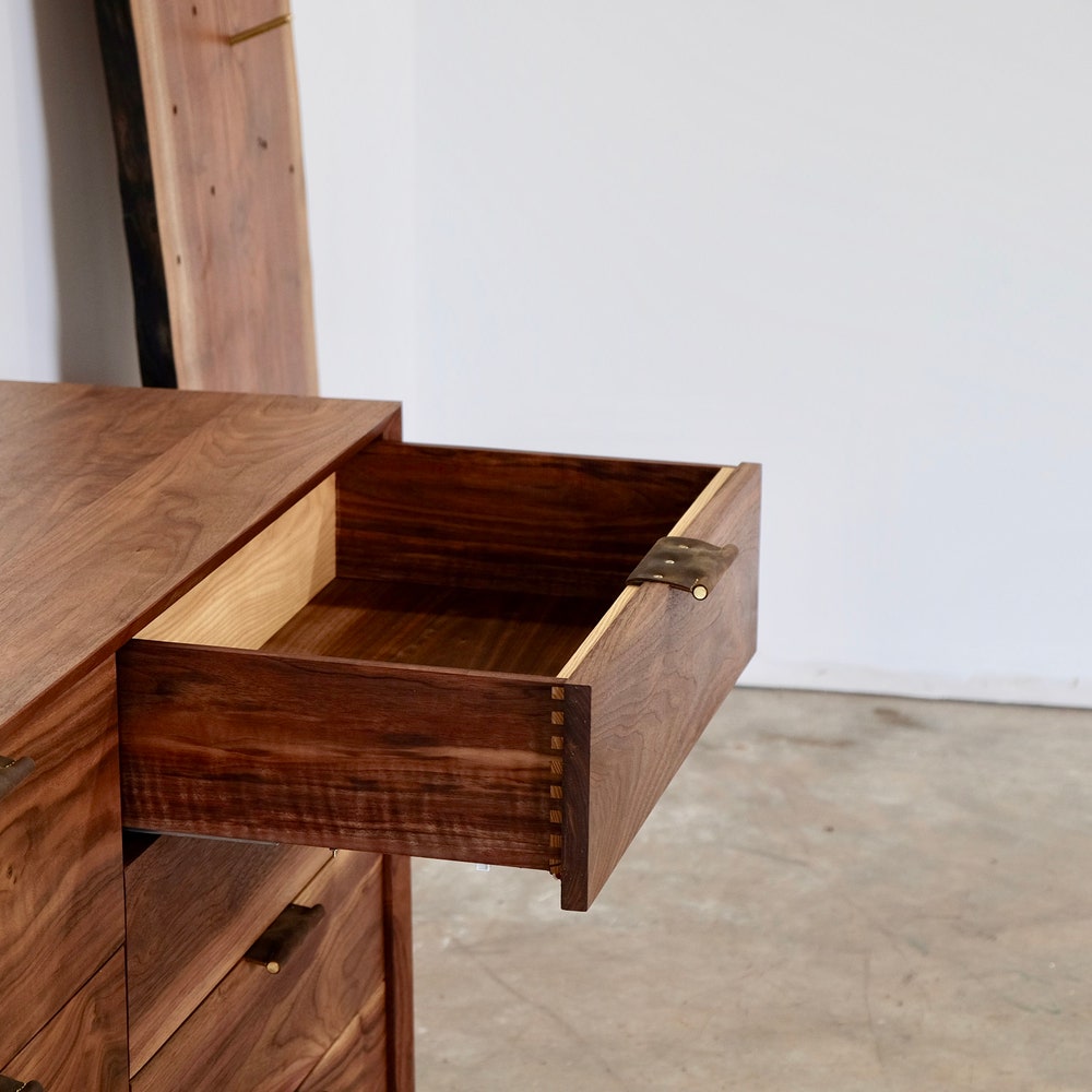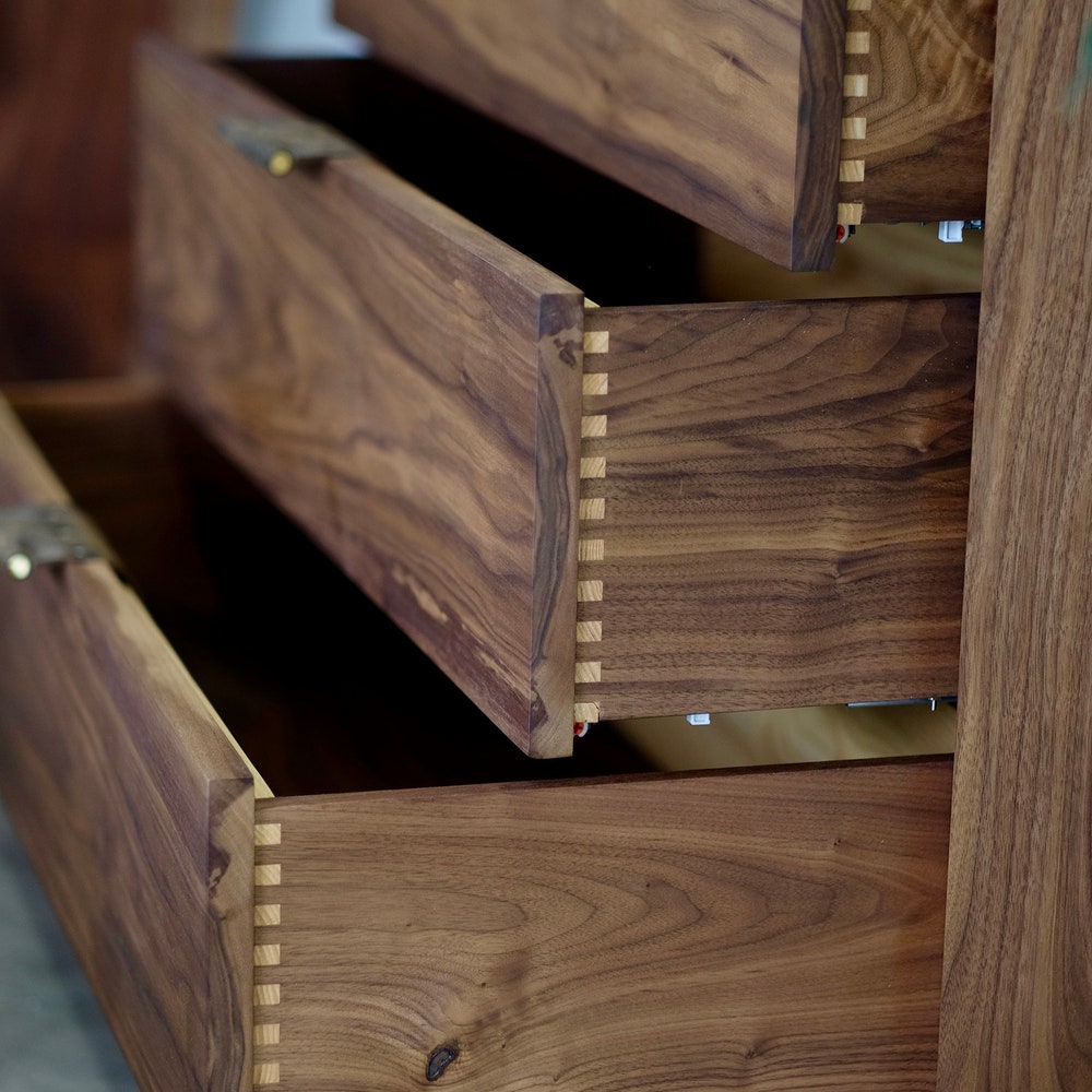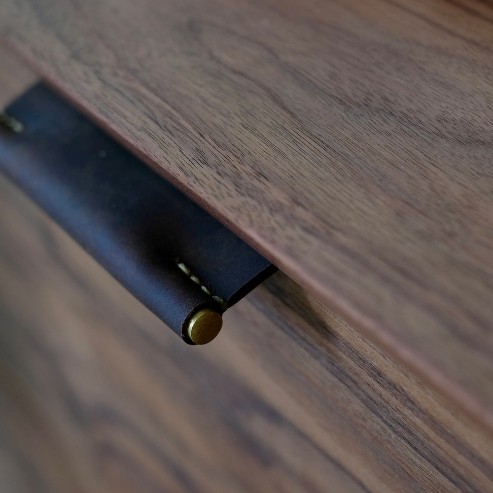 This dresser is made from all solid claro walnut. The case is solid walnut mitered on all four corners to give a seamless and smooth look. The front features a 30 degree bevel leading into the inset drawers. The bevel, albeit subtle, highlights the drawer fronts themselves. The slight offset in size is another subtle, yet interesting, design consideration. The pulls are made locally of genuine leather with a solid brass rod stitched in. The drawer boxes themselves are solid walnut and finger jointed for an interesting look even when the drawers are open. The hardware is under-mounted soft close hardware.