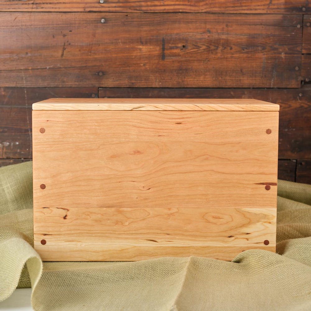 Our largest crate yet! Made in the USA, this 18″ x 12″ x 12″ crate with lid offers more storage space along with the classic good looks of solid cherry wood. It’s strong enough for children to sit on and the bottom is thick enough to add wheels. It ships unassembled and requires a Phillips screwdriver and a hammer or mallet to assemble. Just line up the pre-drilled holes, insert the provided screws and tighten. We also include the wood plugs to cover up the screw holes for a clean and finished look!