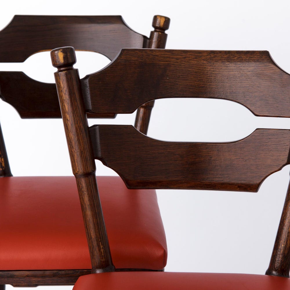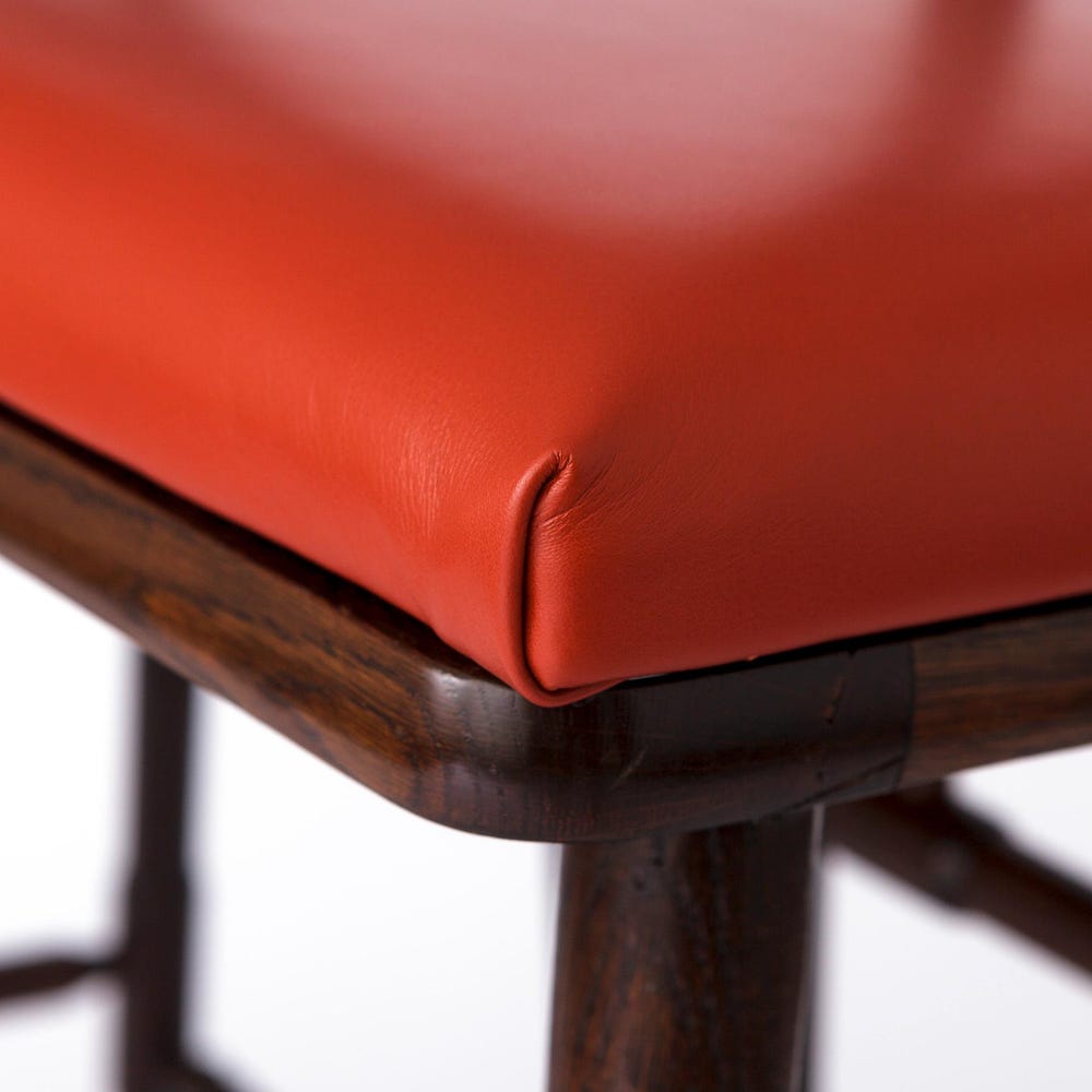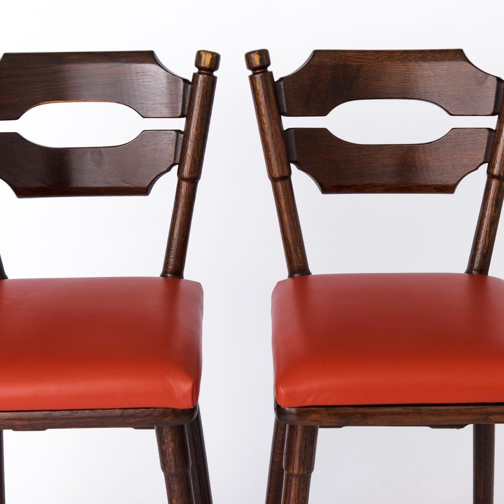 Luxurious Upholstery: The seats are reupholstered with genuine red-orange leather, creating a bold and vibrant contrast that will add a pop of color to any space.
