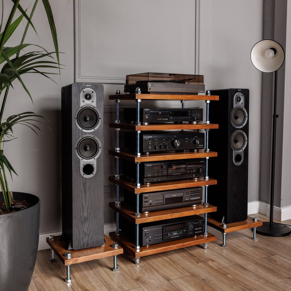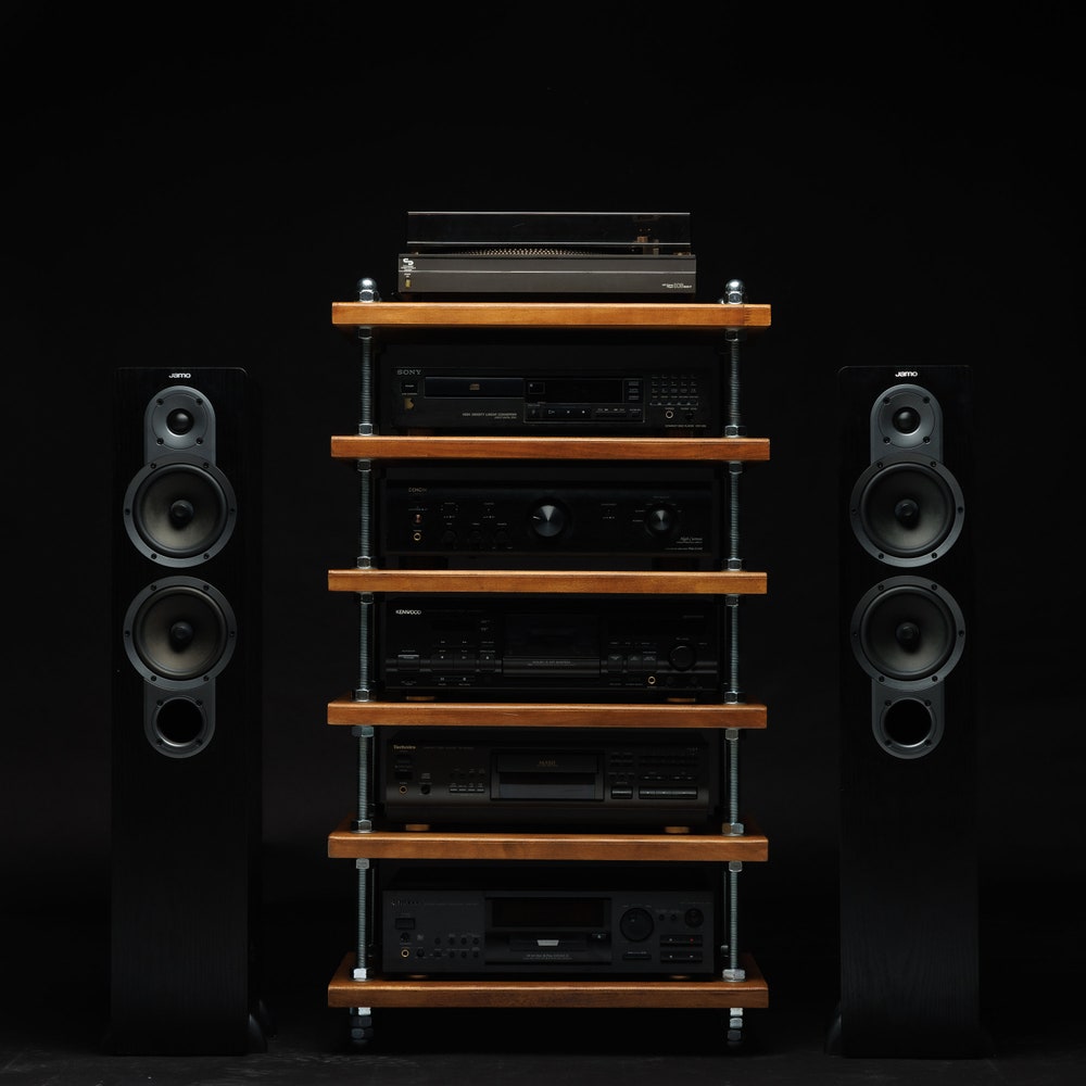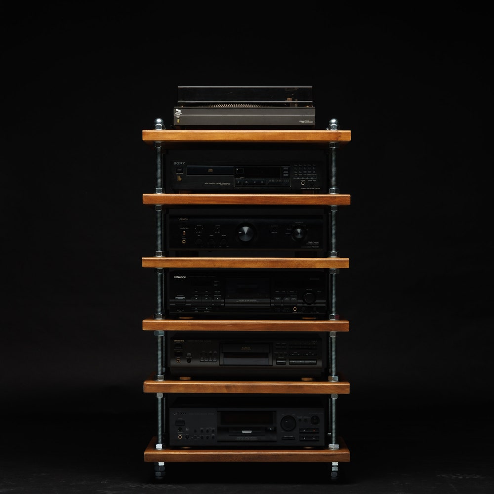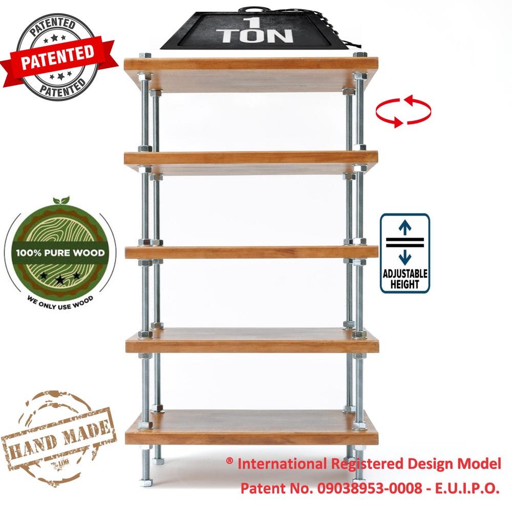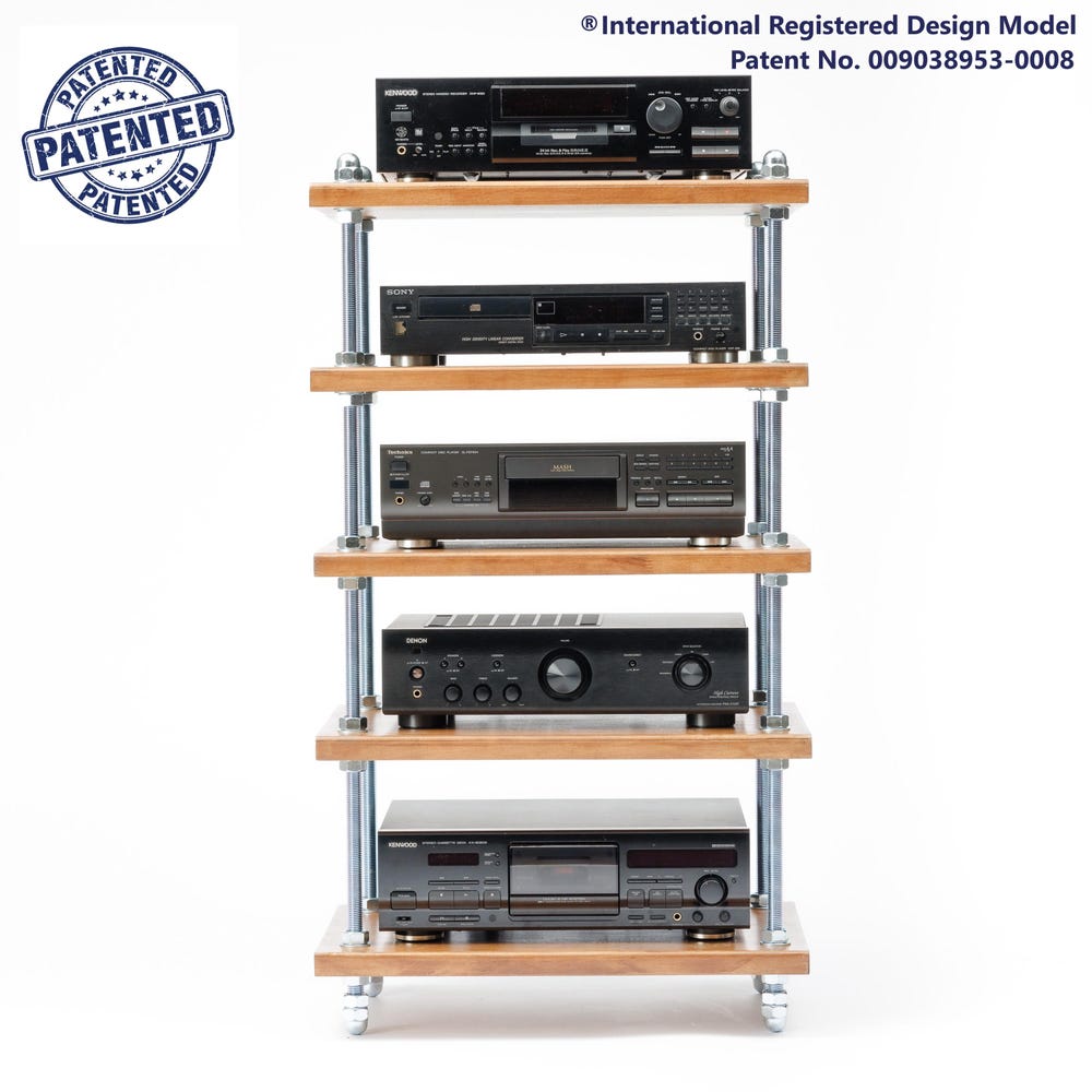 2 IN 1 Registered design stand, 5 Tier Oak Black rods stand, audio rack / Record player stand / Turntable stand / Threaded rod shelf