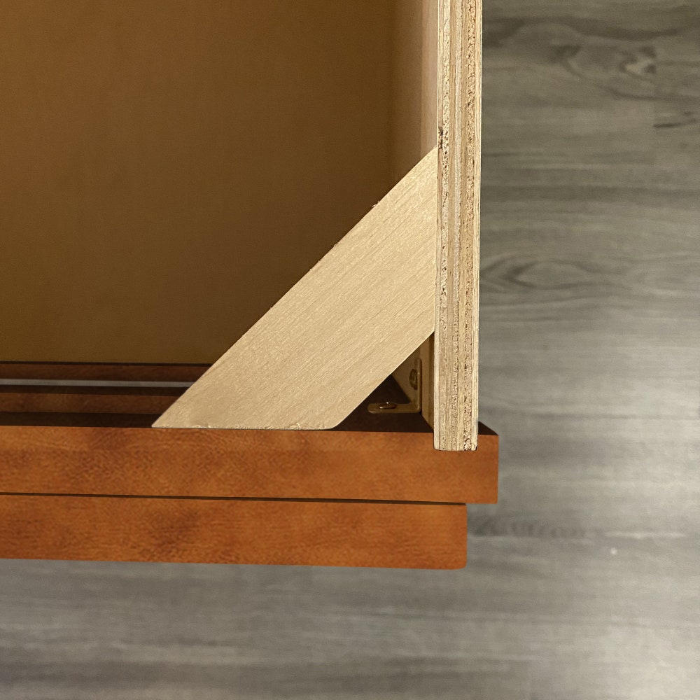 Since our boxes are made of all hardwood construction, we don’t use i-beams or braces in the middle of our face frames. This way when you open the doors there is nothing to obstruct you and storing items in your vanity couldn’t be any easier.