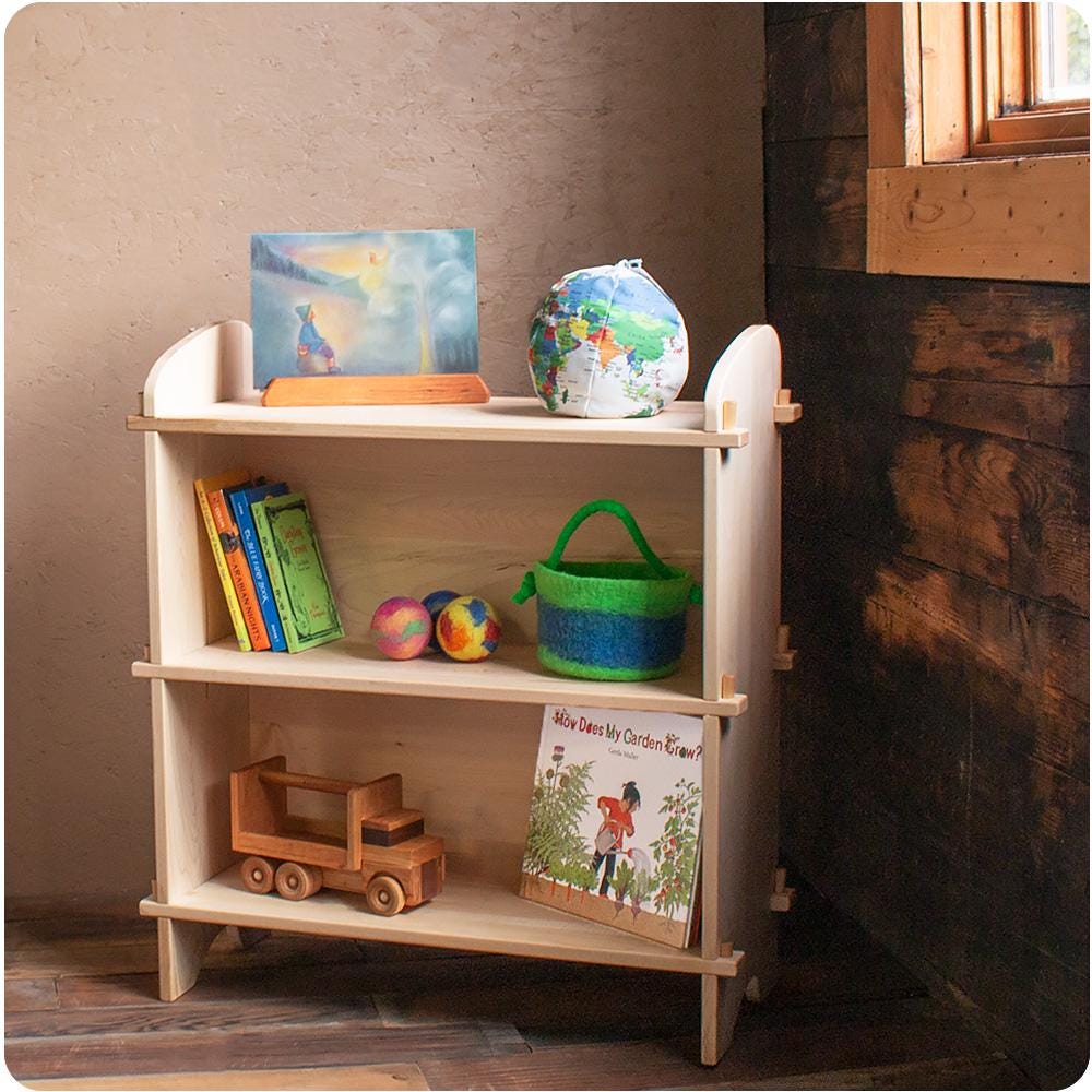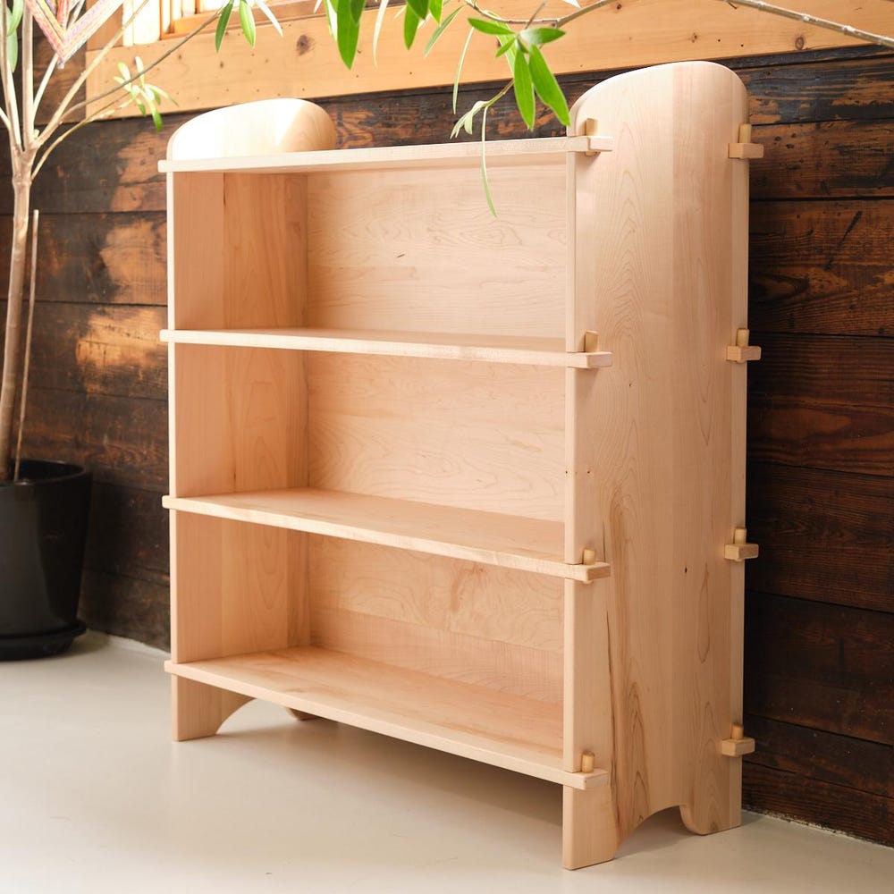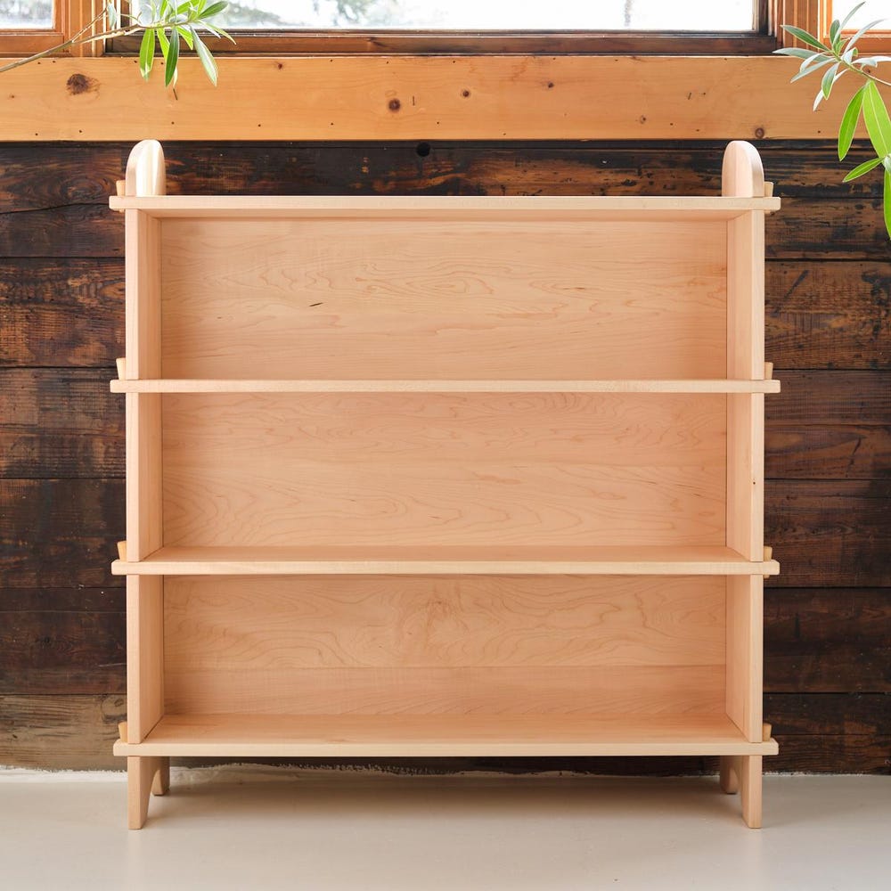 Our solid maple wood (no MDF/particle board/plywood) bookcases are both beautiful and functional. Each shelf has a solid wood backing that slides in so items will not fall out the backside and the the beautiful maple wood and versatile style blends with any décor. Store books, media, and toys and display pottery, plants, framed pictures, baskets, candles, etc. Truly a beautiful piece for any room.
