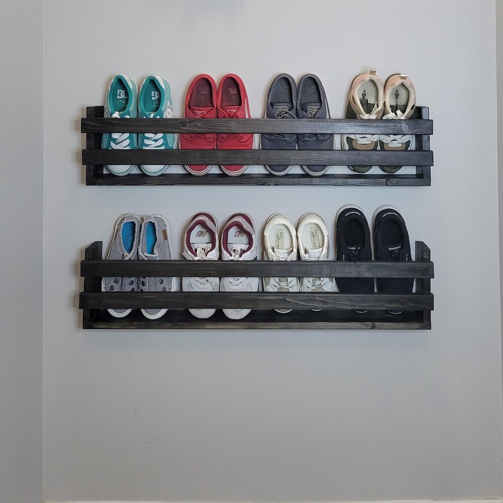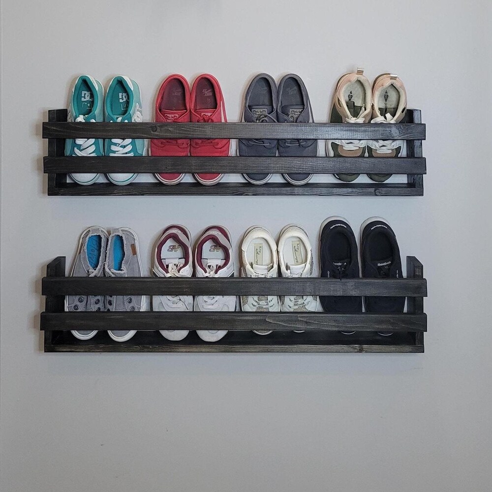2-Tier Wall Mounted Shoe Rack – Solid Wood Floating Shelf – Minimalist Entryway Organizer – Handmade Double Shoe Storage Shelf