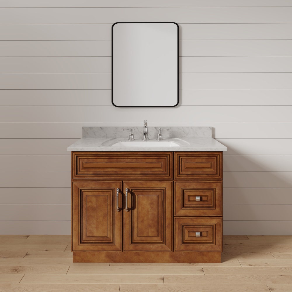 These Saddle Brown raised panel bathroom vanities are perfect for your bathroom remodel or new construction. We all know the brown stained doors are a classic look that is here to stay.