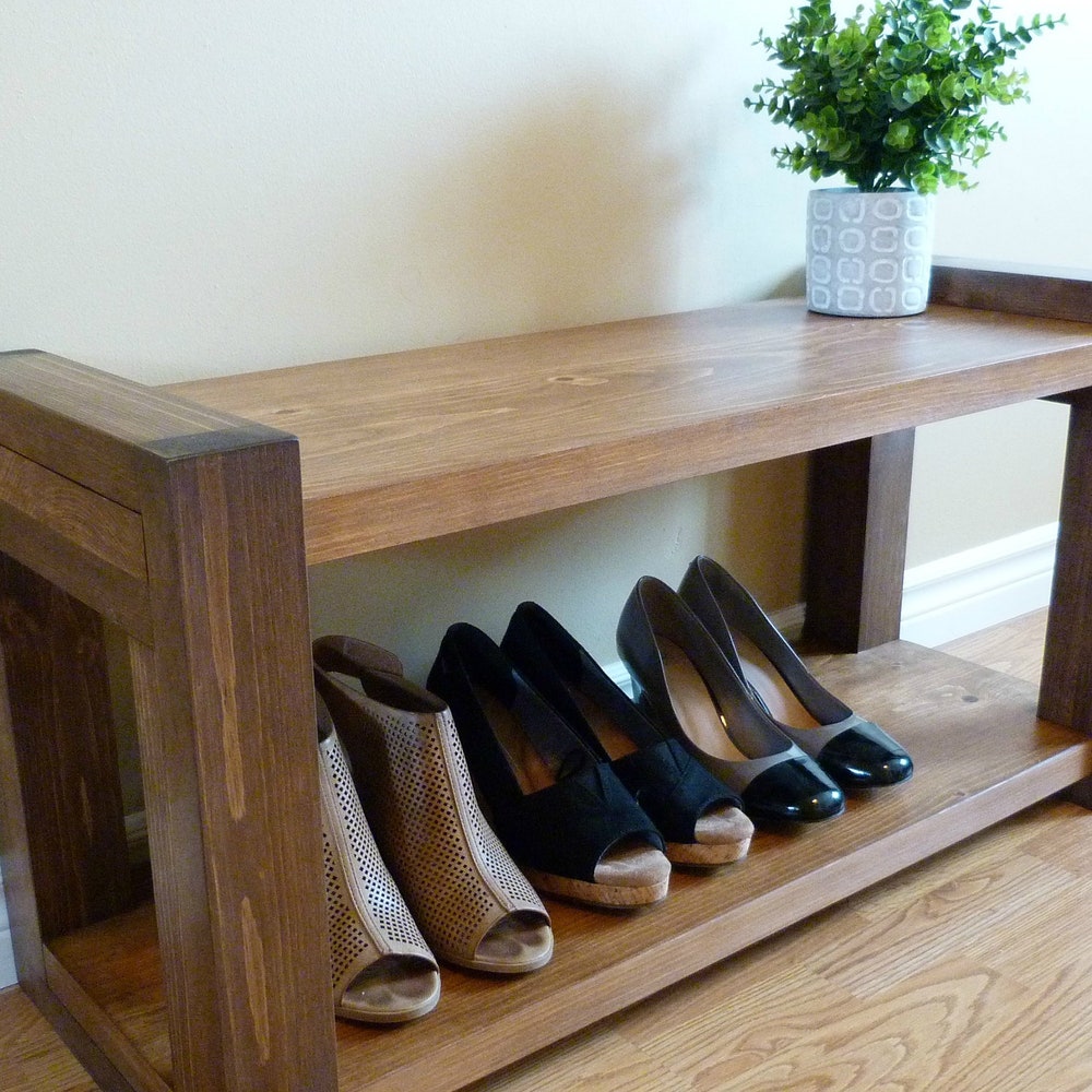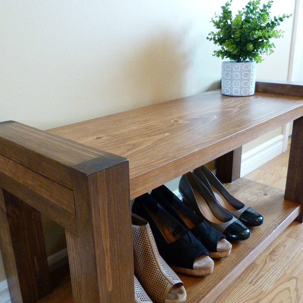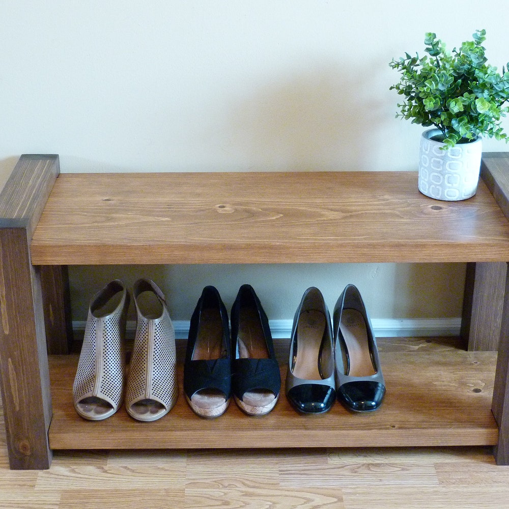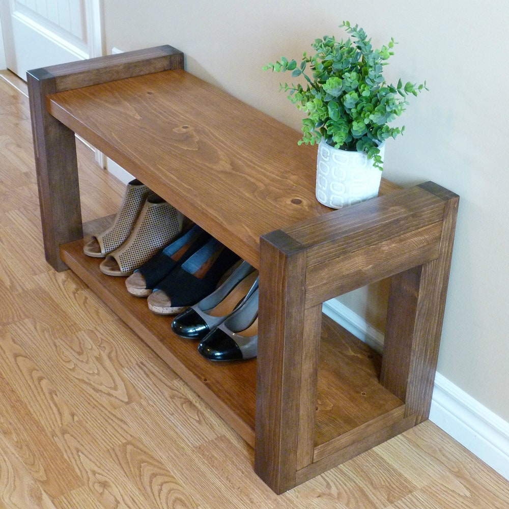 Made of solid pine, this sturdy modern and rustic style entryway shoe bench is perfect for any home, apartment or condo.
