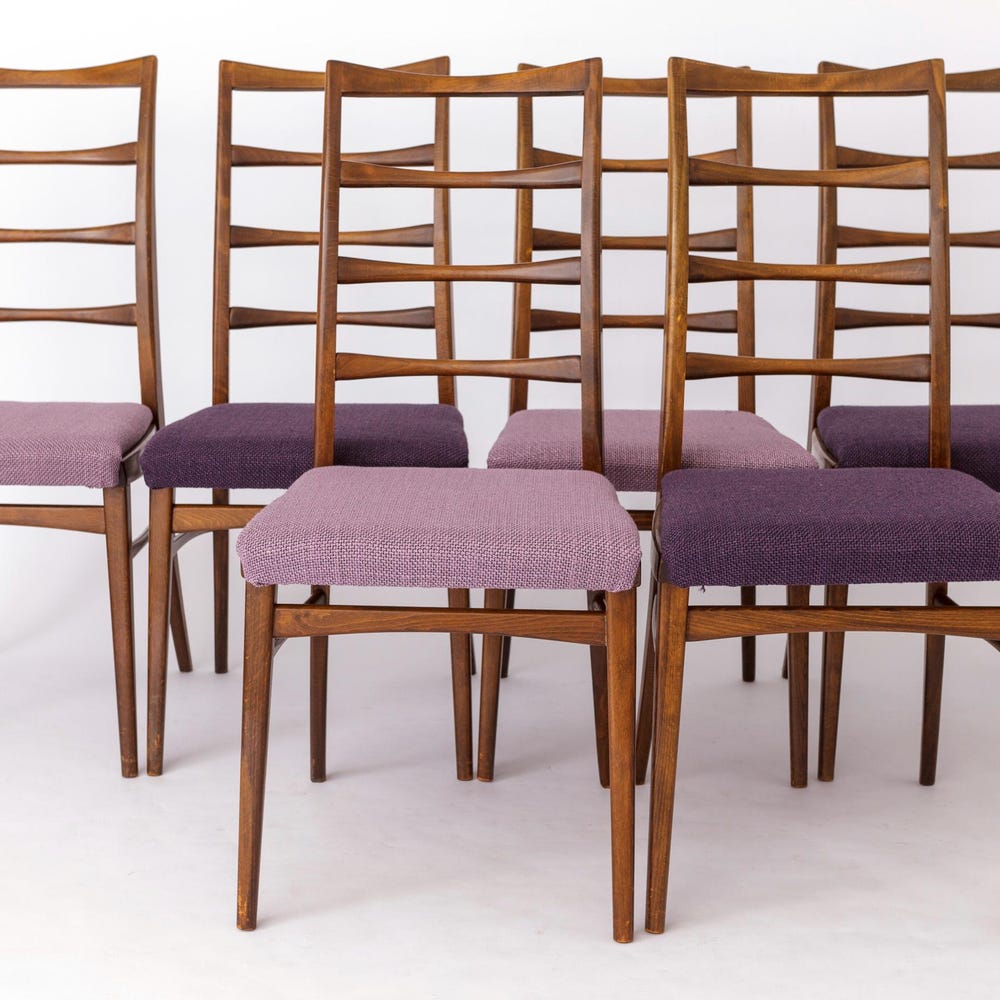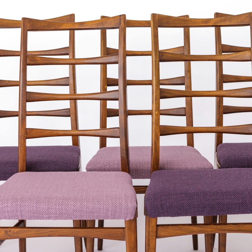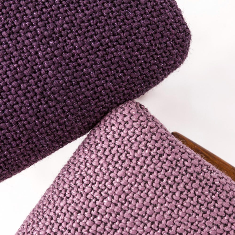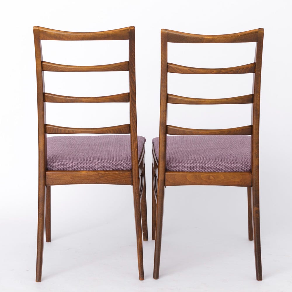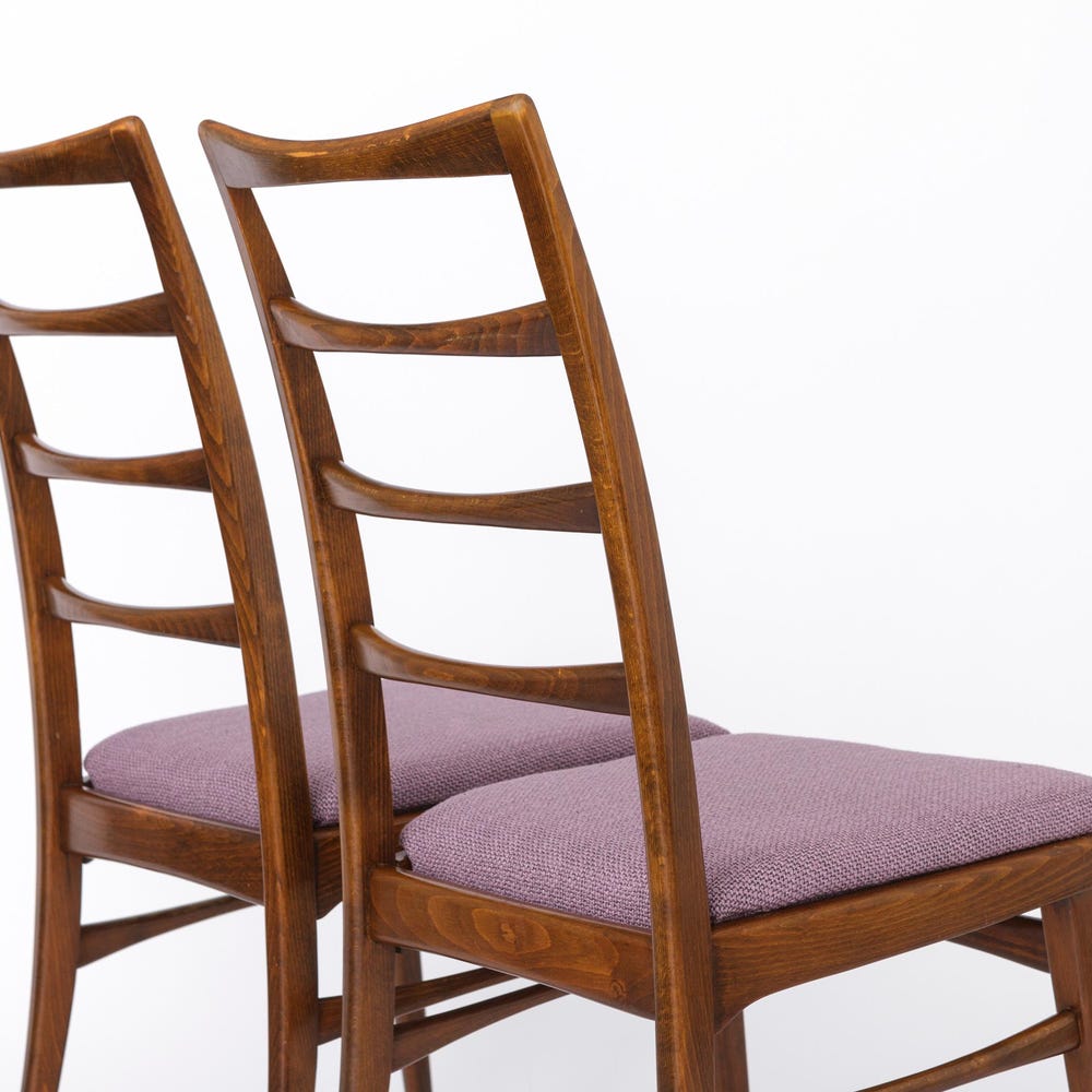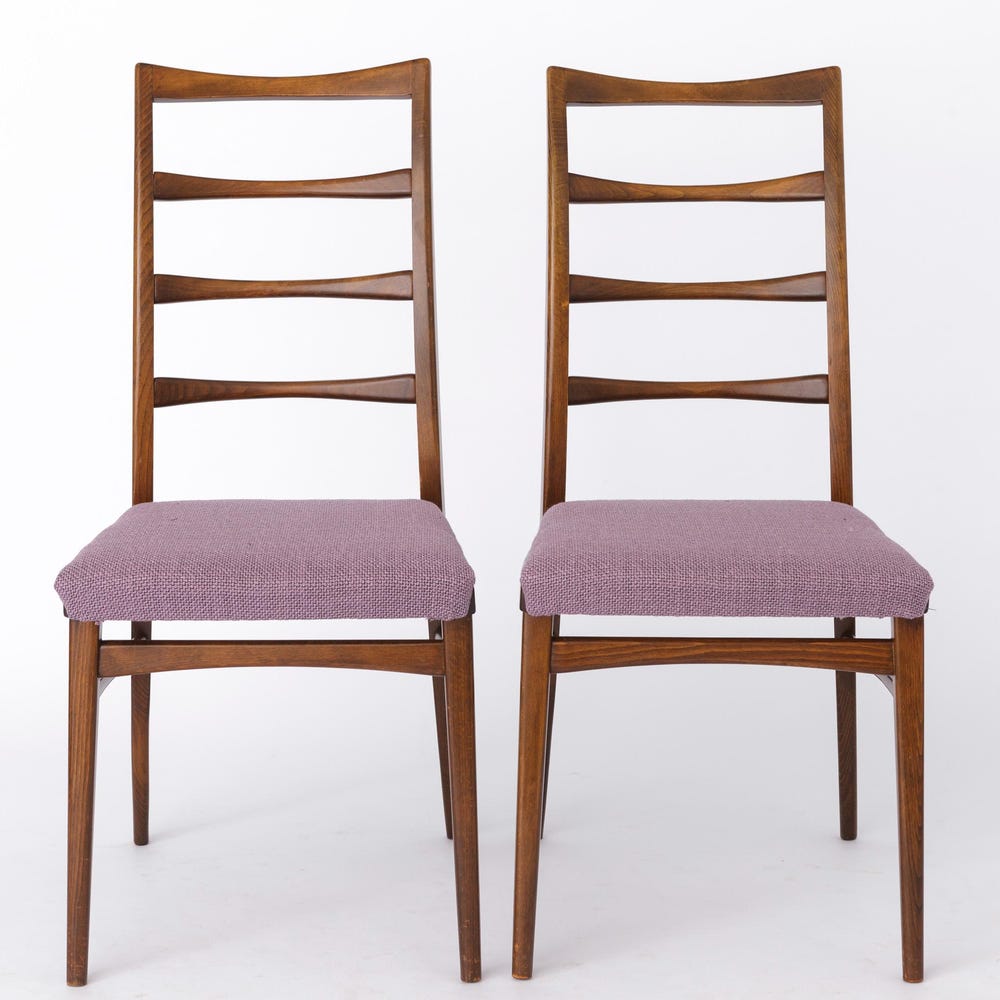 This elegant set of 4 chairs, dating back to the 1960s, features dyed beech wood frames and newly reupholstered seats in complementary light and dark purple tones. These chairs combine classic design with a modern touch, making them a great addition to any dining space.
