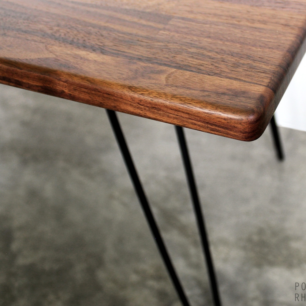 This design features folding steel hairpin legs which are powder coated in a satin charcoal for a sleek look and to help protect sensitive floors. Folding legs allows for easy storage in small living spaces if needed. The plates are already attached to the table, just insert the legs to assemble in 60 seconds. Once assembled they can be folded flat and stored without any further assembly required. The tabletop is 7/8″ (22mm) for a streamlined look and airy design. Details on finish and joinery below