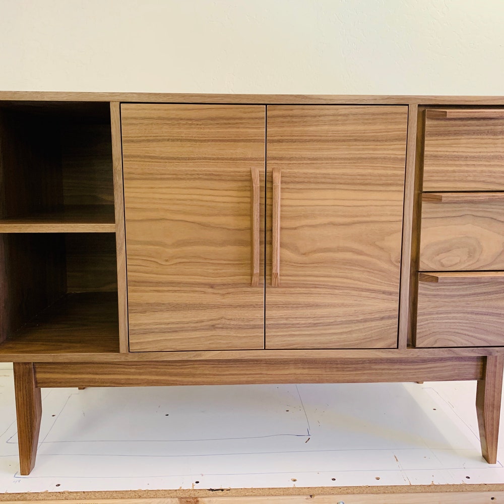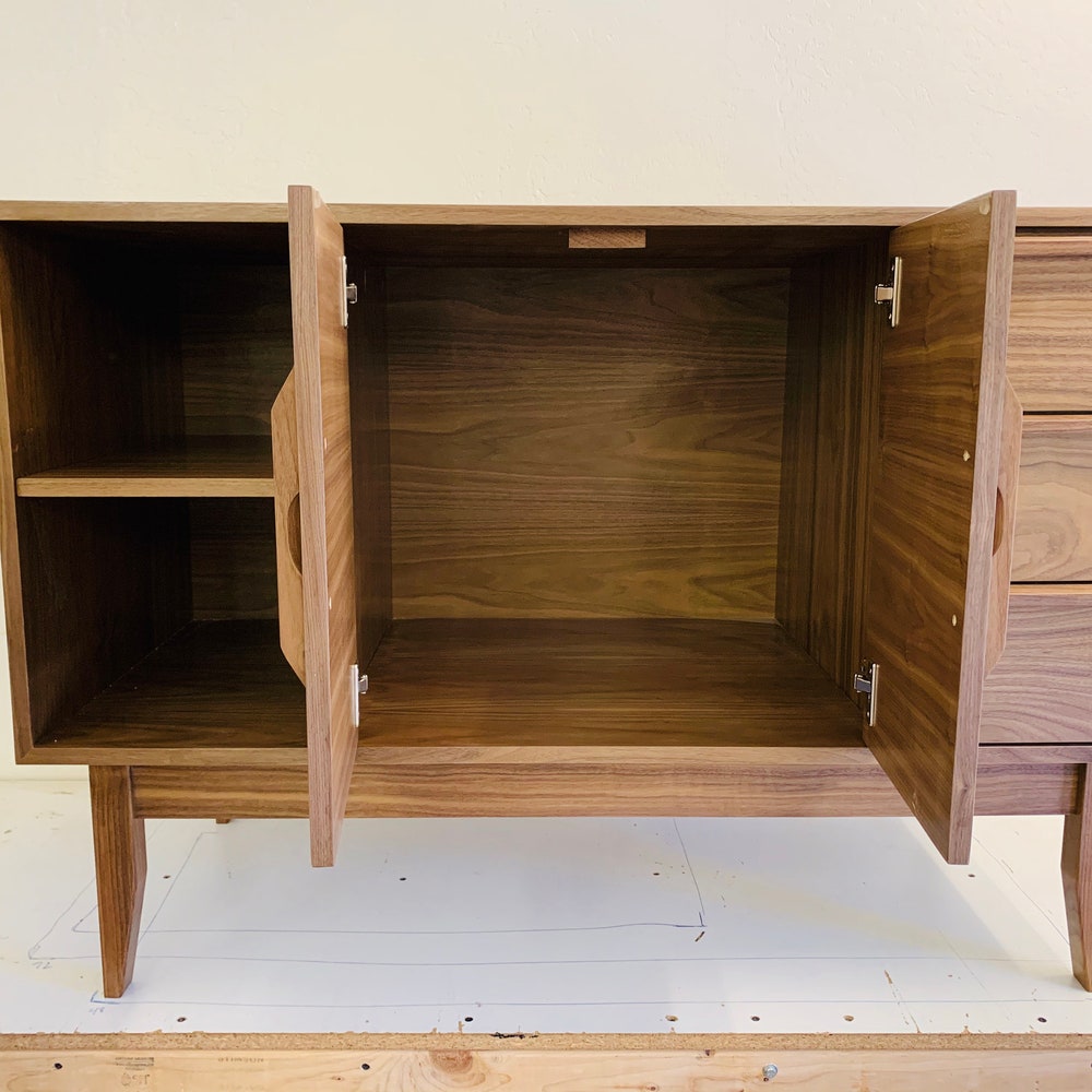 Made with a combination of top grade veneer and solid wood legs and handles. All surfaces are sealed with a clear satin finish. Snap close hinges are used on all doors and soft close drawer glides. Drawer boxes are made of Baltic birch wood and are dovetail jointed.