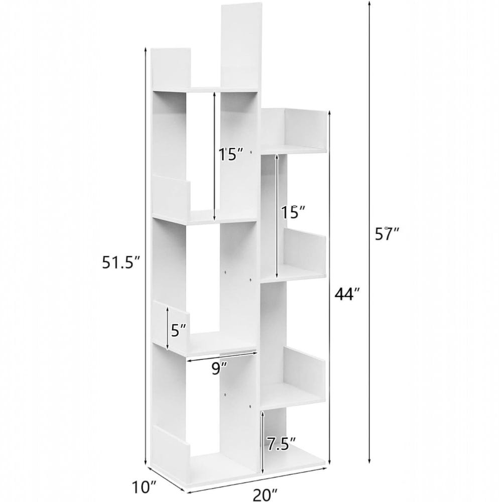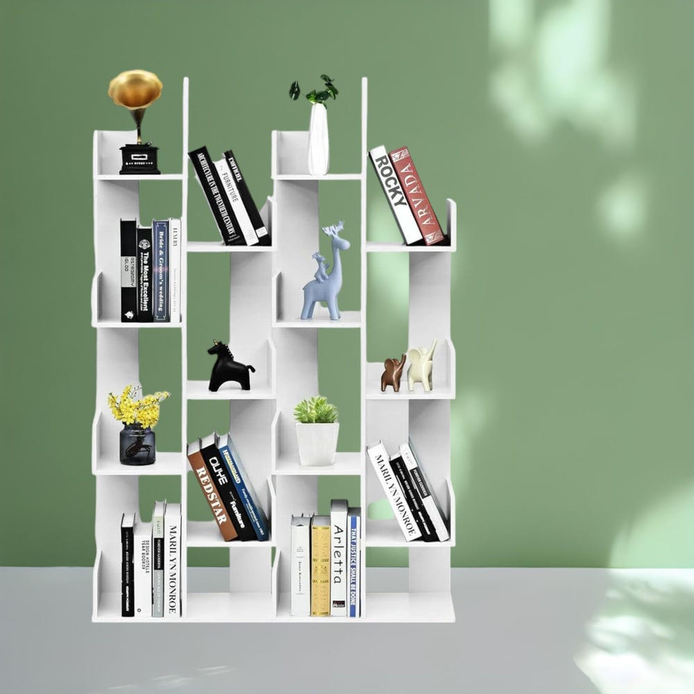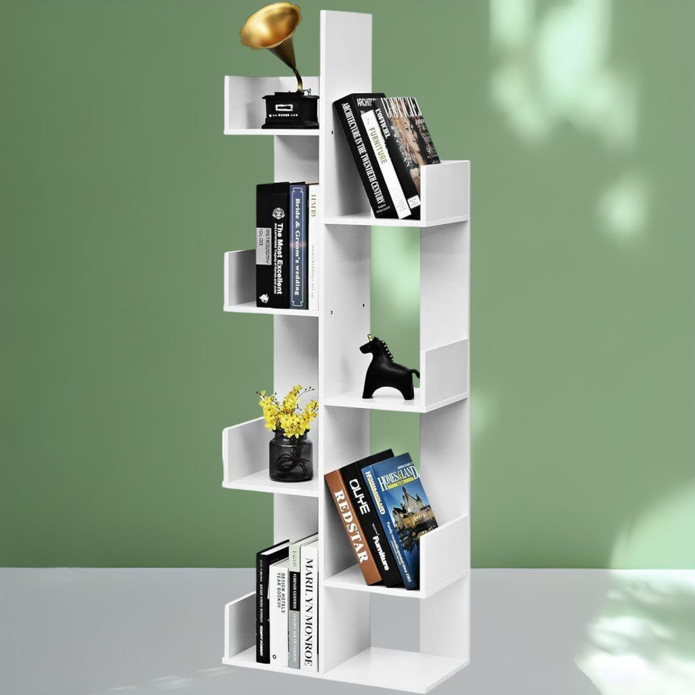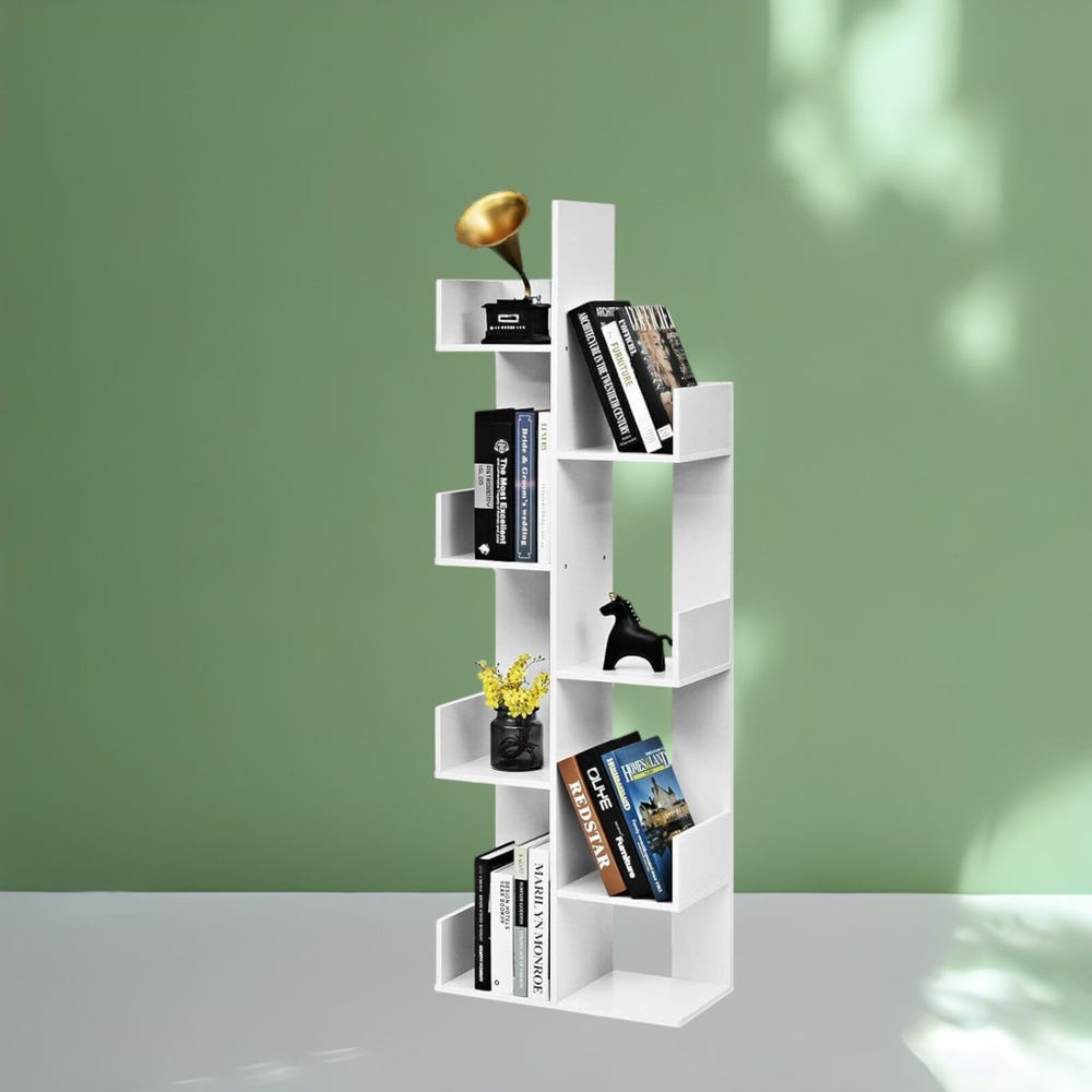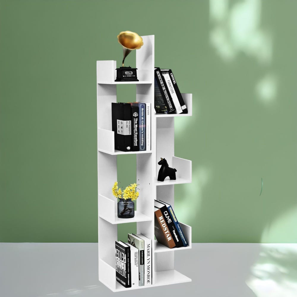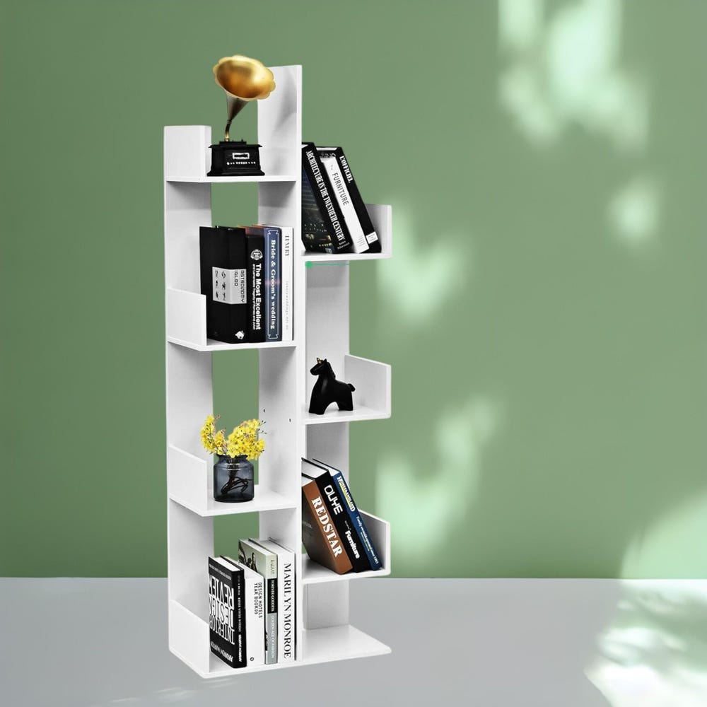 Maximize your space with this sleek and space-saving 5-tier tree bookshelf. Standing at 57 inches tall, this modern white bookcase is perfect for corners and compact areas in your home, providing 8 open compartments for all your books, décor, or collectibles. Whether it’s your living room, bedroom, or office, this shelf blends form and function beautifully.