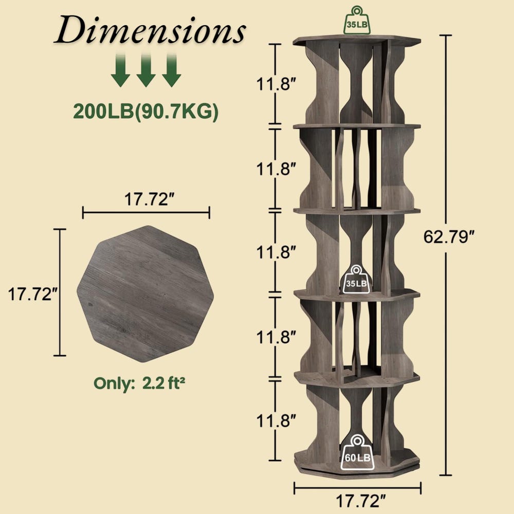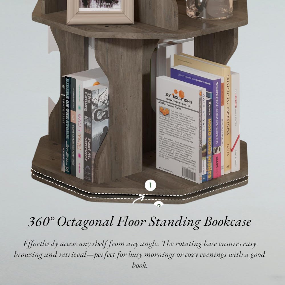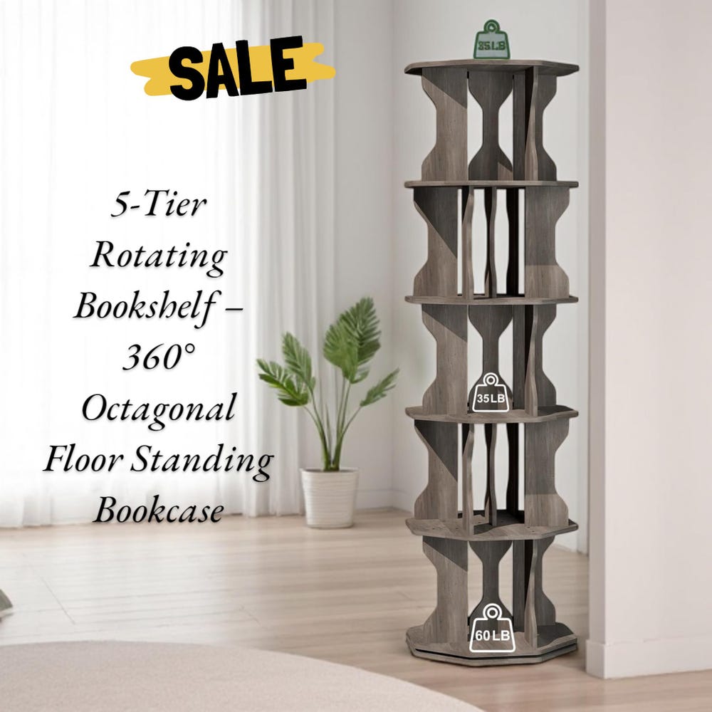5-Tier Rotating Bookshelf – 360° Octagonal Floor Standing Bookcase | Modern Space-Saving Revolving Display Shelf for Bedroom, Living Room, Office, or Study