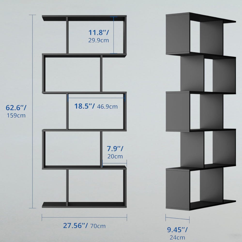 Set of 2 – 5-Tier S-Shaped Geometric Bookcases (Black, 62.6″ Tall) | Modern Room Divider & Display Shelves for Living Room, Office, Bedroom