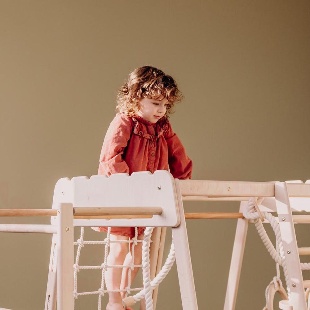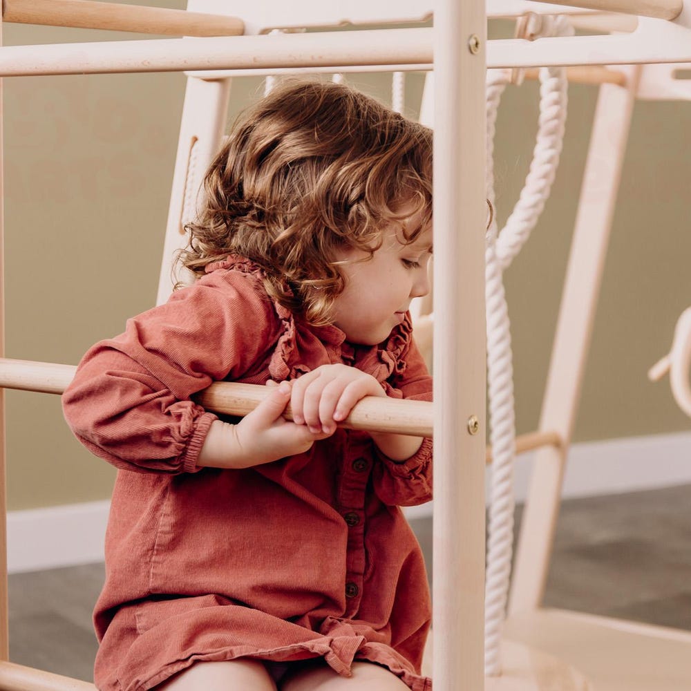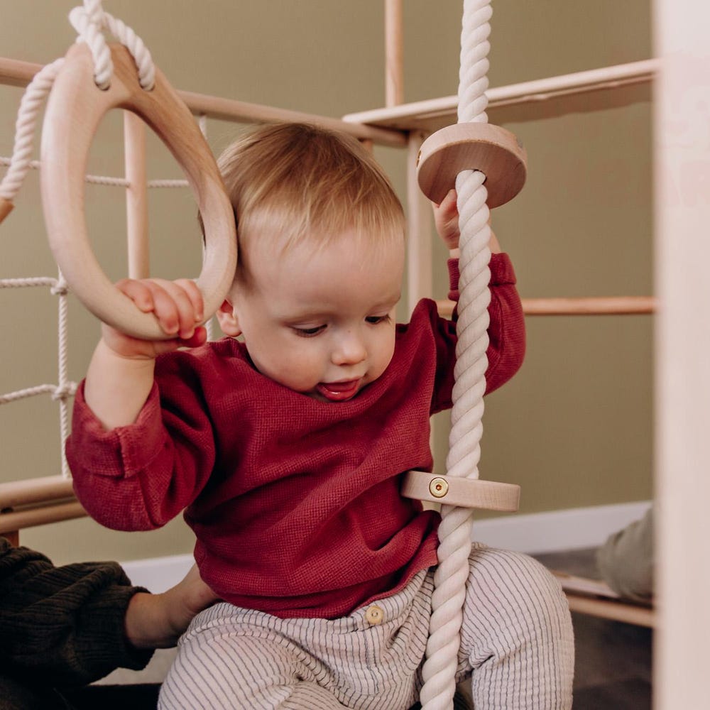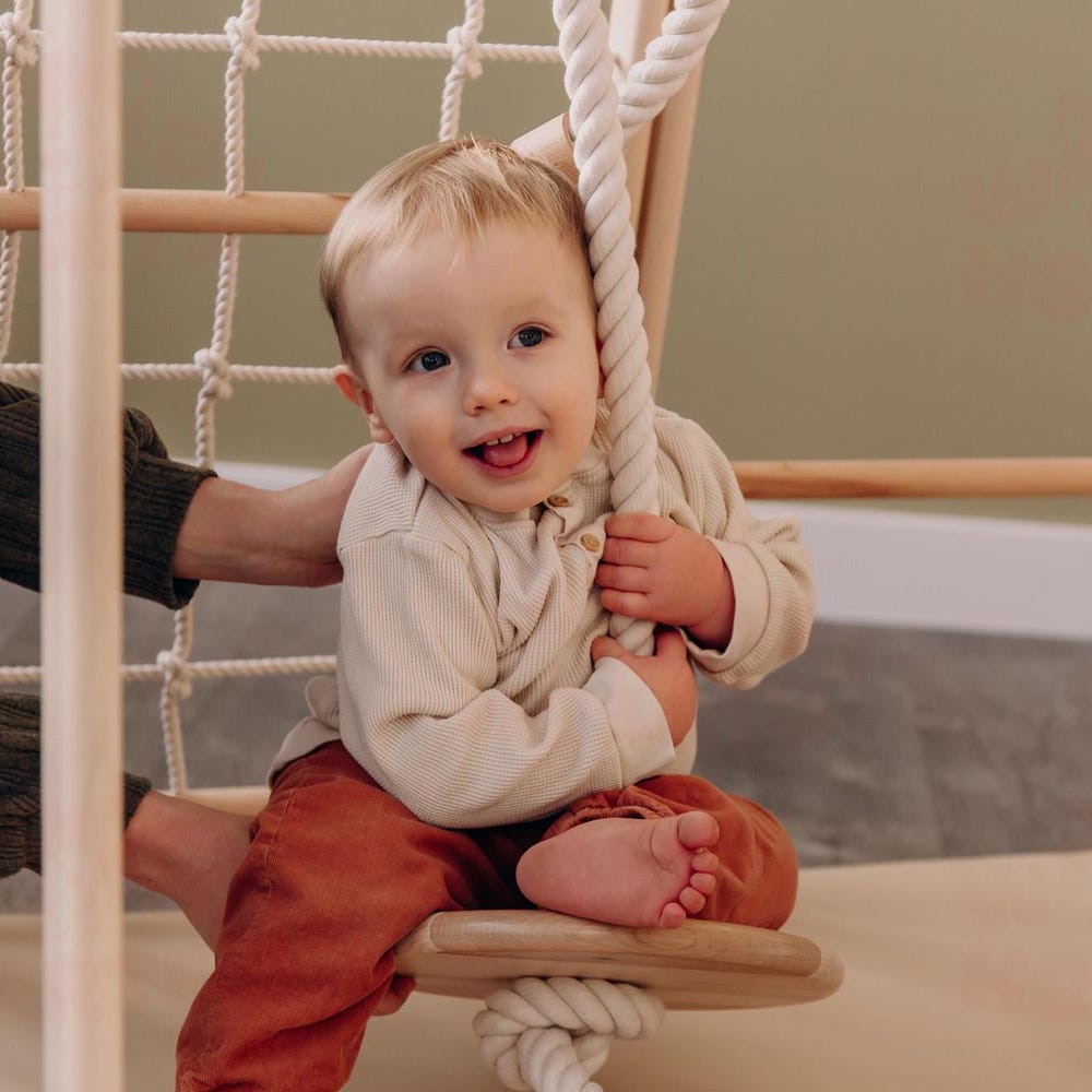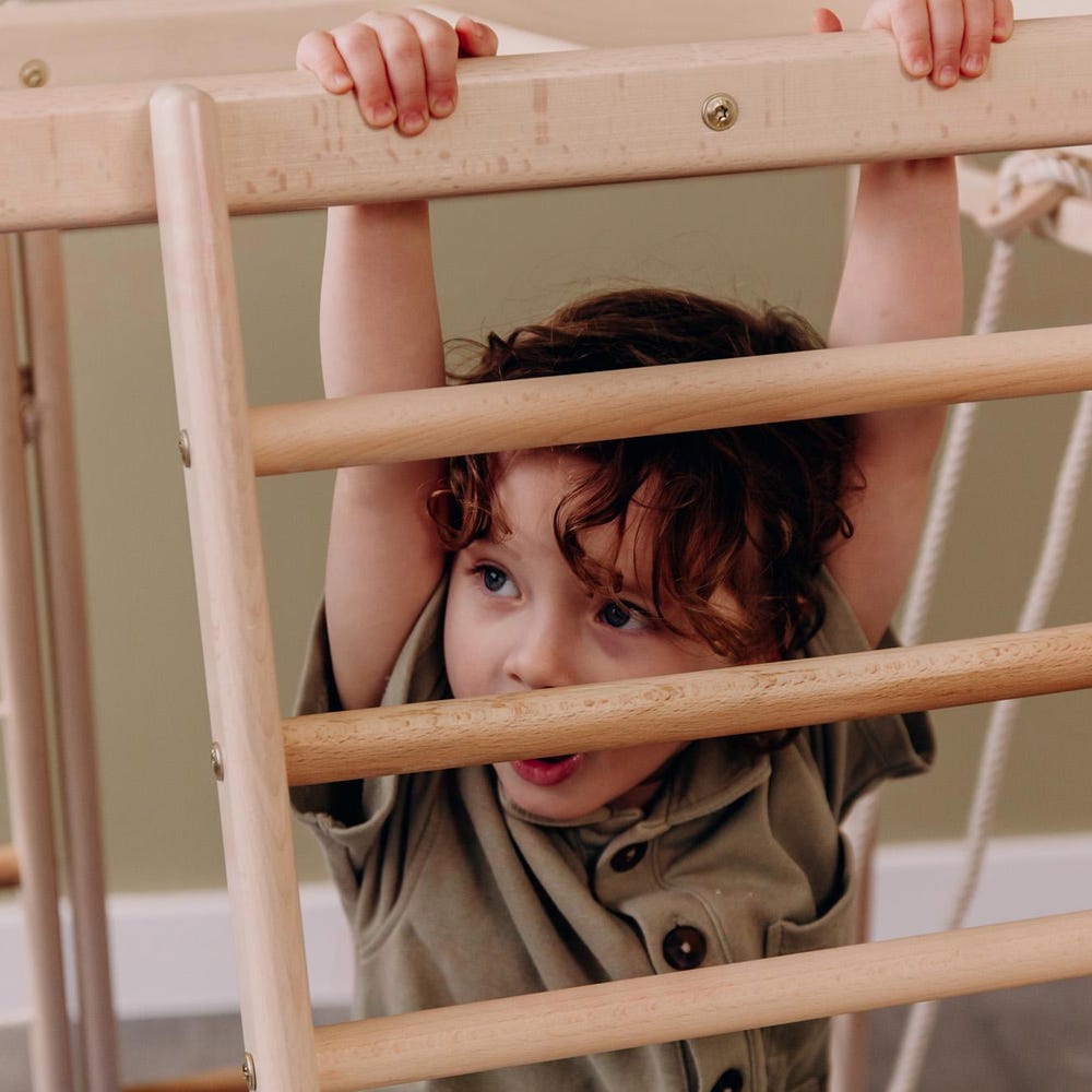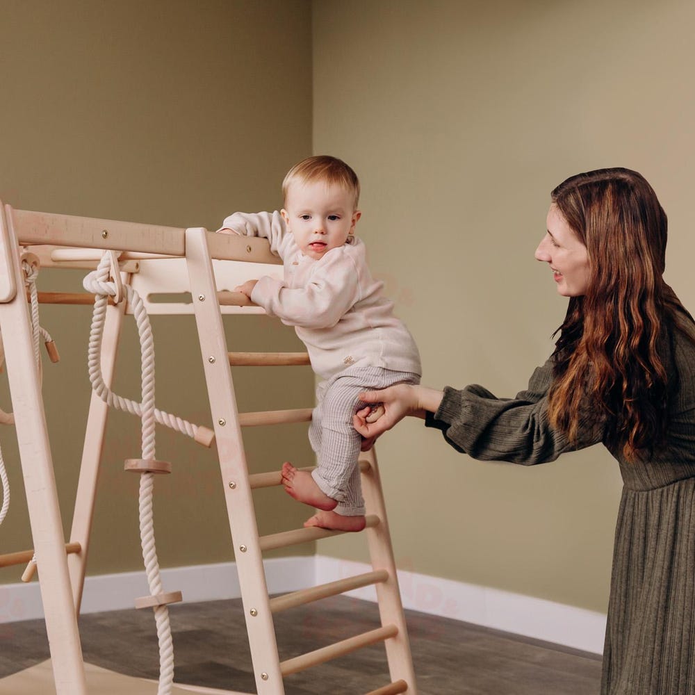 55х42″ Up to 4 Years Scandinavian Wooden Climbing Complex: Swedish Ladder, Climbing Rope, Monkey Bars, Gymnastic rings, Kids Swing, Play Mat