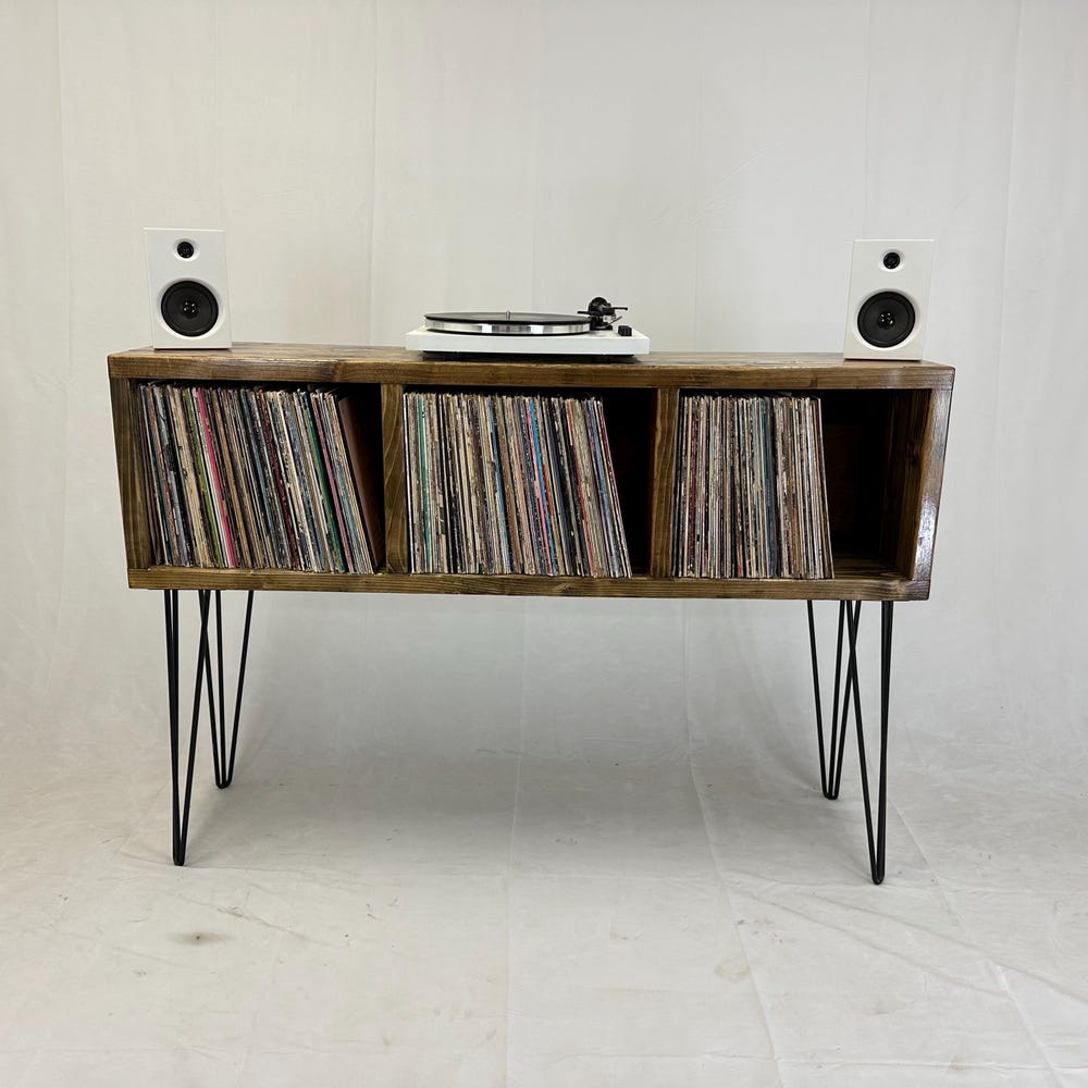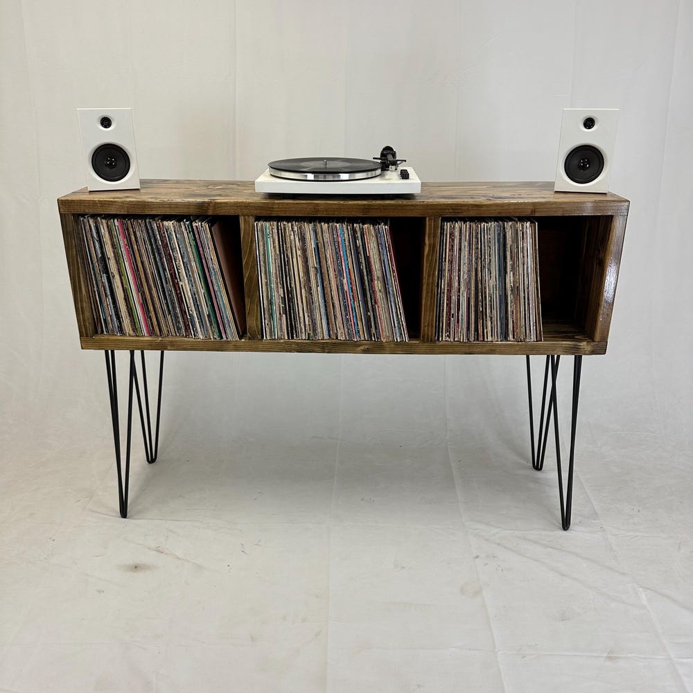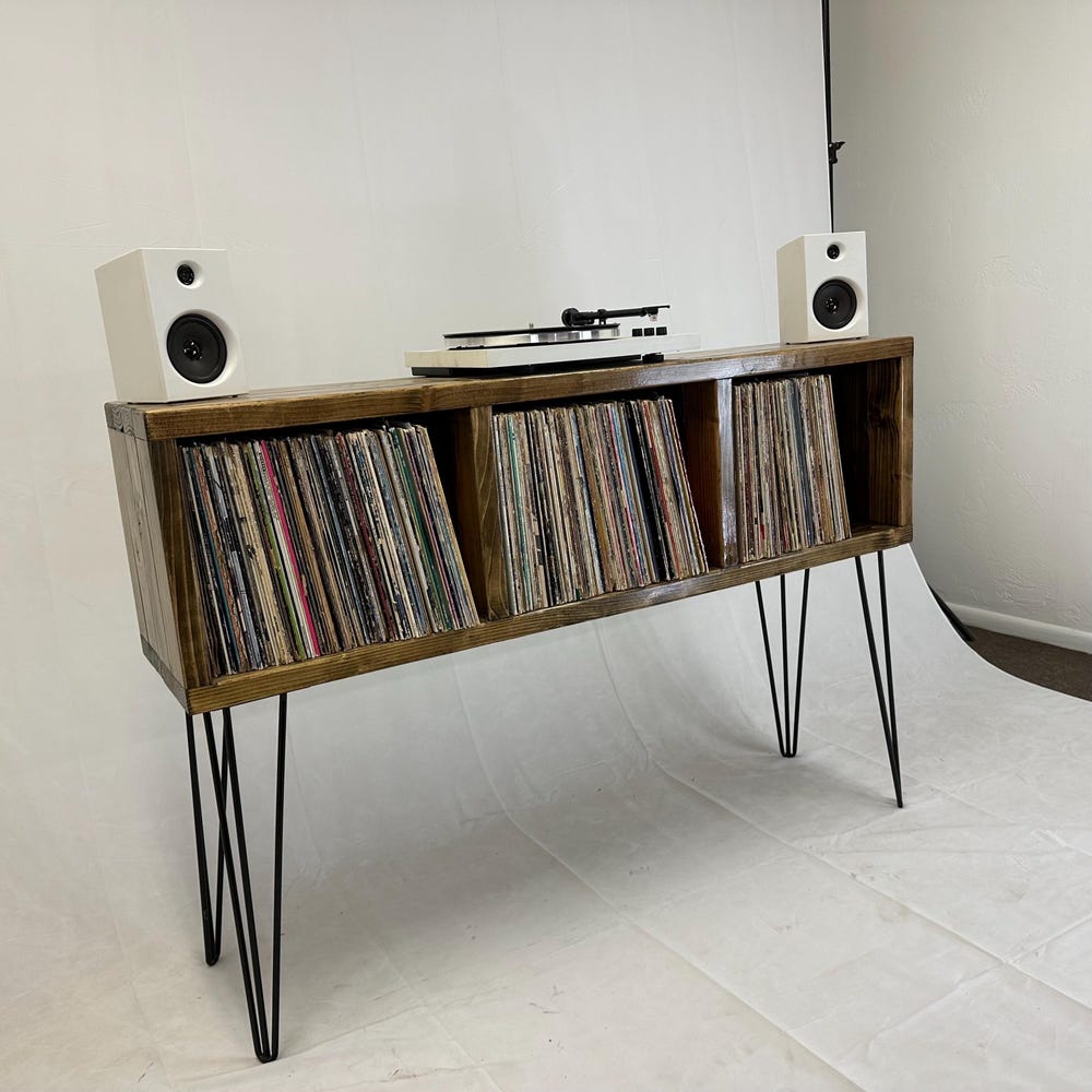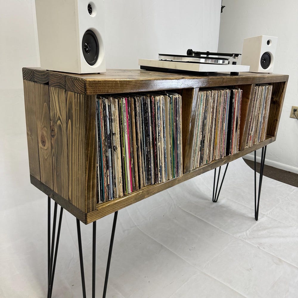 55 inch dark walnut record holder with 22” 3 rod hairpin legs. Ready to go, item as is no substitutions available