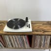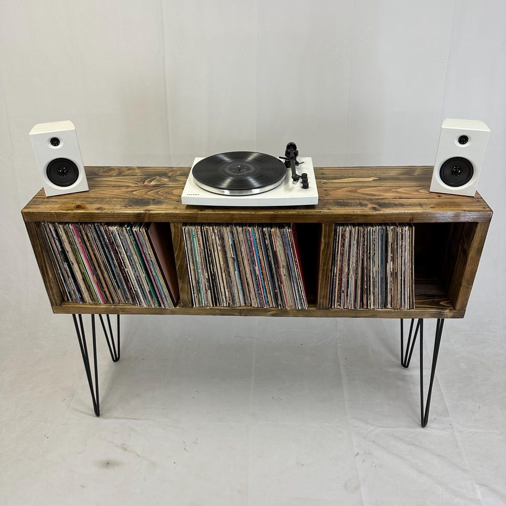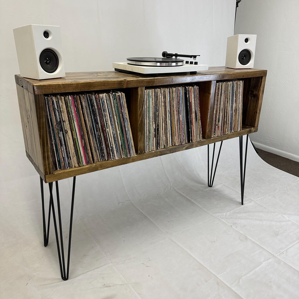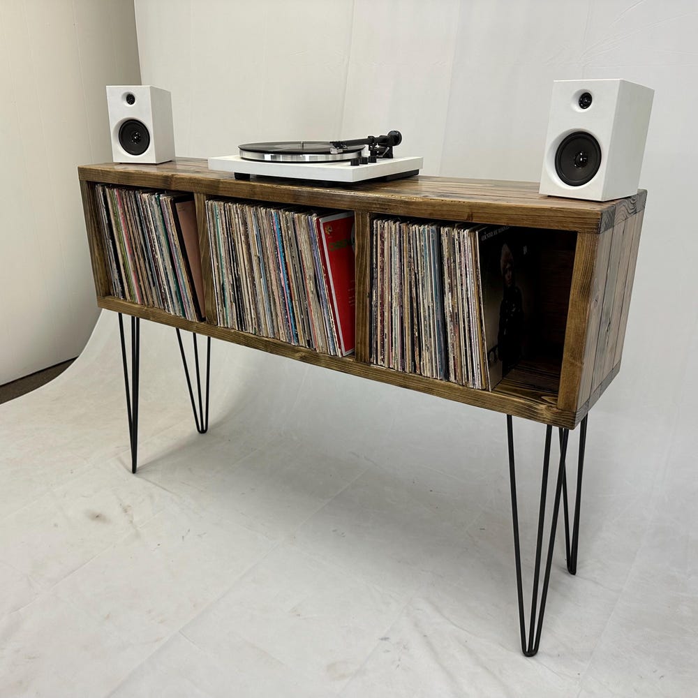 55 inch dark walnut record holder with 22” 3 rod hairpin legs. Ready to go, item as is no substitutions available