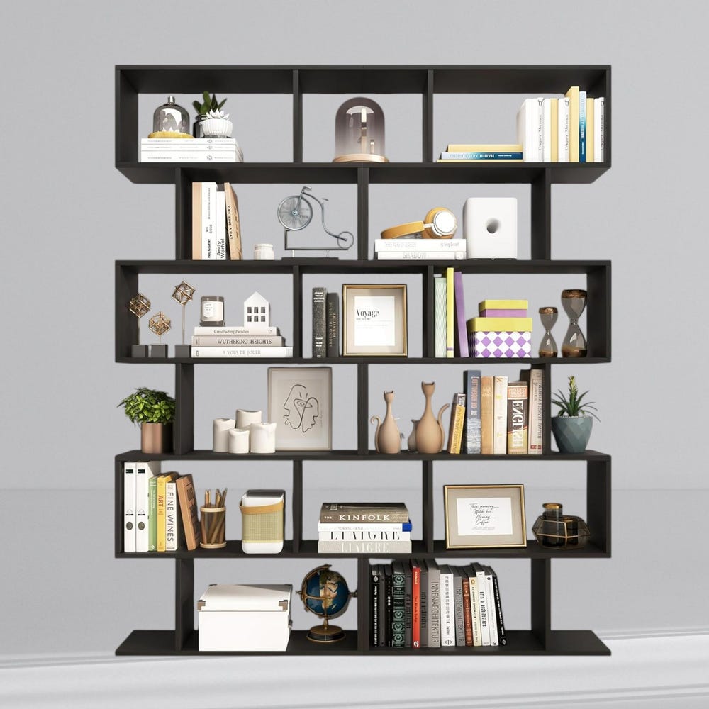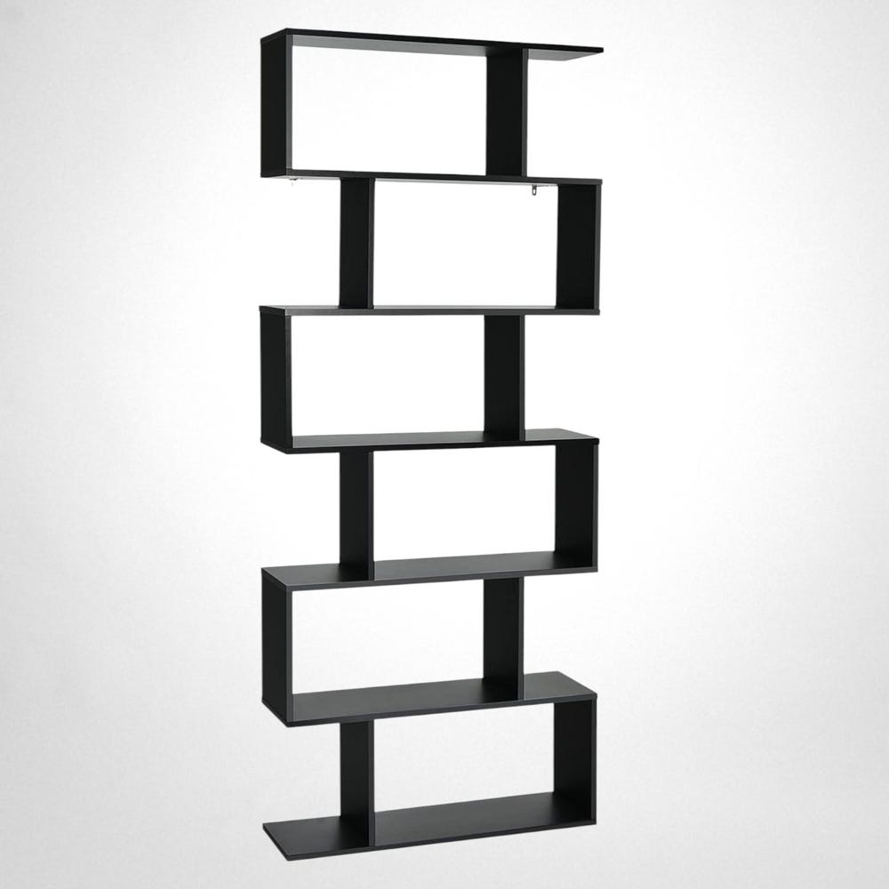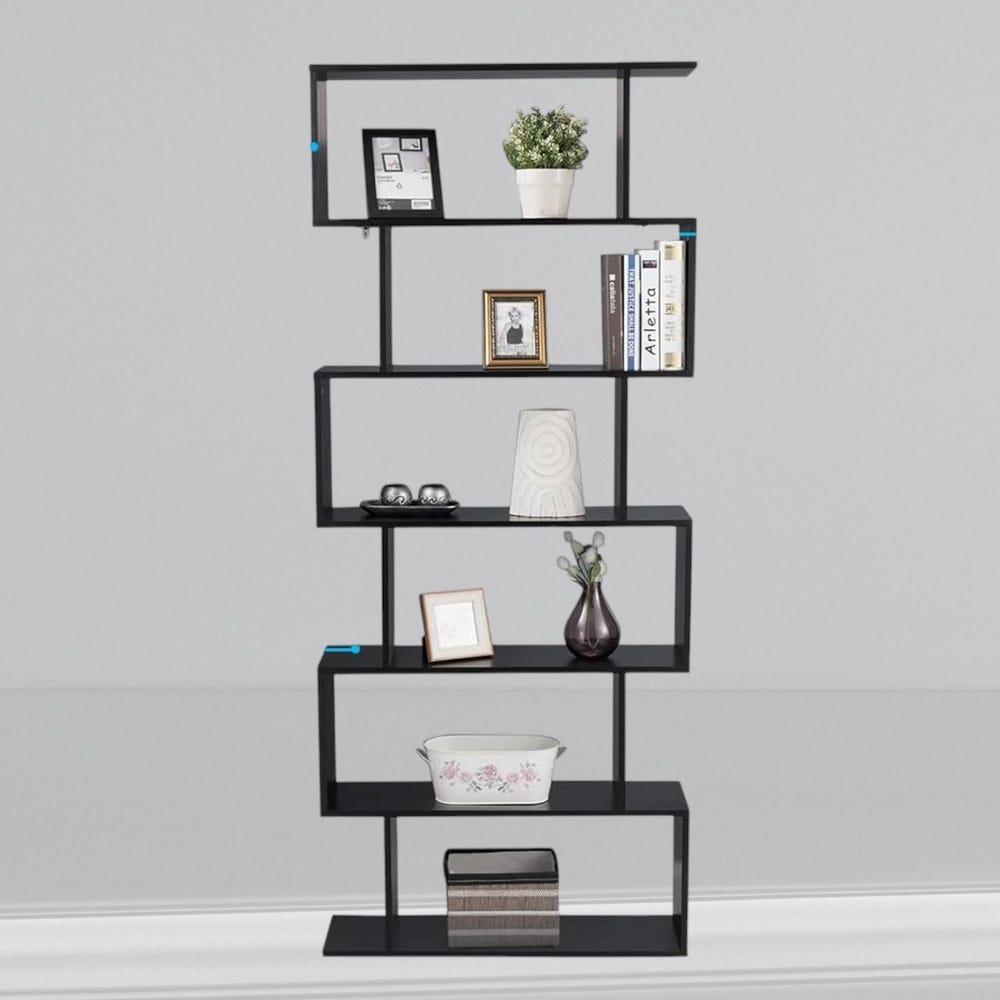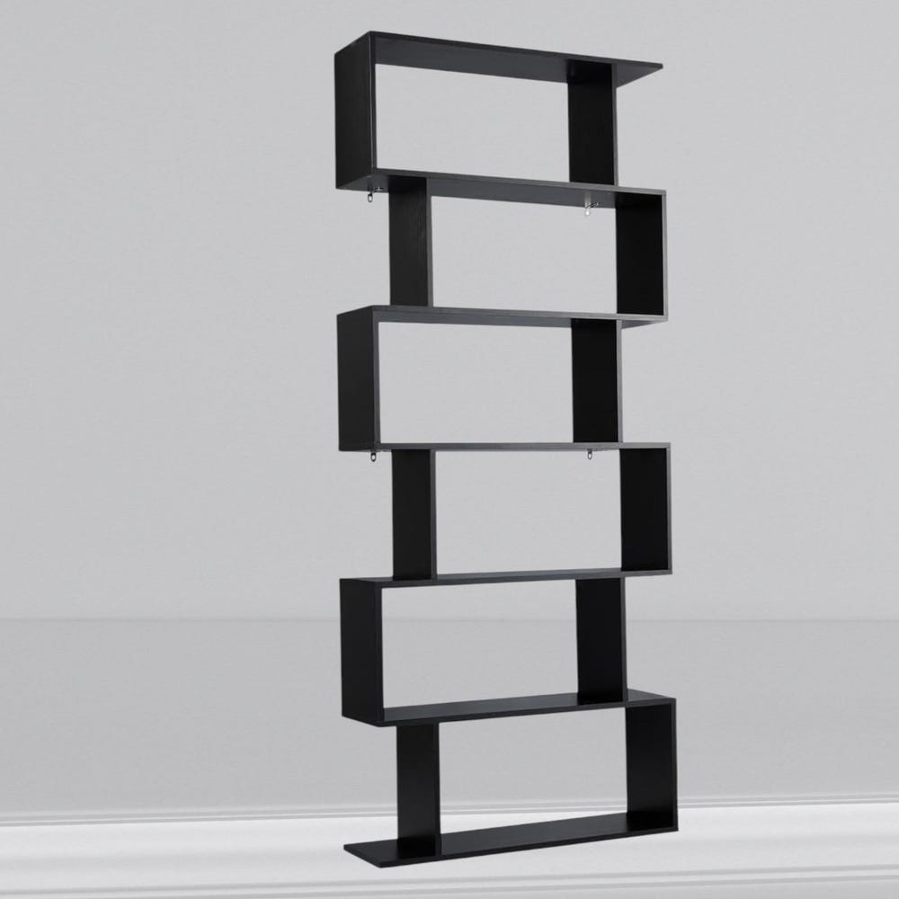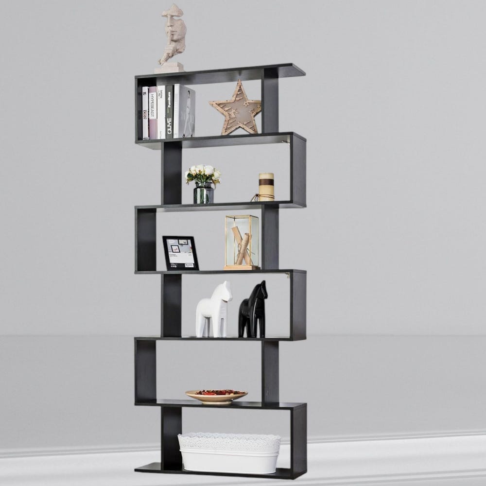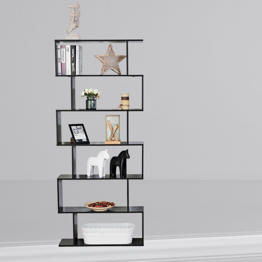 6-Tier Geometric S-Shaped Bookcase | Black | Modern Storage and Display Shelf