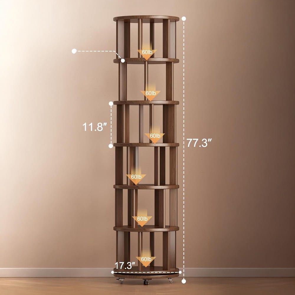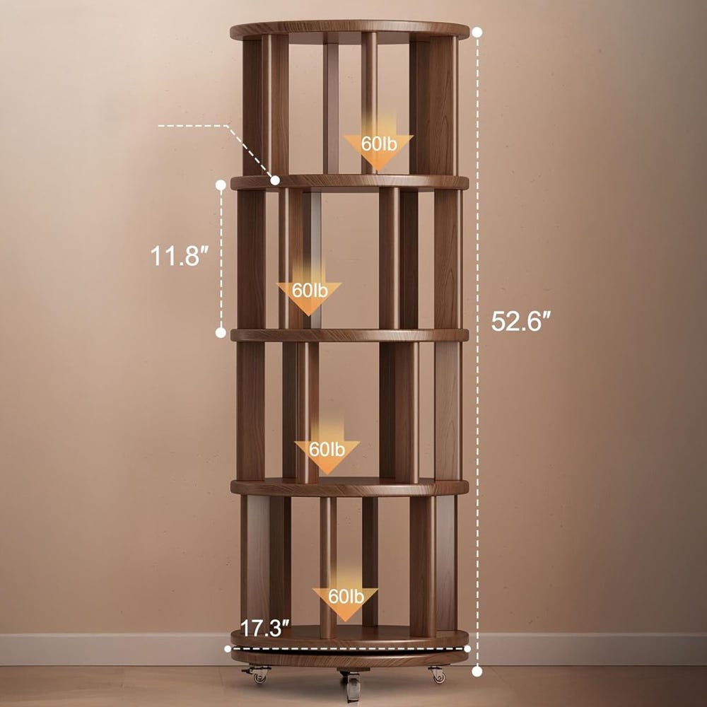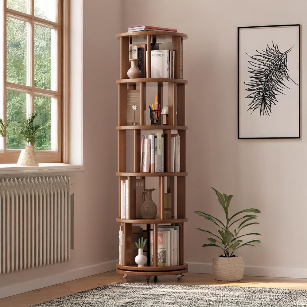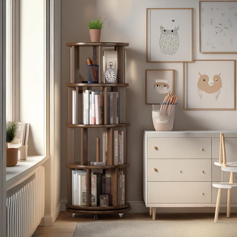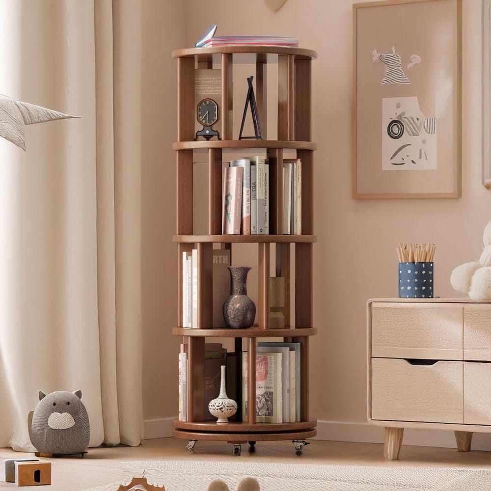 Organize your space in style with our Solid Wood Rotating Bookshelf on Wheels, featuring a round revolving bookcase design perfect for any corner, bedroom, office, or small space. This 360° spinning book shelf tower for kids offers easy access to books and essentials, making it a versatile rotating bookshelf and rotating shelf. Built from premium solid wood, this bookcase solid wood design combines durability with elegance. Whether you need a rotating rack for your living room, a floor bookshelf for your study, or a narrow rolling bookshelf for compact areas, this book organizer fits perfectly. It also works as a stylish corner bookshelf, sturdy industrial bookshelf, practical nursery bookshelf, or a charming baby bookshelf. Use it as a functional book stand to showcase your favorite reads while maximizing space with effortless mobility and timeless walnut finish.