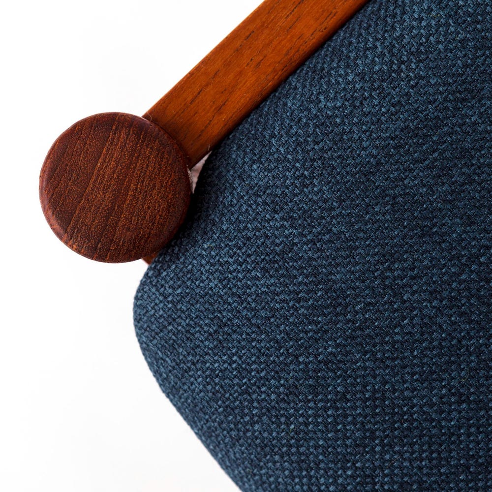 Upholstery: Reupholstered with a vibrant blue textile cover, offering a fresh, contemporary touch while maintaining vintage charm.
