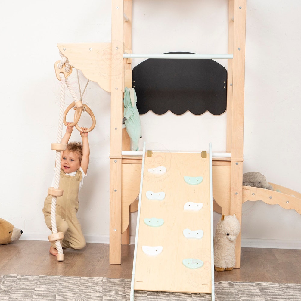 75×71″ Mini Montessori Climber Lernturm, Climbing Arch, Gymnastics Bar, Rock Climbing Wobble Board, Chalkboard & Optional Rope Accessories