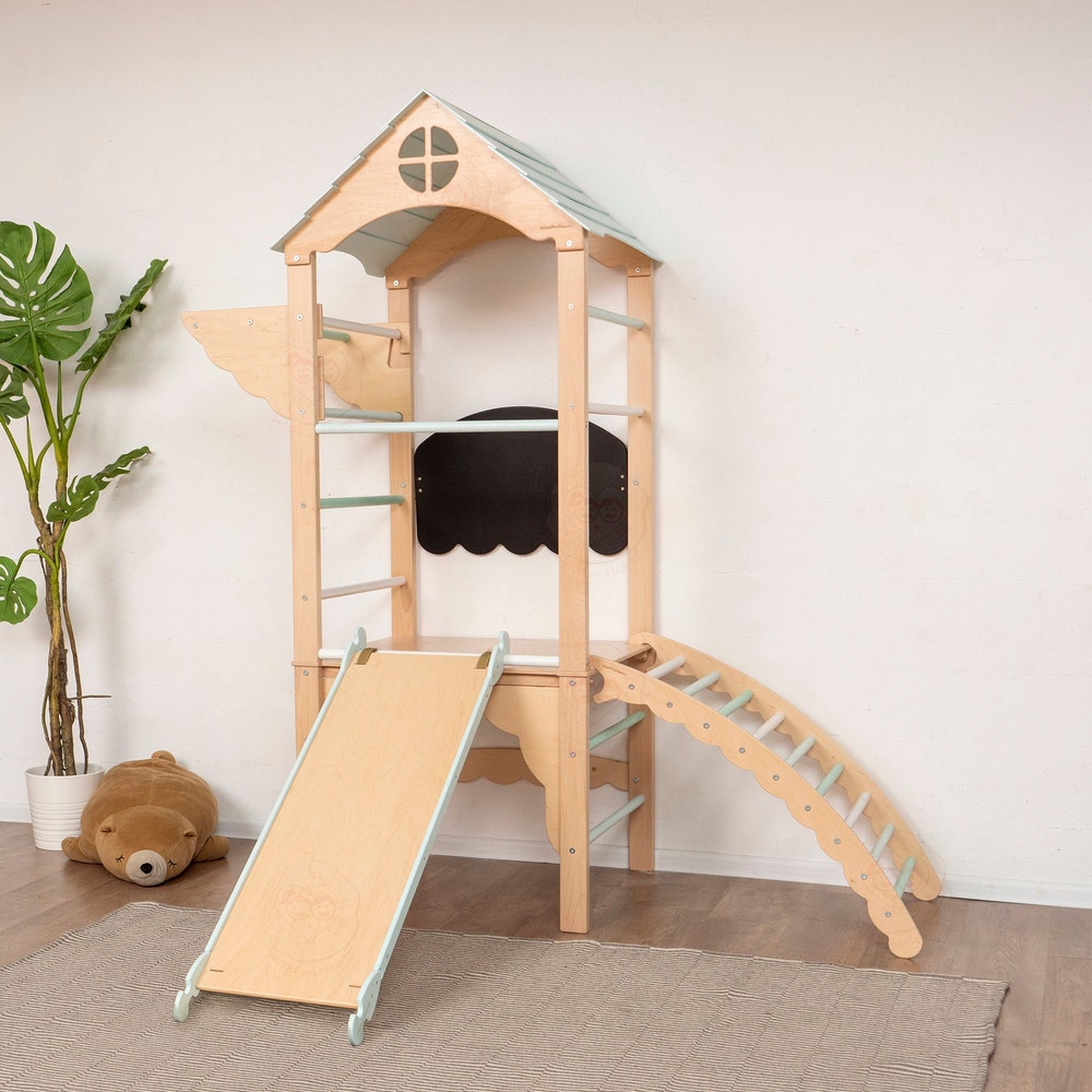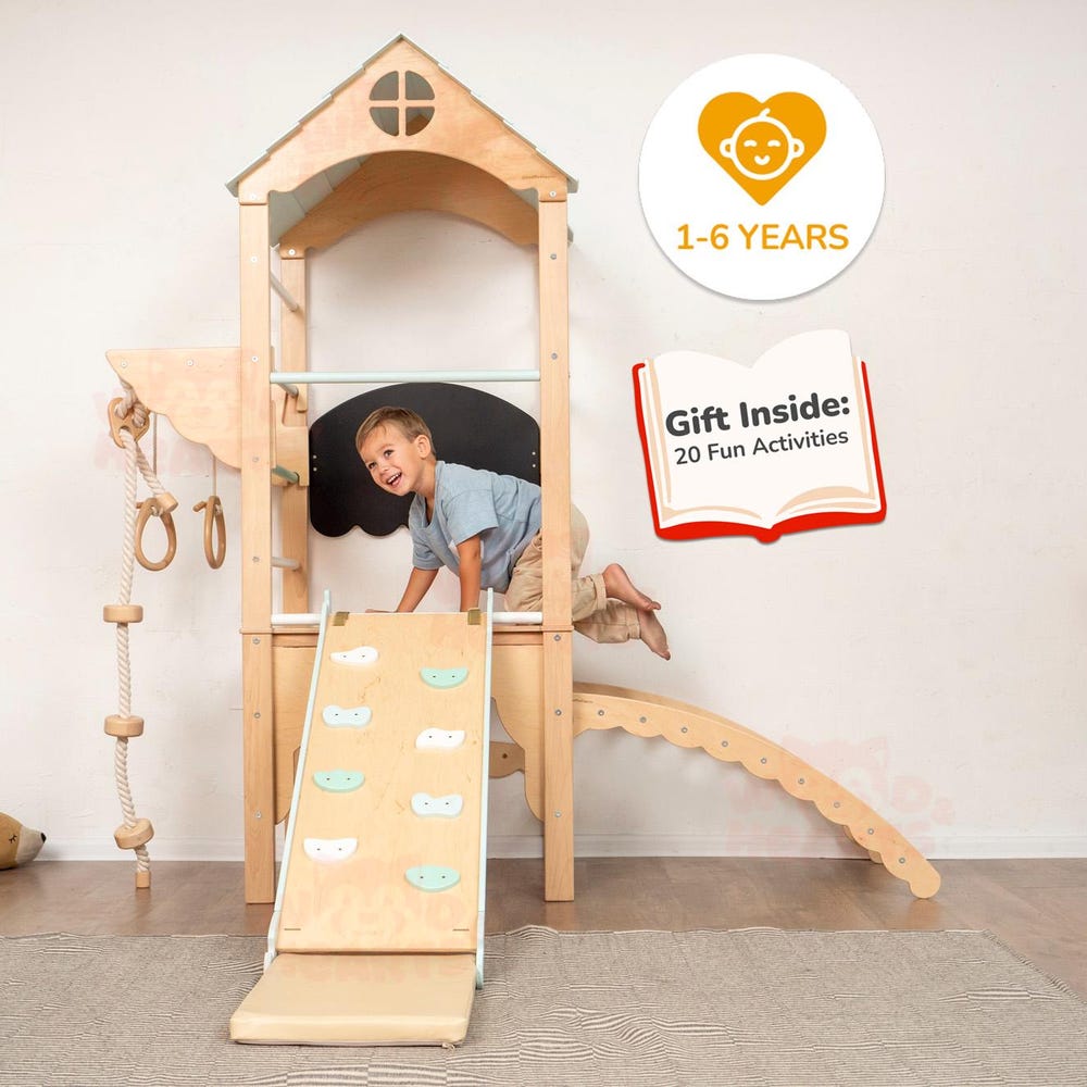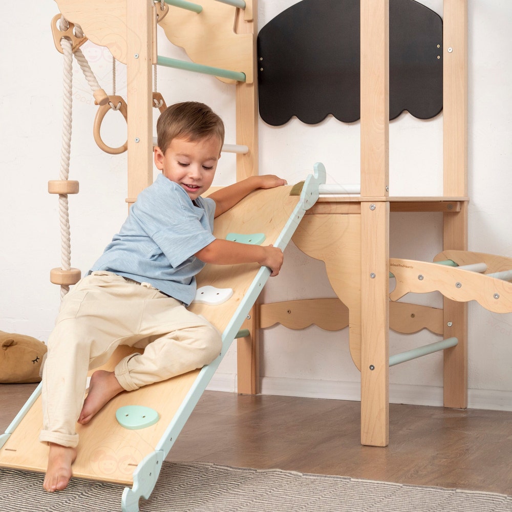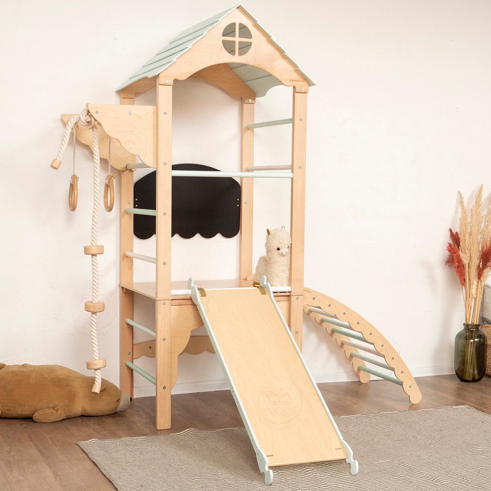 This Listing Consists of these Items: 🌟 Mini complex “Tower”✨ Chalk Board🌟 Climbing Arch✨ Wings Horizontal bar🌟 Two-sided Ramp with Velcro for safe attachment ✨ Rope with Wooden Spheres 🌟 Pair of Monkey Bars You can also choose the preferable color from the options:✨ Natural Wood🌟 Natural Wood + Pastel ⚠️ The Indoor playground can […]