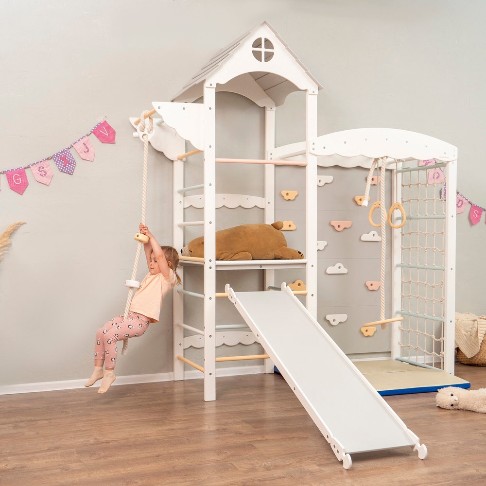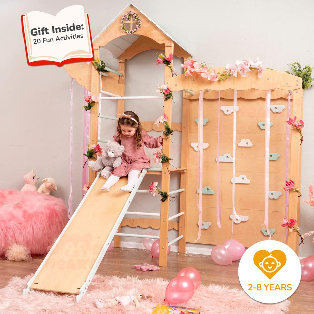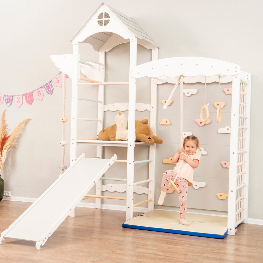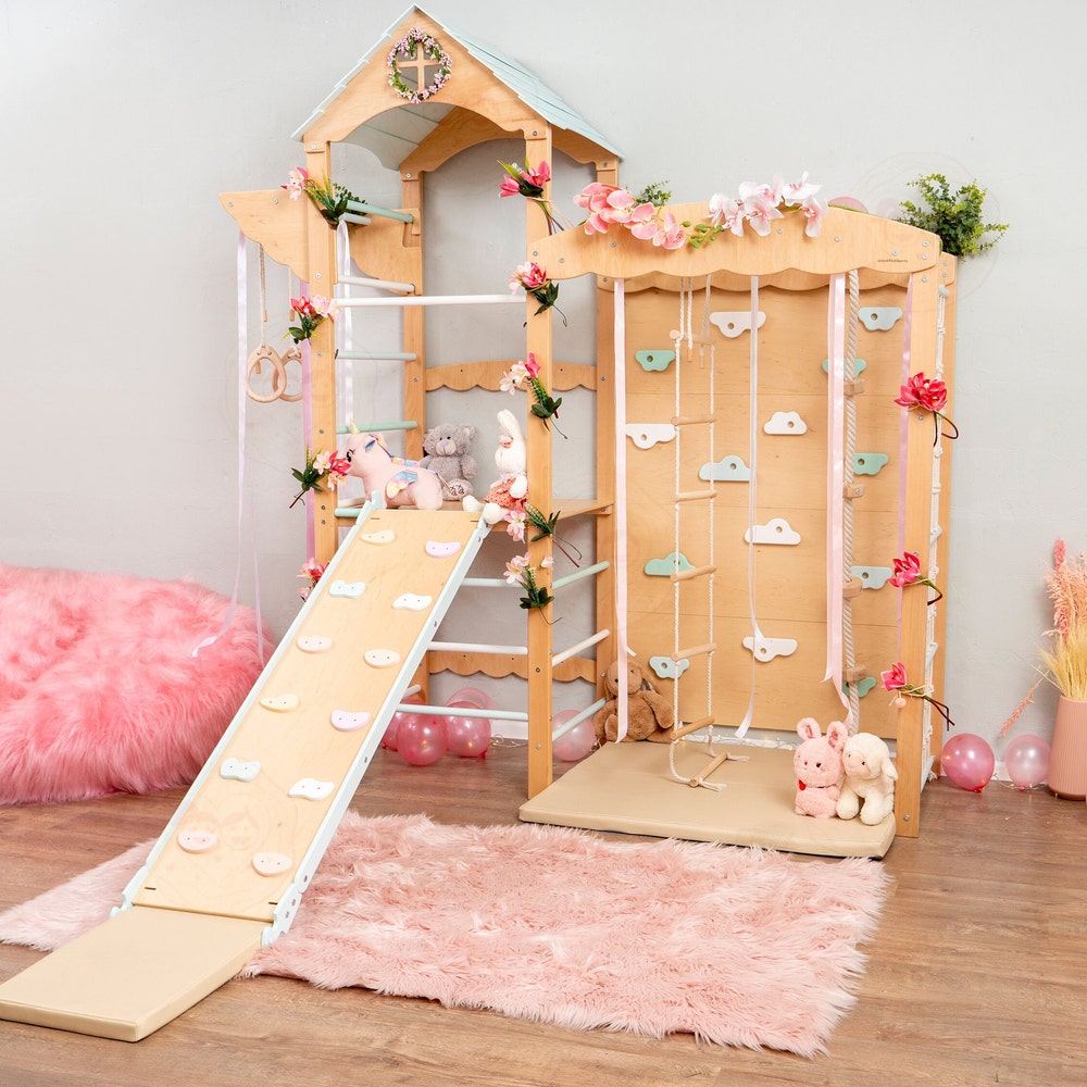 The Wooden Indoor Playground for Girls offers a delightful blend of fun and learning in the comfort of home. This Montessori-inspired play gym features a slide and play mats, providing endless opportunities for active play and exploration. Crafted with quality wood and designed with safety in mind, it serves as both a charming piece of kids furniture and an engaging play space. Whether climbing, sliding, or simply lounging on the mats, children can develop gross motor skills, creativity, and social interaction in a secure and nurturing environment. With its versatile design and durable construction, this indoor playground promises hours of joy and imaginative play for your baby girl.