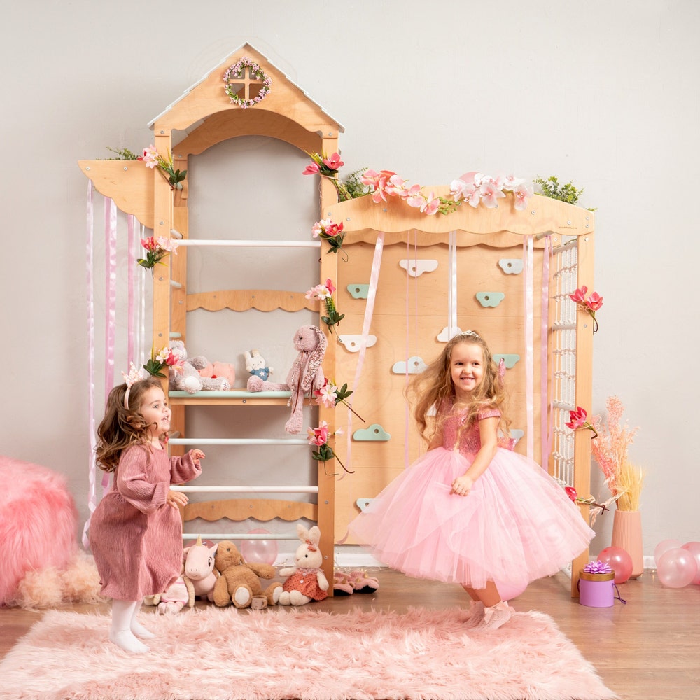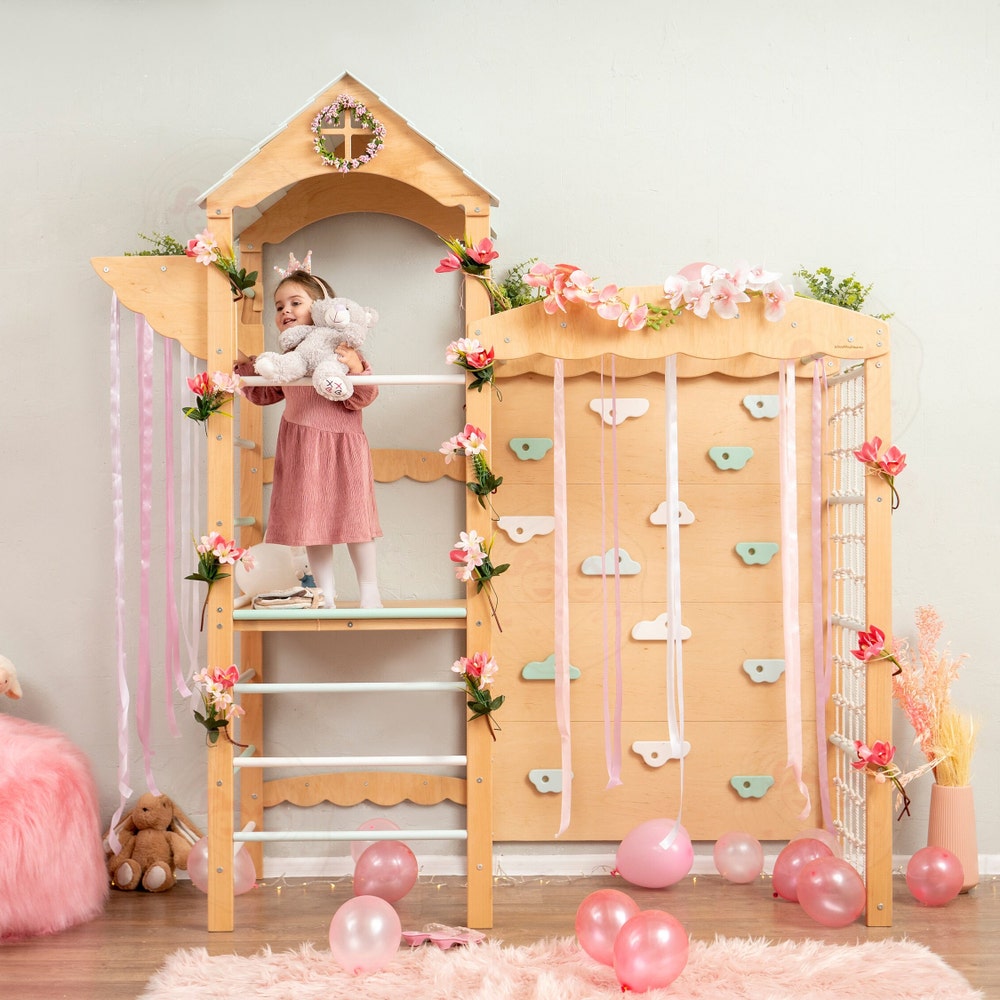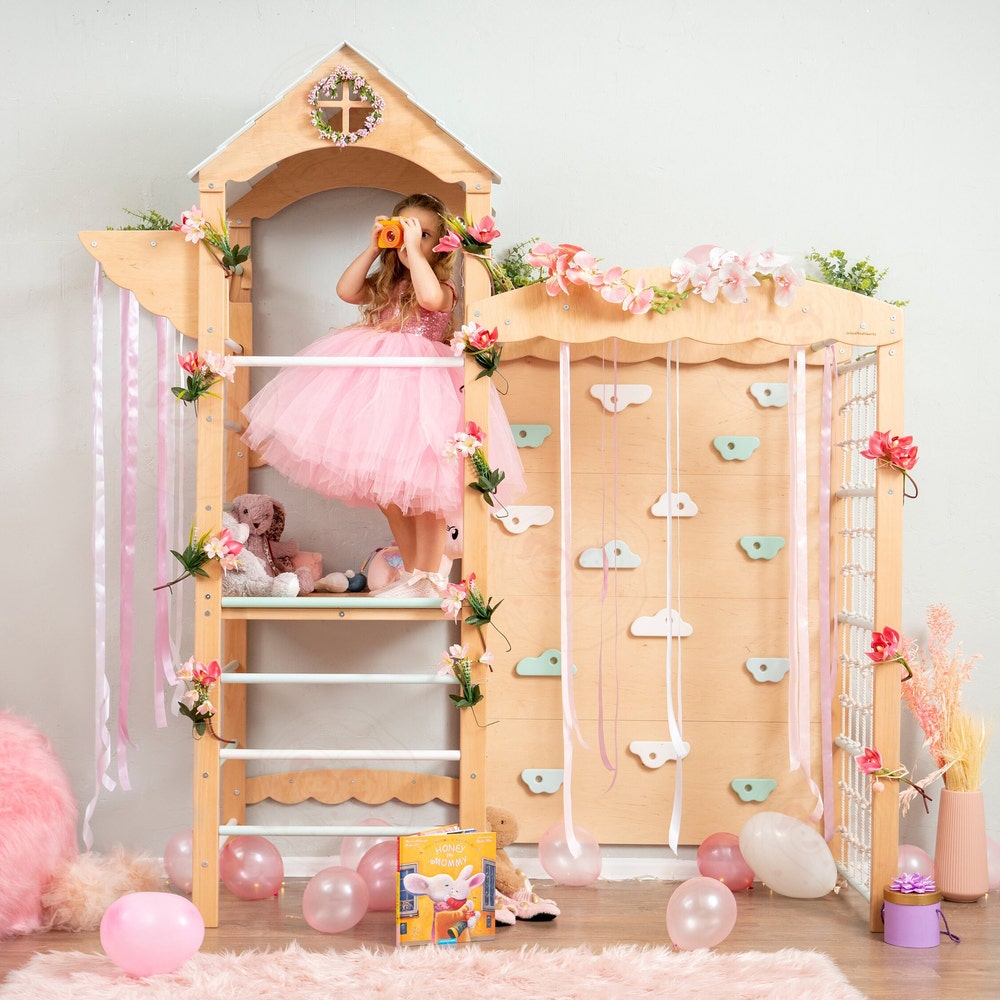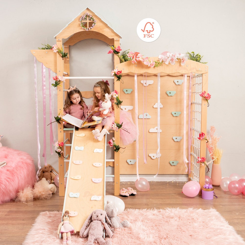 The Wooden Indoor Playground for Girls offers a delightful blend of fun and learning in the comfort of home. This Montessori-inspired play gym features a slide and play mats, providing endless opportunities for active play and exploration. Crafted with quality wood and designed with safety in mind, it serves as both a charming piece of kids furniture and an engaging play space. Whether climbing, sliding, or simply lounging on the mats, children can develop gross motor skills, creativity, and social interaction in a secure and nurturing environment. With its versatile design and durable construction, this indoor playground promises hours of joy and imaginative play for your baby girl.