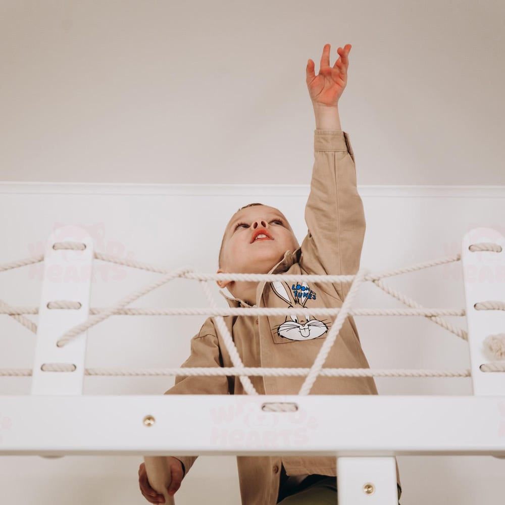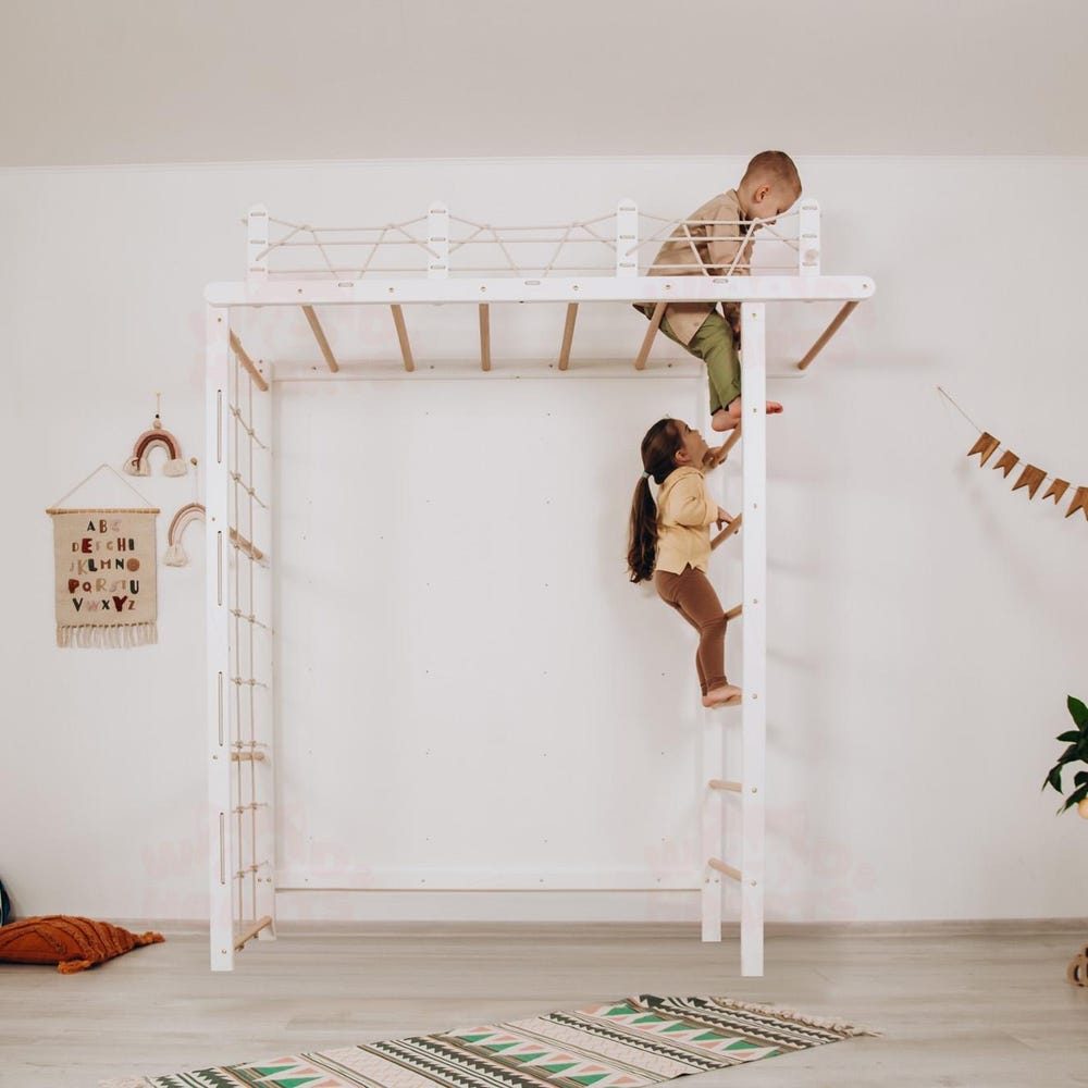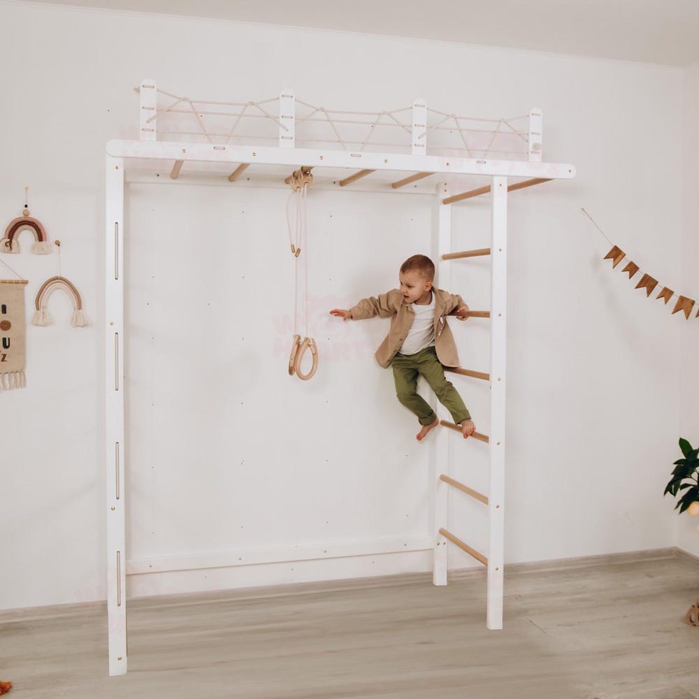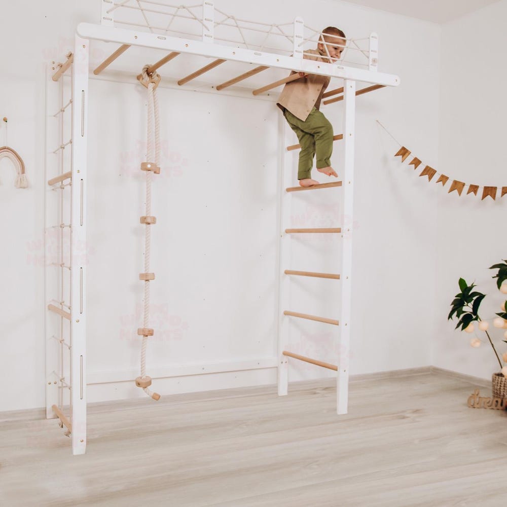 The Swedish ladder “Bridge” with optional accessories is a corner for impressive, fun and exciting activities for your kid. With this complex, your baby will have plenty of space for the stable and proper development of their physical abilities and the opportunity to realize their activity and dreams.