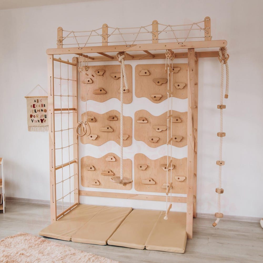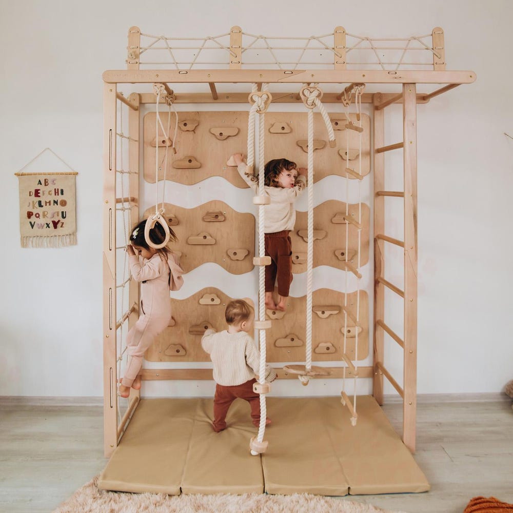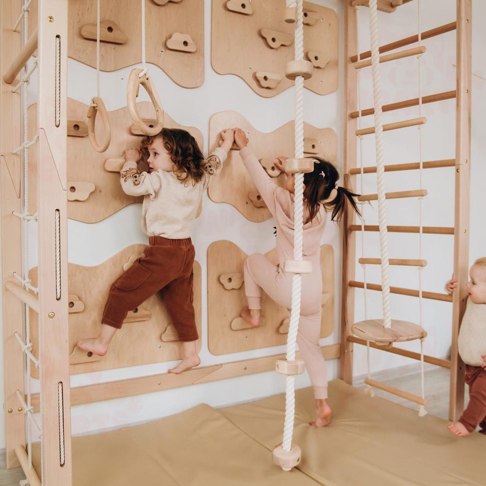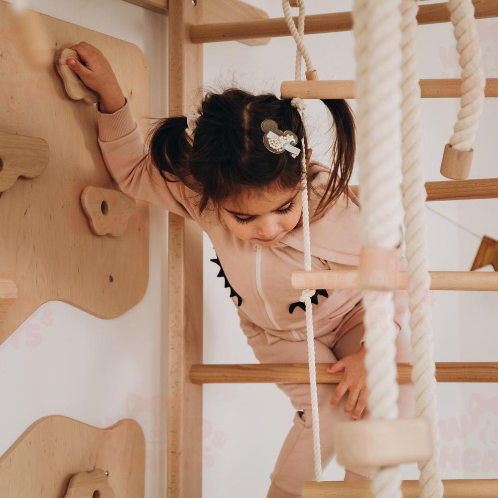 Transform your child’s play area with our versatile Swedish Ladder “Bridge” Set with Indoor Climbing Wall, designed to inspire endless fun and physical development. This set can include either 3 or 6 rock climbing panels, each designed to mount securely on standard American wall studs. The climbing stones can be arranged according to your desire to craft a unique climbing experience or obstacle course right in your own home. The comprehensive set with rope accessories includes everything needed for active play and exercise, promoting strength, coordination, and creativity.