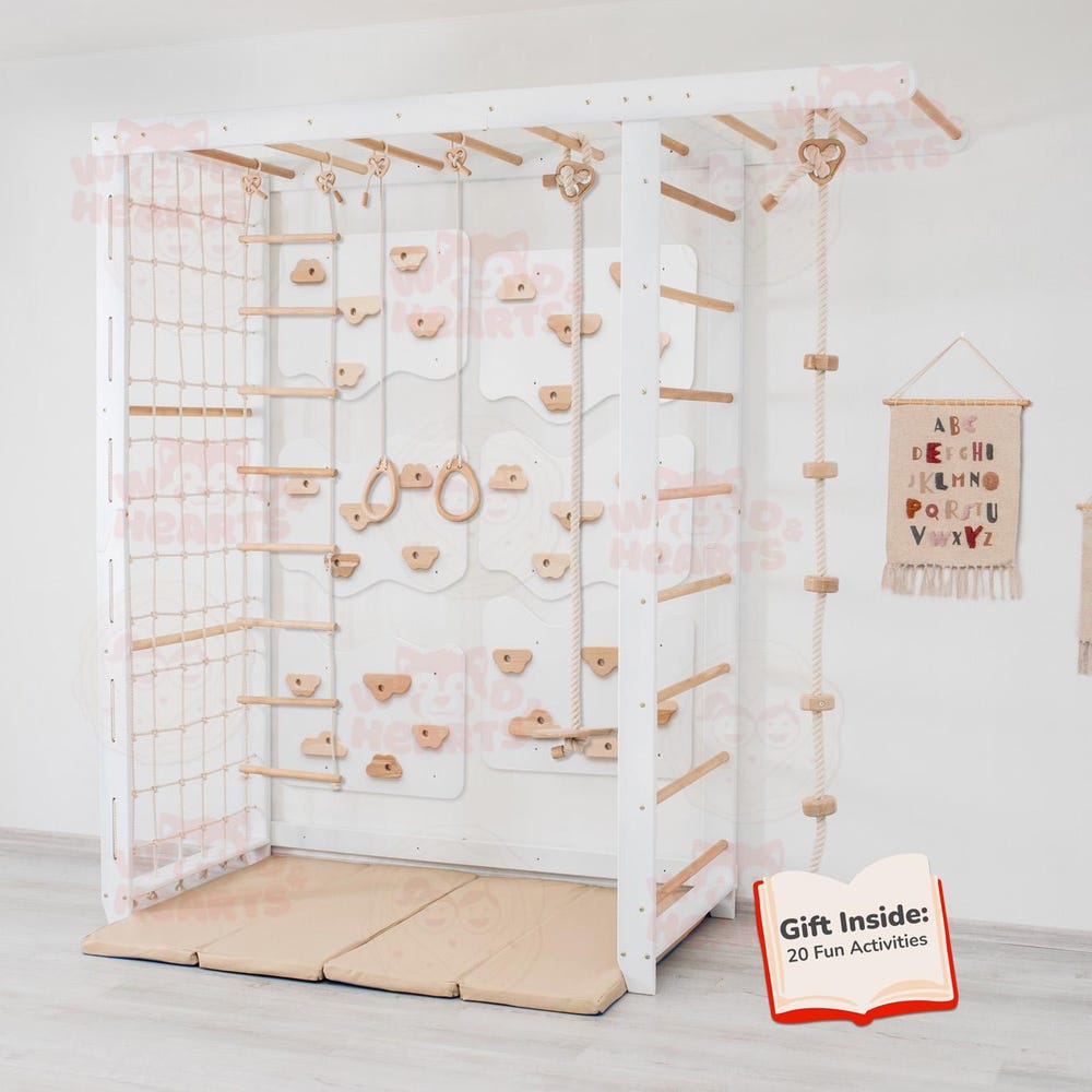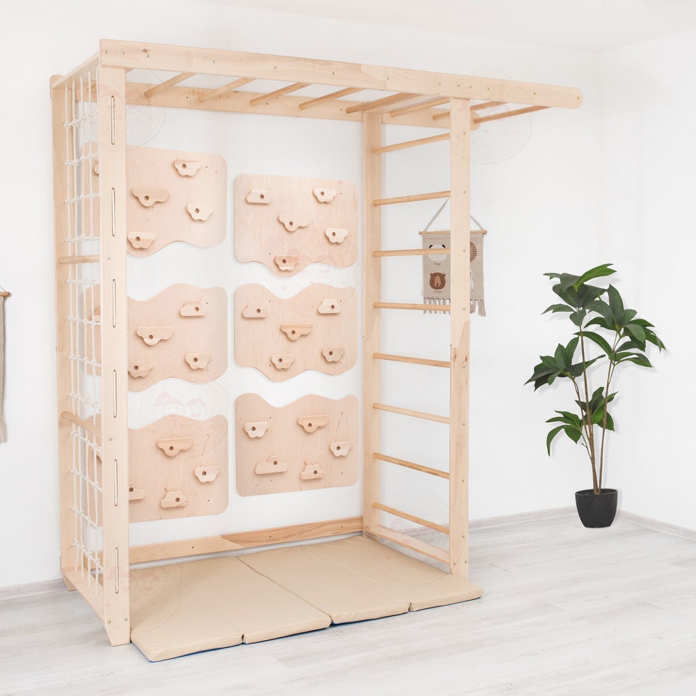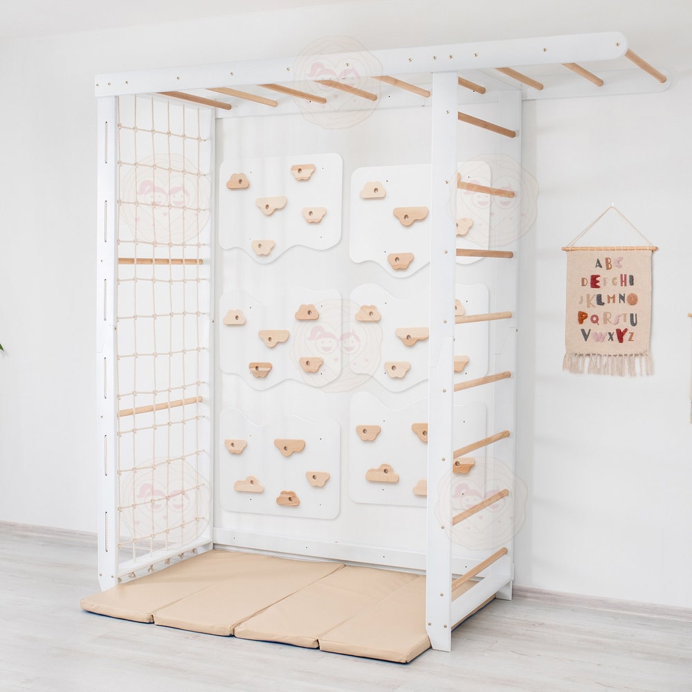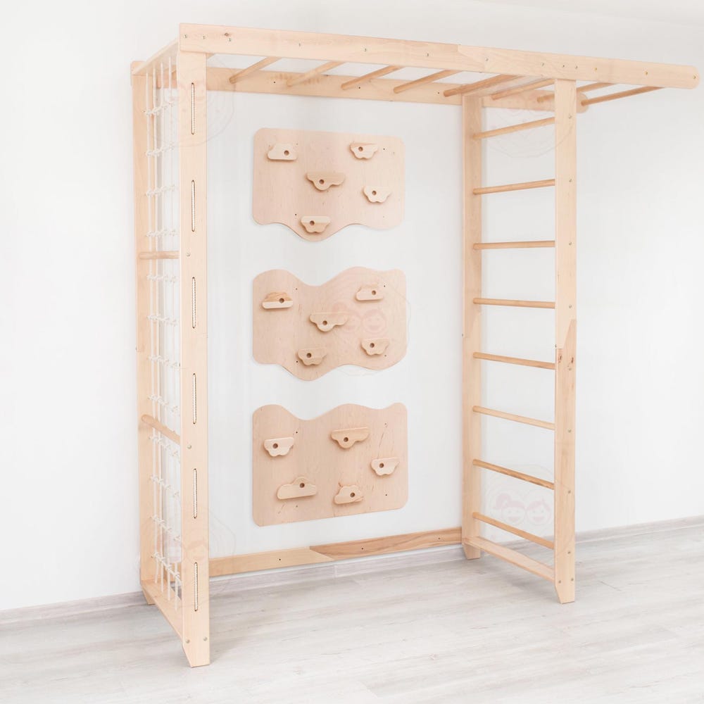 Transform your child’s play area with our versatile Swedish Ladder “Big Bridge” Set with customizable indoor climbing wall, designed to inspire endless fun and physical development. This set can include either 3 or 6 rock climbing panels, each designed to mount securely on standard American wall studs. The climbing stones can be arranged according to your desire to craft a unique climbing experience or obstacle course right in your own home. The comprehensive set with rope accessories includes everything needed for active play and exercise, promoting strength, coordination, and creativity.