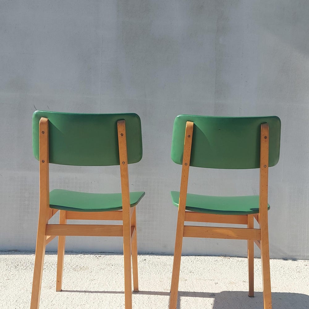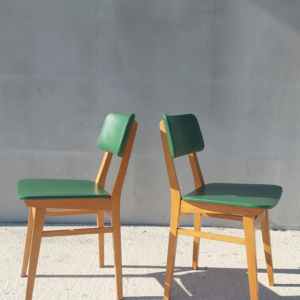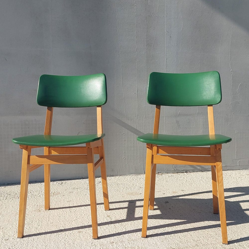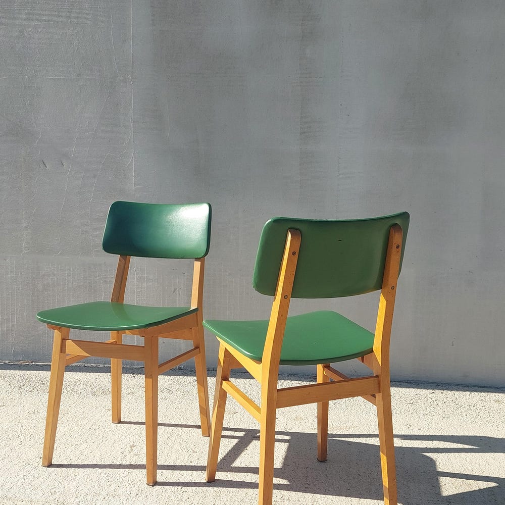 Chairs are in beautiful retro color and are really comfortable. Made of massive wood and green faux leather. One chais has a two really small holes in the seating part and a small visible damage to the outer back of the seat.