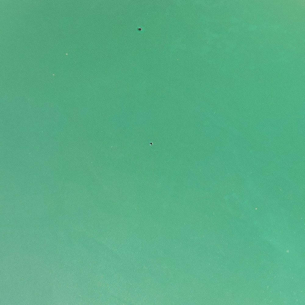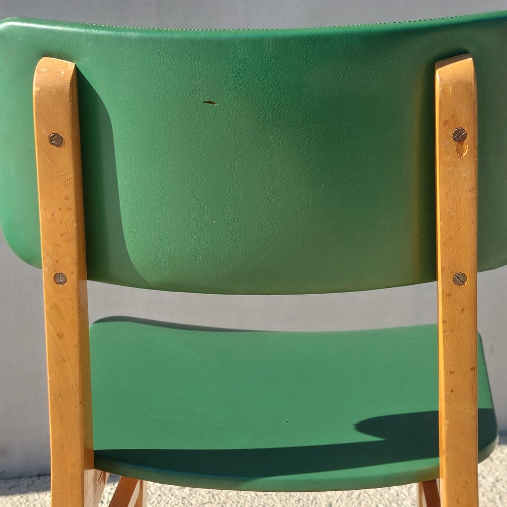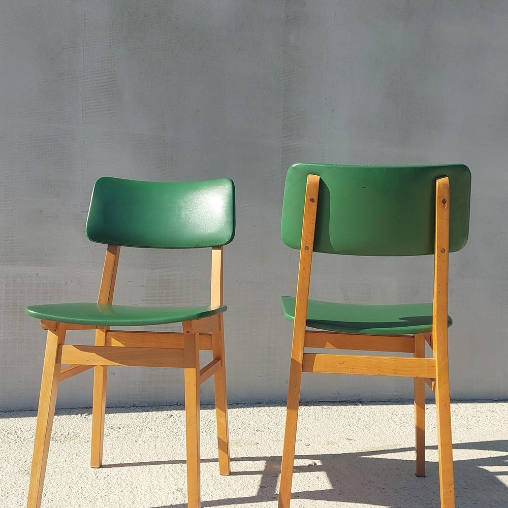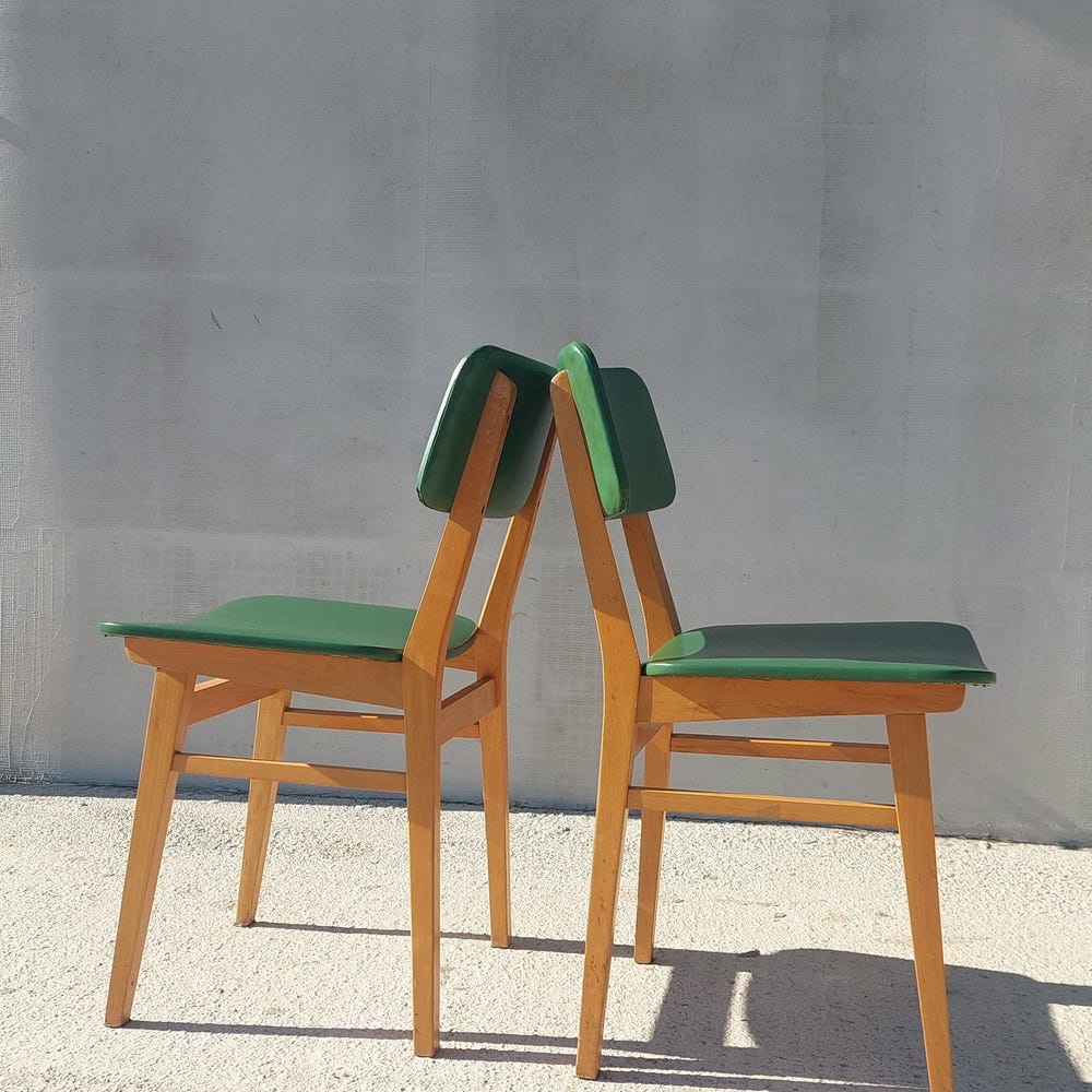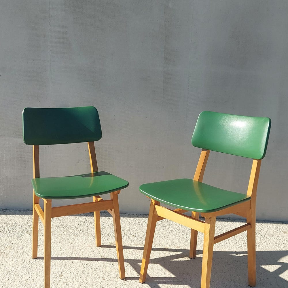 Chairs are in beautiful retro color and are really comfortable. Made of massive wood and green faux leather. One chais has a two really small holes in the seating part and a small visible damage to the outer back of the seat.