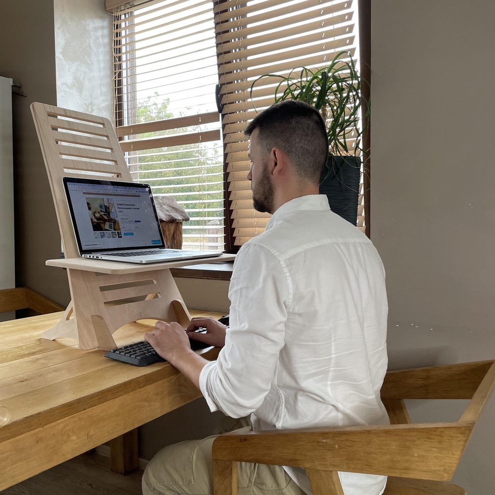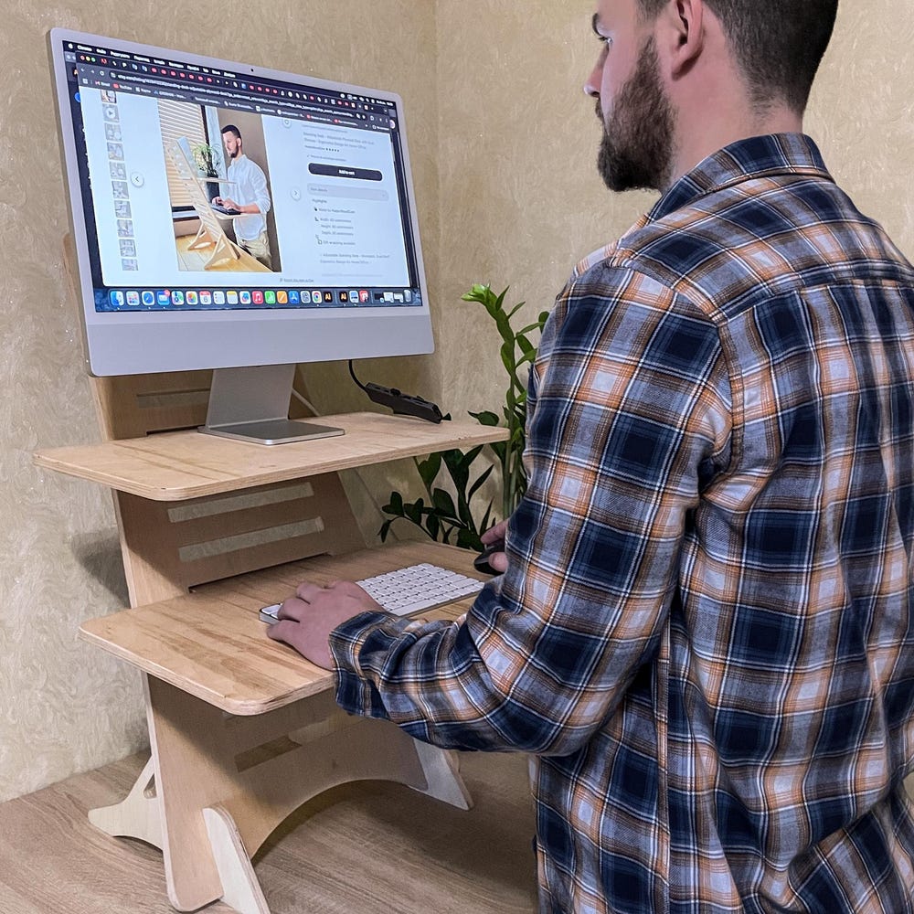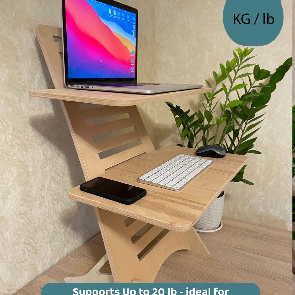 Transform your workspace with our Adjustable Plywood Standing Desk Converter, designed for ultimate comfort and productivity. This ergonomic sit-stand workstation allows seamless transitions between sitting and standing, promoting better posture and reducing back pain. Crafted from high-quality plywood with a minimalist design, this desk is not only functional but also aesthetically pleasing. The height adjustment feature ensures it fits your needs perfectly, making it ideal for both home and office environments. Our standing desk supports up to 10 kg (22 Ib) , providing a sturdy surface for your laptop, keyboard, and other essentials. Upgrade your work setup today and experience the benefits of a healthier, more dynamic workflow.
