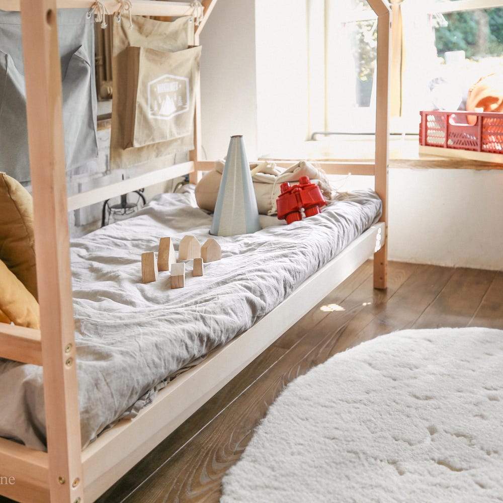 This bed frame is ingeniously designed to function in two configurations: as a low, floor bed suitable for younger children, and as an elevated bed on legs for older kids. You have the flexibility to transform the bed to suit your needs at any time, easily switching between the two setups.
