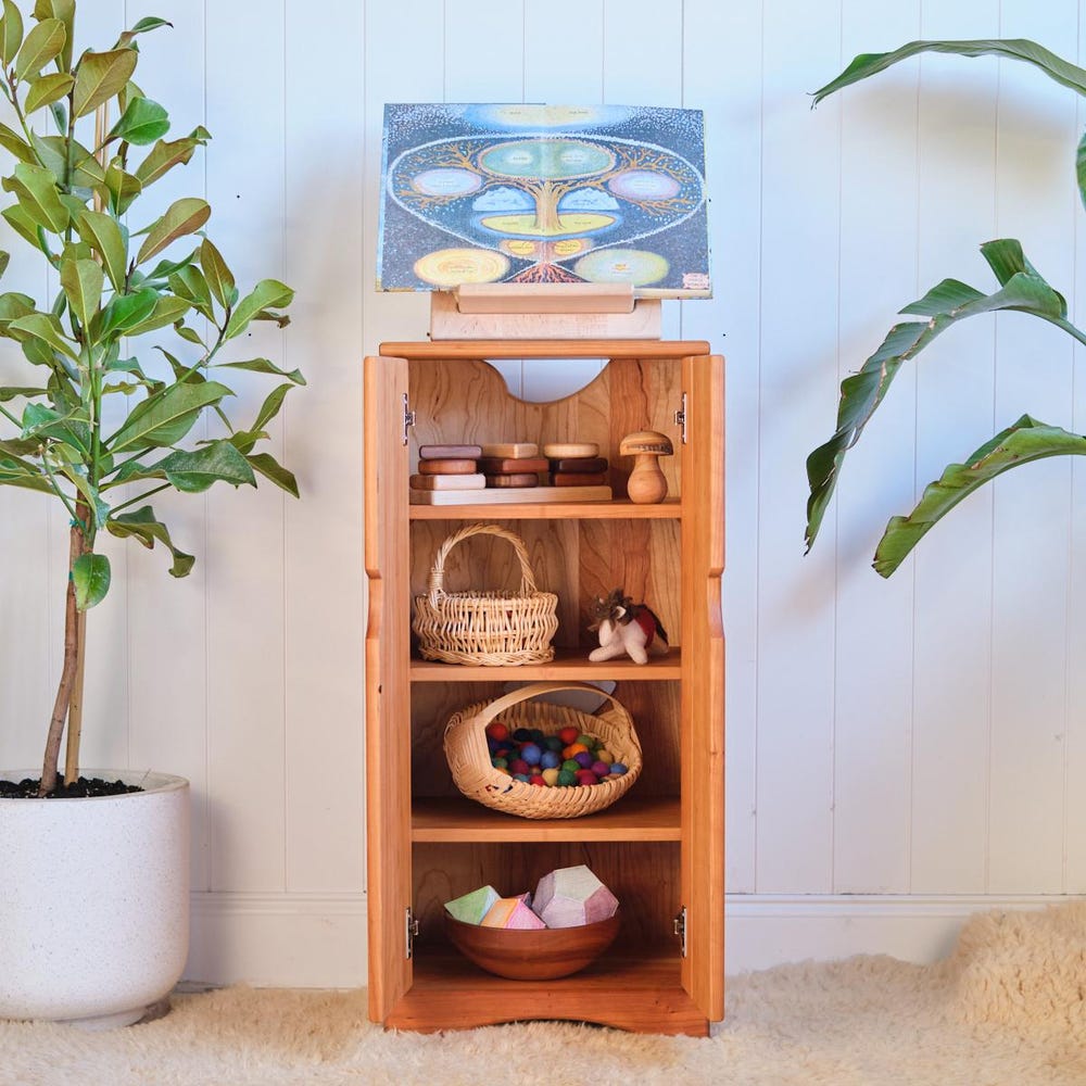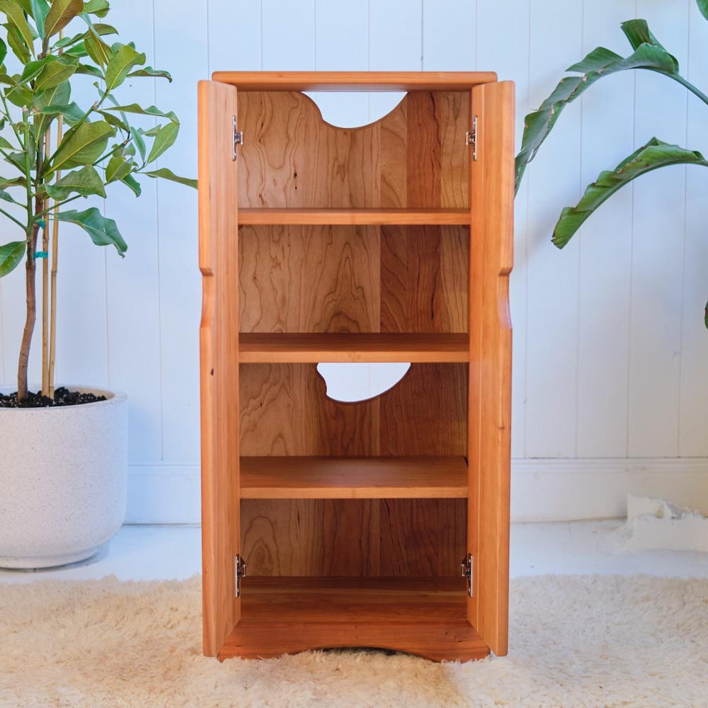 Enhance your child’s playroom or any room with our All Cherry or Maple Cabinet Wood Shelving. Finished with our Three BEEautiful Beeswax Polish (organic Jojoba Oil and Michigan Beeswax) and crafted with soft edges featuring signature custom cutout handles. Solid cherry or maple wood with no plywood or mdf.