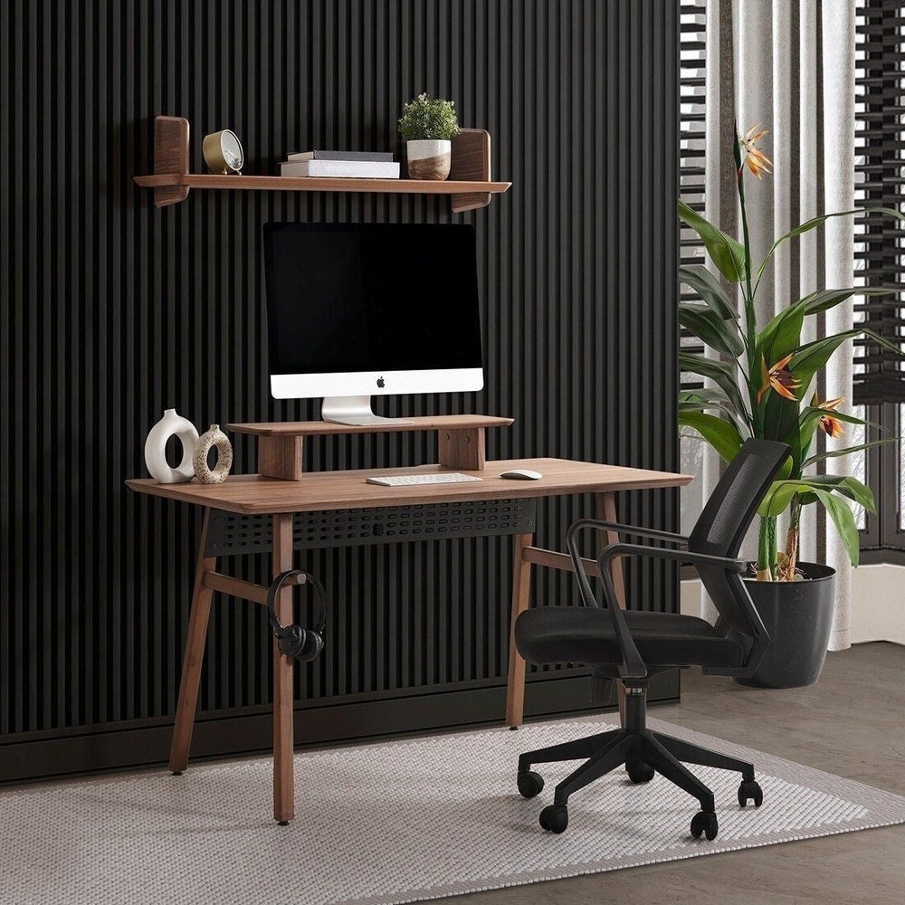American Walnut Wooden Desk, Minimalist Computer Desk, Office Desk with Cable Organizer & Headphone Holder, Personalized Gift