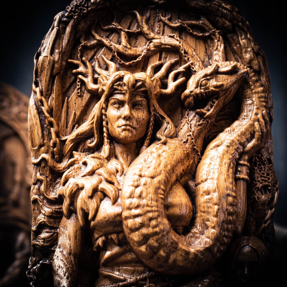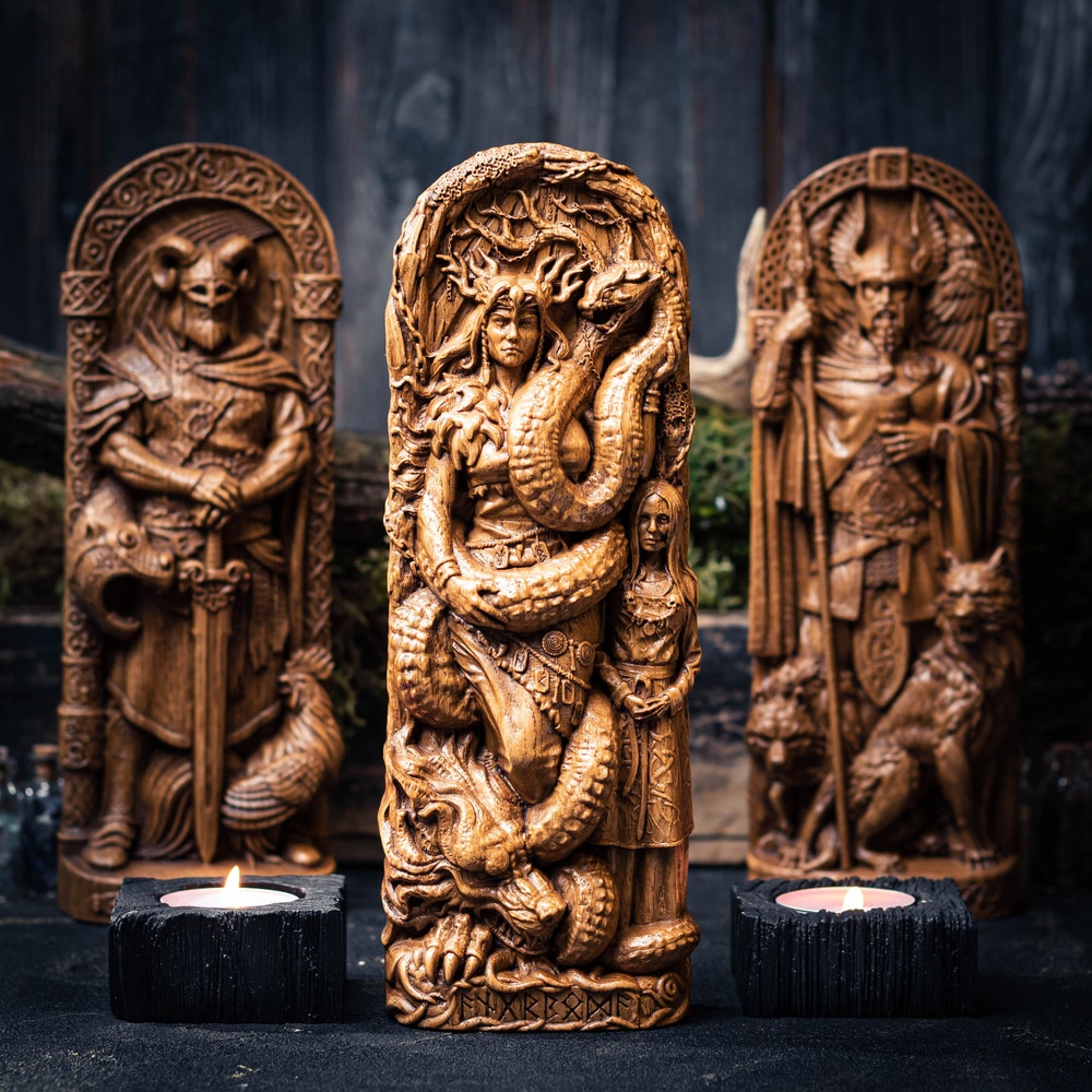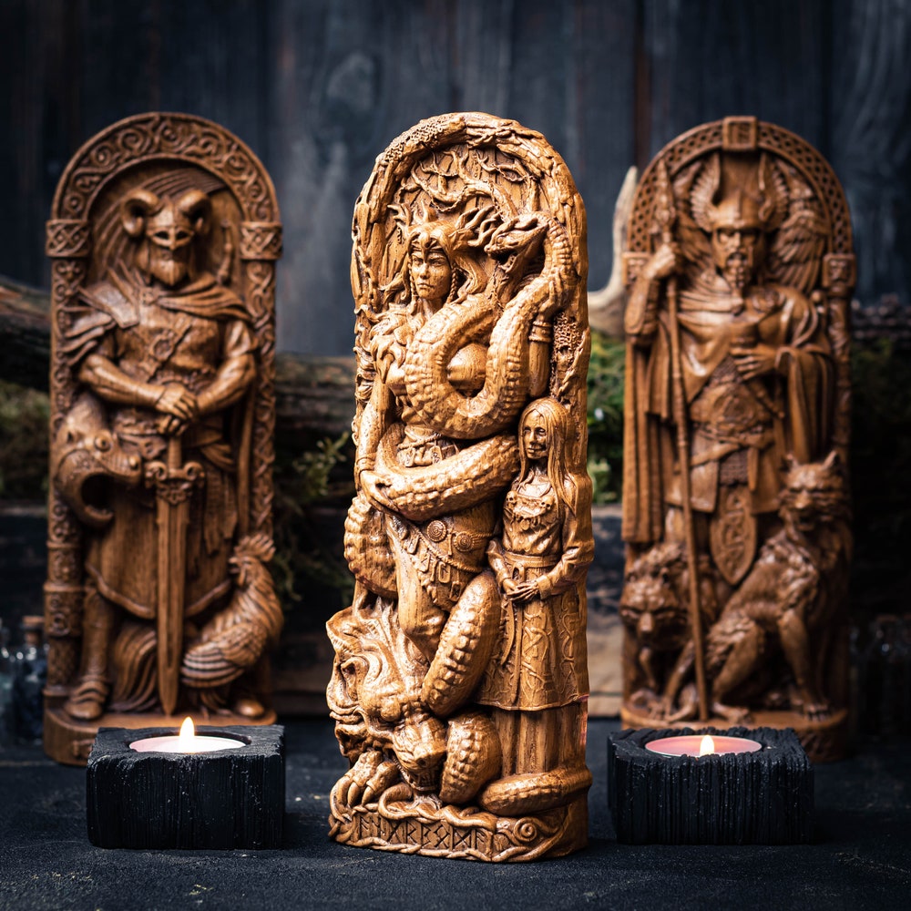 Presenting to you the Angrboda Norse goddess sculpture, with her offspring – Hel, Fenrir nad Jormungandr. A representation that adds a mystical touch to your home altar or interior decoration. Its measurements are: Height: 9.25 inches (or 23.5 cm)Width: 3.7 inches (or 9.5 cm)Depth: 1.5 inches (or 4 cm) Carved from oak wood, the statue […]