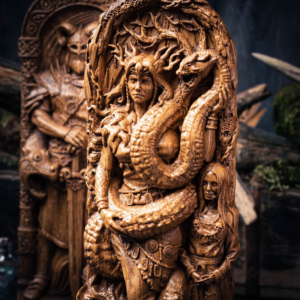 Presenting to you the Angrboda Norse goddess sculpture, with her offspring – Hel, Fenrir nad Jormungandr. A representation that adds a mystical touch to your home altar or interior decoration. Its measurements are: