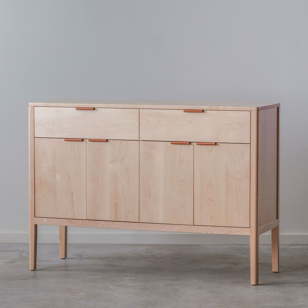 Introducing our new Avers Credenza! Includes two drawers, two adjustable shelves, and two cord cutouts. Finished with a clear, low sheen conversion varnish to provide durability and water resistance. Pictured: Walnut (photos 1-5) Maple (photo 6)White oak (photo 7)Hardware: 4″ Brown leather / brass rod pulls Also available: CherryHardware also available: 4″ Black leather pulls […]