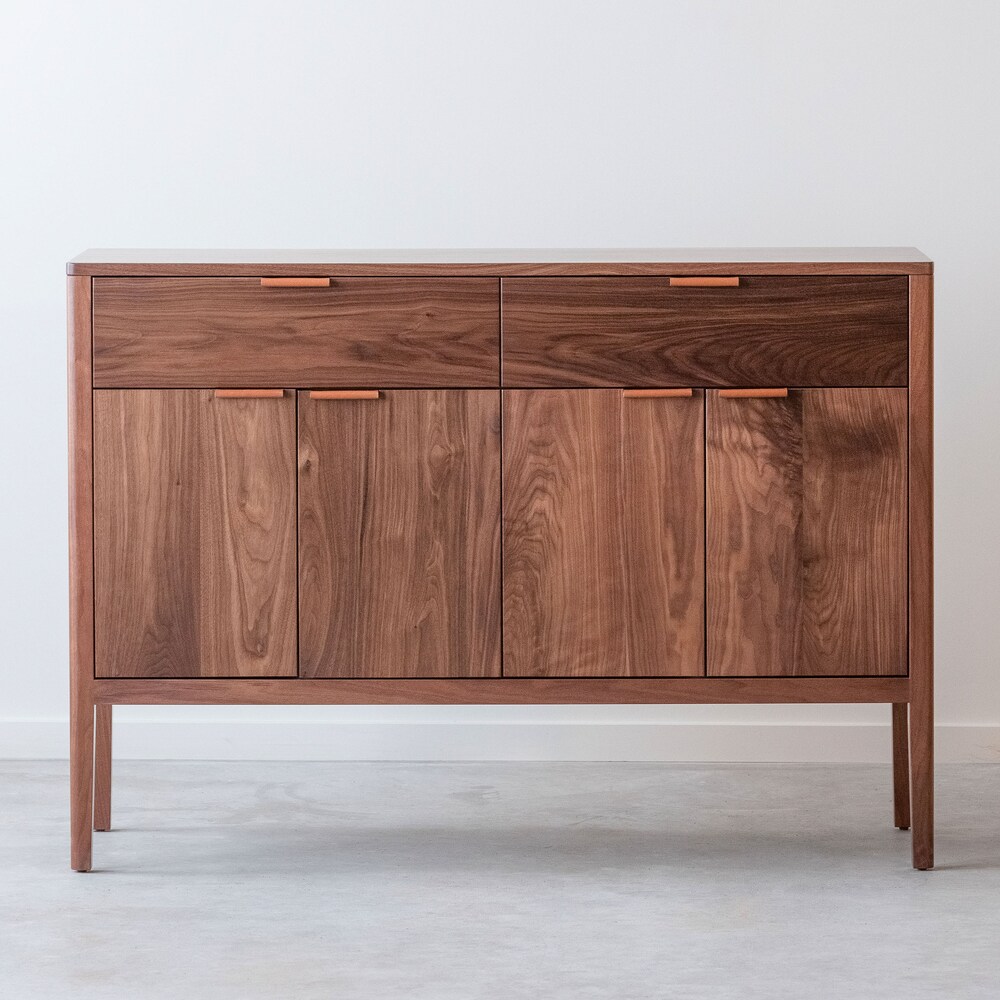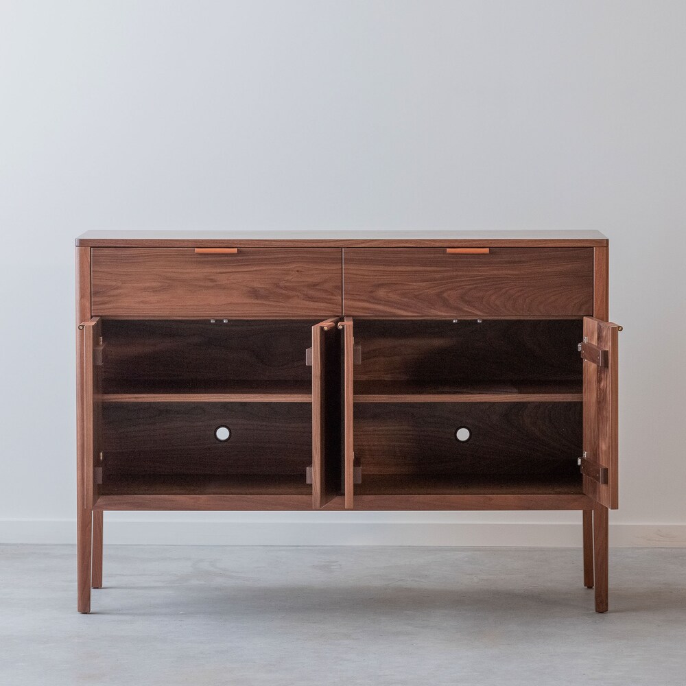 Introducing our new Avers Credenza! Includes two drawers, two adjustable shelves, and two cord cutouts. Finished with a clear, low sheen conversion varnish to provide durability and water resistance.