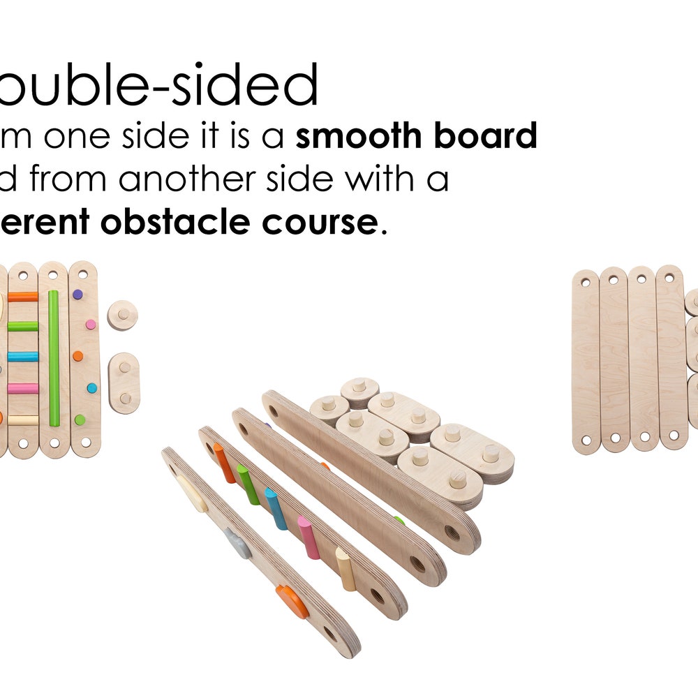 Balance beam set from 6 beams. HappyMoon team offers first double-sided balance beam in the world. It is an open-ended wonderful wooden toy that develops fine and gross motor skills, a sense of balance and agility, strengthens muscles, and is a good leg trainer, which helps prevent flat feet. HappyMoon balance beam is unique with double-sided options: from one side it is a smooth board and from another side with a different obstacle course.