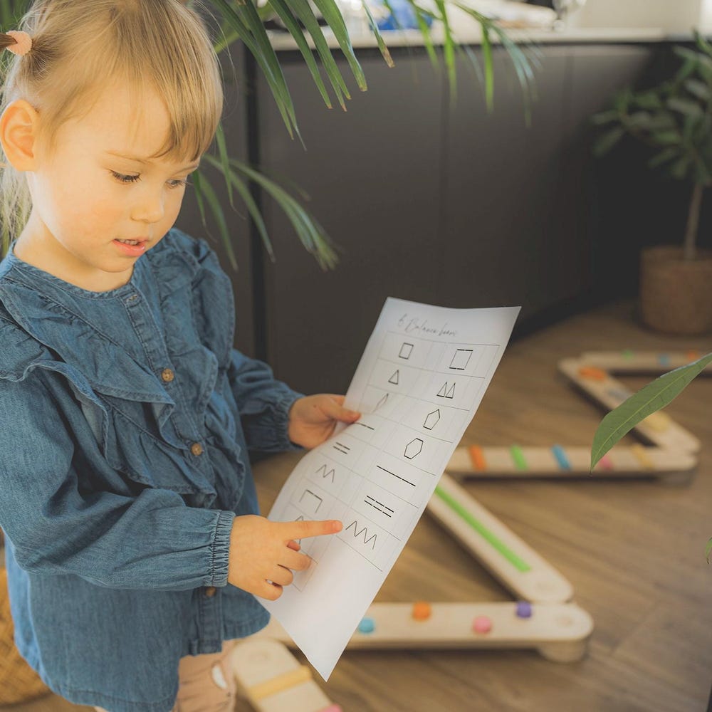 Balance beam set from 6 beams helps to learn different shapes, learn how to balance body and develop gross motor skills. Different shaped obstacles improves feet sensory stimulation and are recommended to gain barefoot sensations.