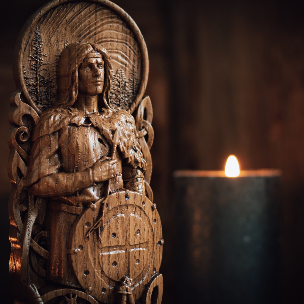 Handmade wooden statuette of Baldur carved out of oak wood.