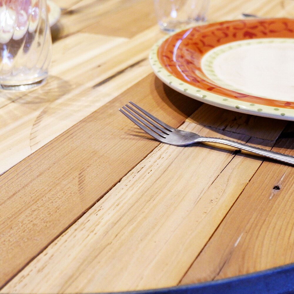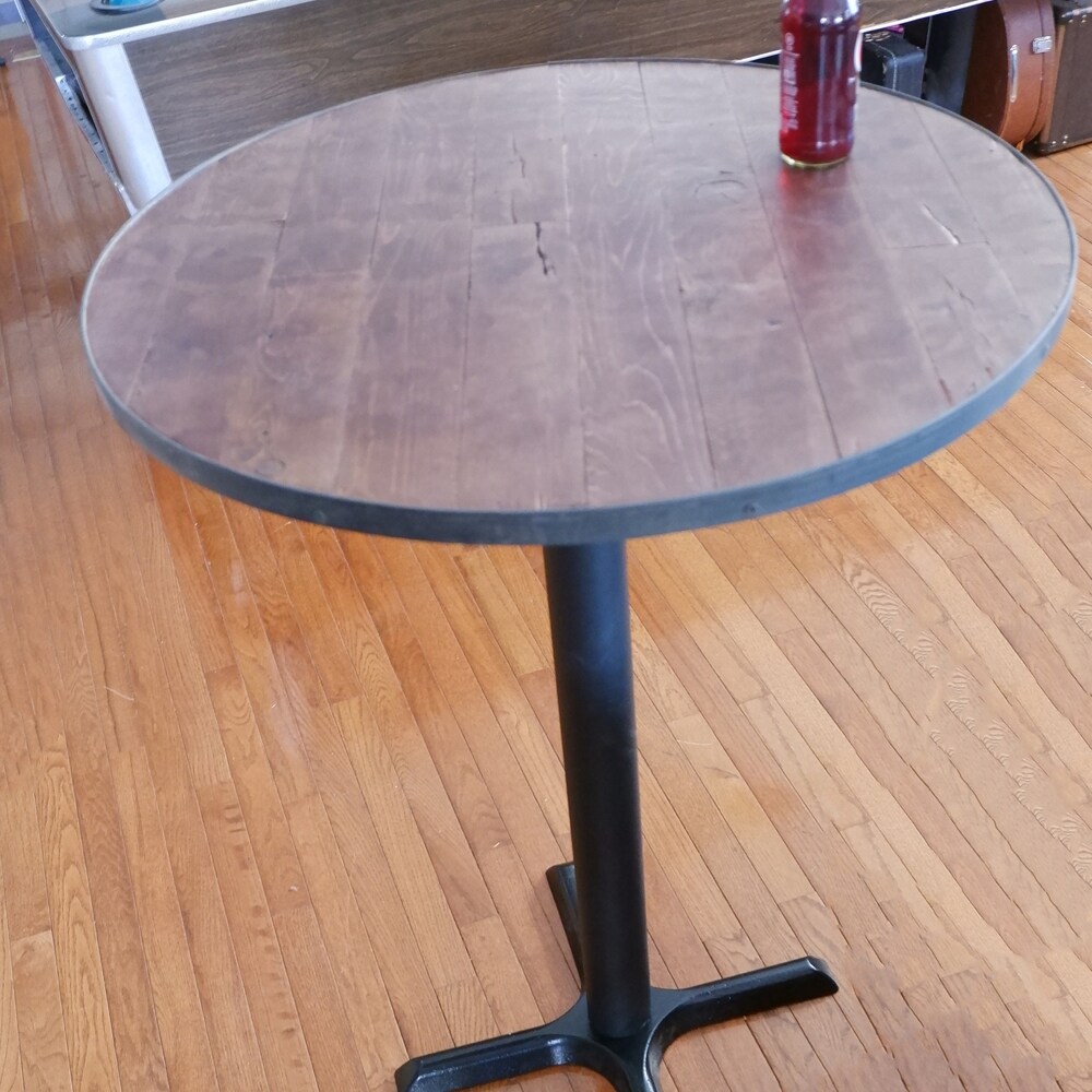 Made with reclaimed wood. This is the REAL DEAL. Not imitation reclaimed wood. There will be knots, saw marks, and nail holes from its former lives. Colors, grains, and textures will vary. We use a steel band around the rim with a metal pedestal leg painted black to finish off the rustic look.