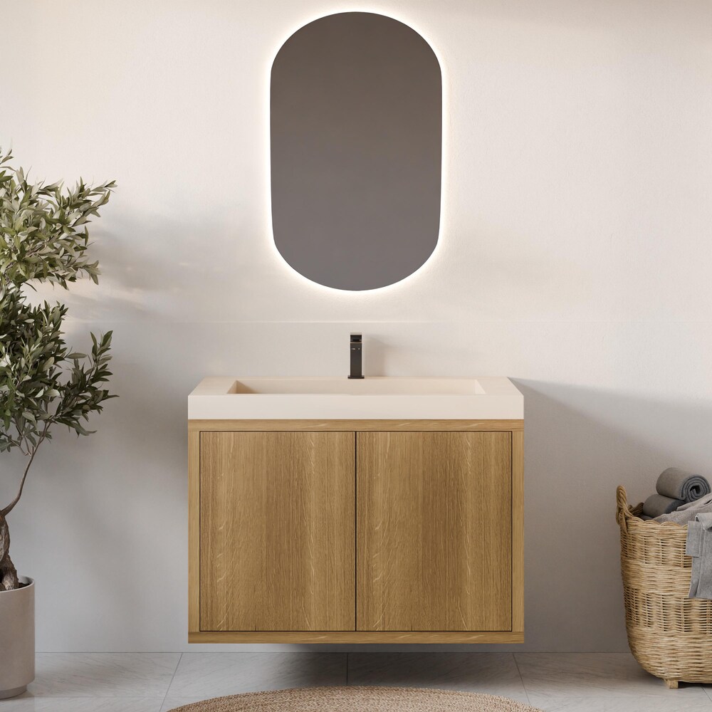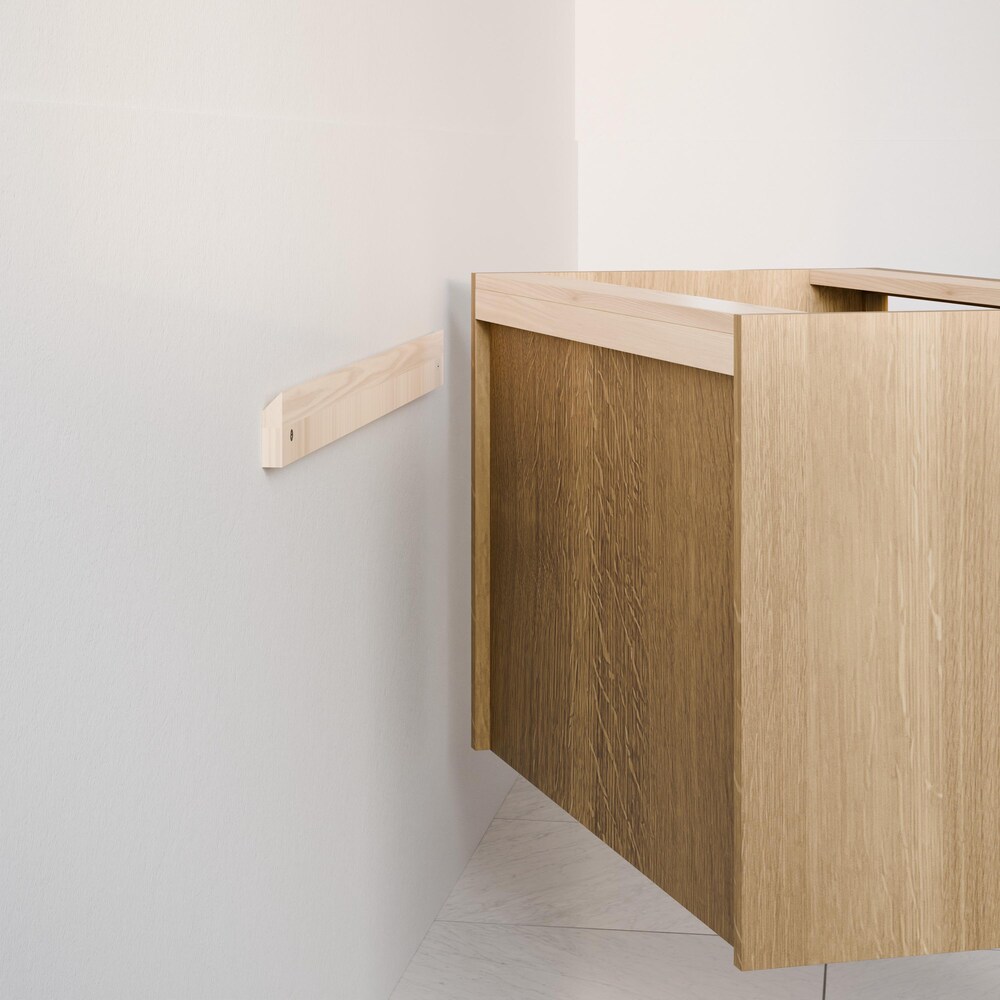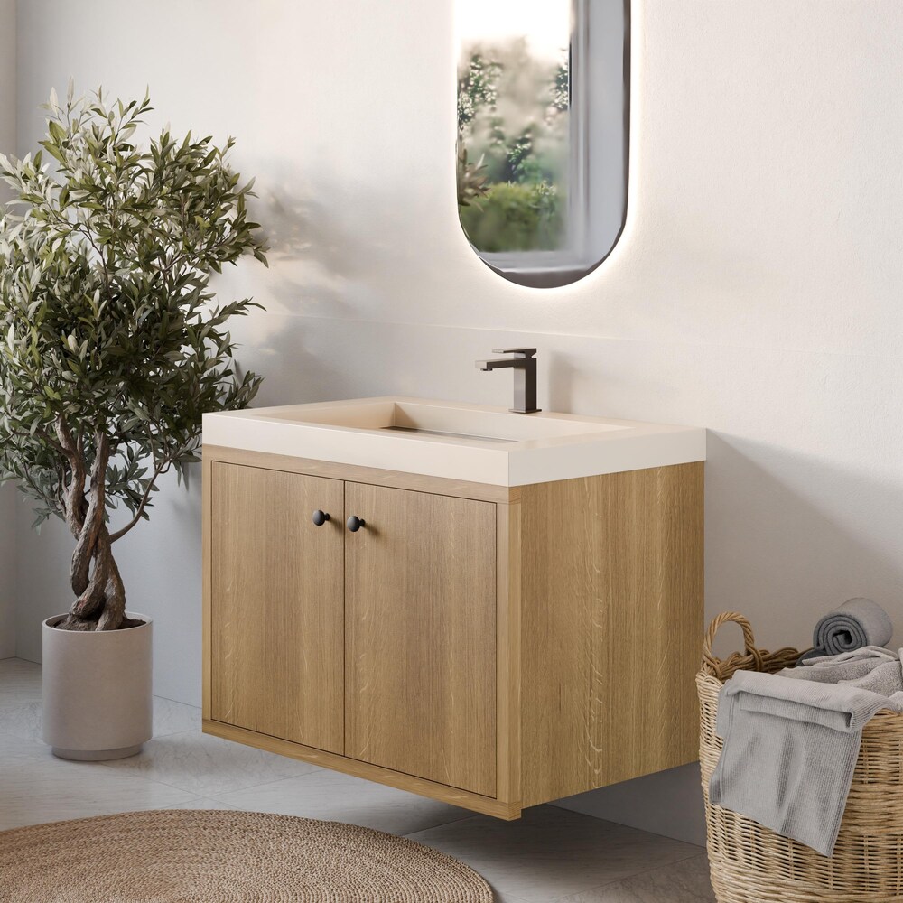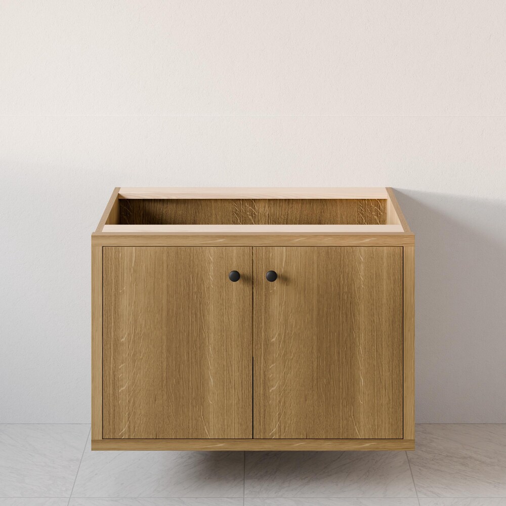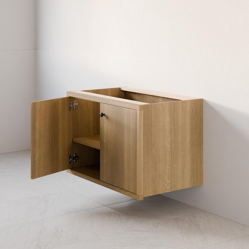 Our floating vanity is handmade in our Portland shop from the highest quality hardwood veneer. We use 3/4” A1 Cabinet Grade White Oak veneer with a sturdy 1/2” back panel which is easily cut for plumbing at the time of install. The face frame is solid White Oak with edge banded doors. Doors are hung on premium soft-close hinges