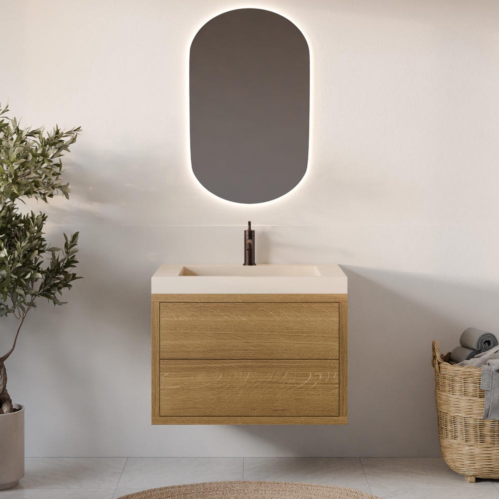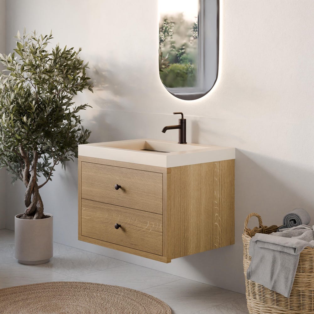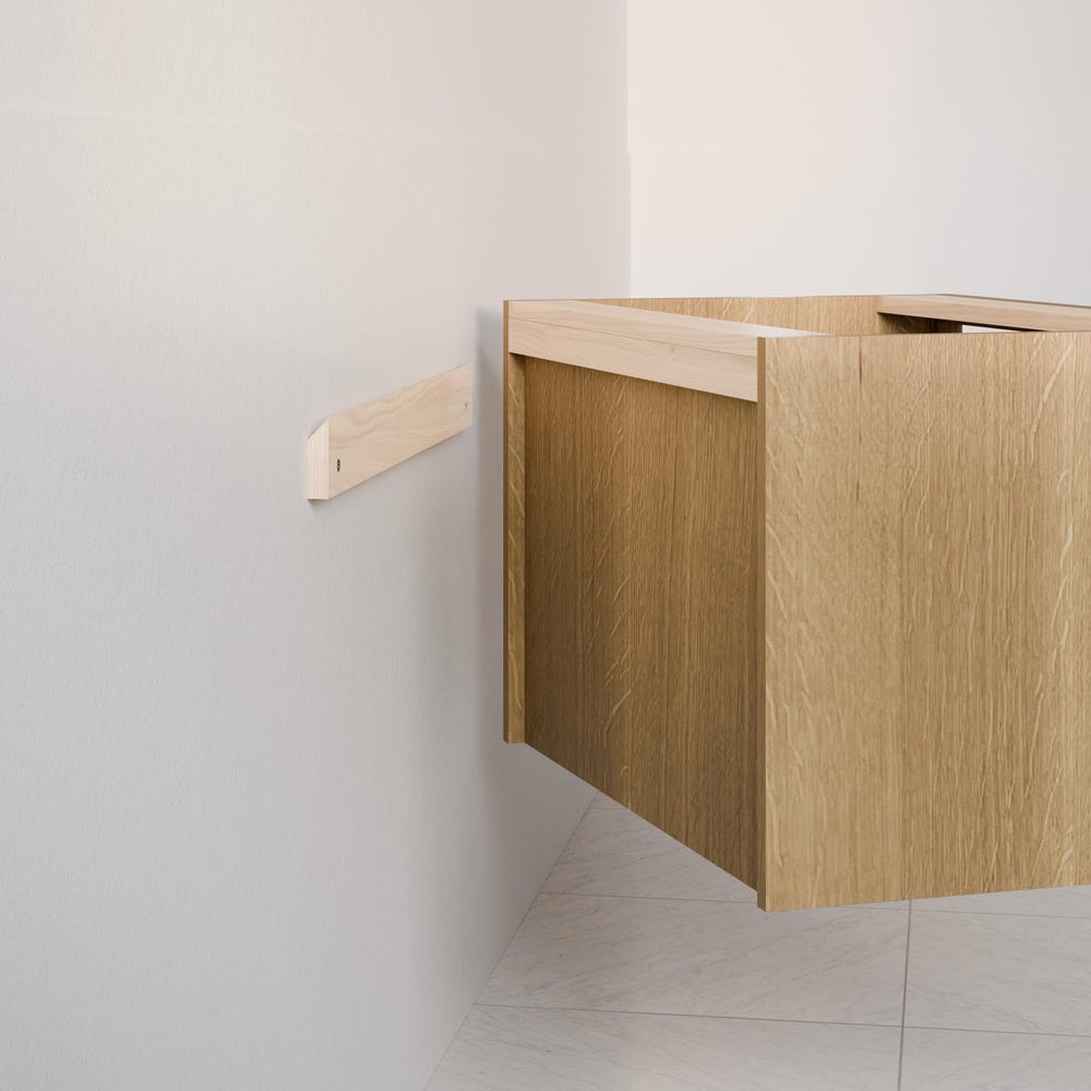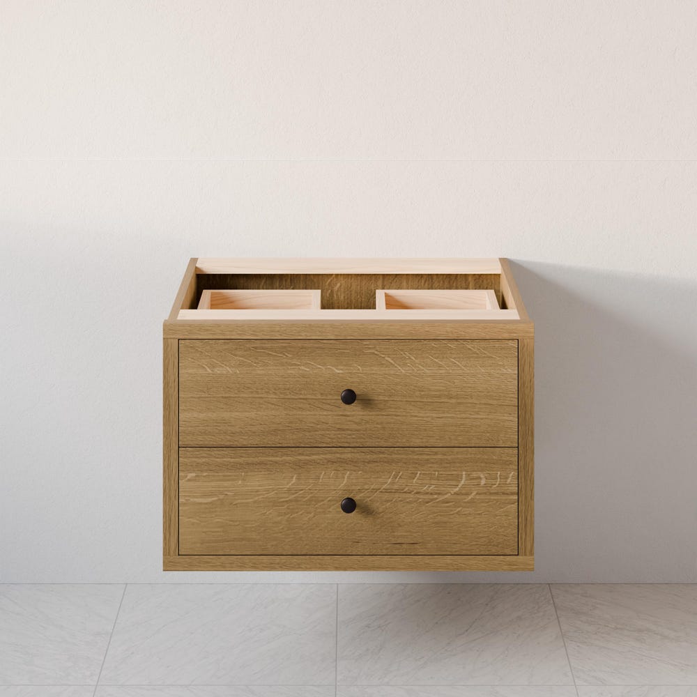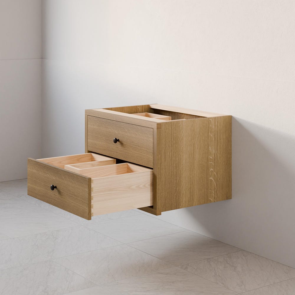 Our floating vanity is handmade in our Portland shop from the highest quality hardwood veneer. We use 3/4” A1 Cabinet Grade White Oak veneer with a sturdy 1/2” back panel which is easily cut for plumbing at the time of install. The face frame is solid White Oak with edge banded veneer drawer fronts.