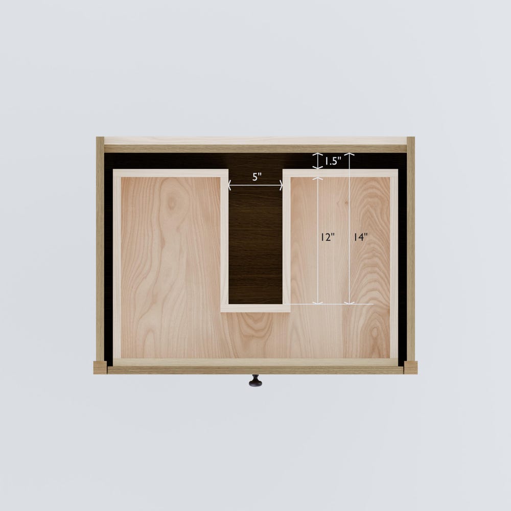 Standard plumbing cutout can be modified for your unique set-up if needed. See images for standard cut-out. Top drawer is shorter to allow for integrated counter/sink combos.