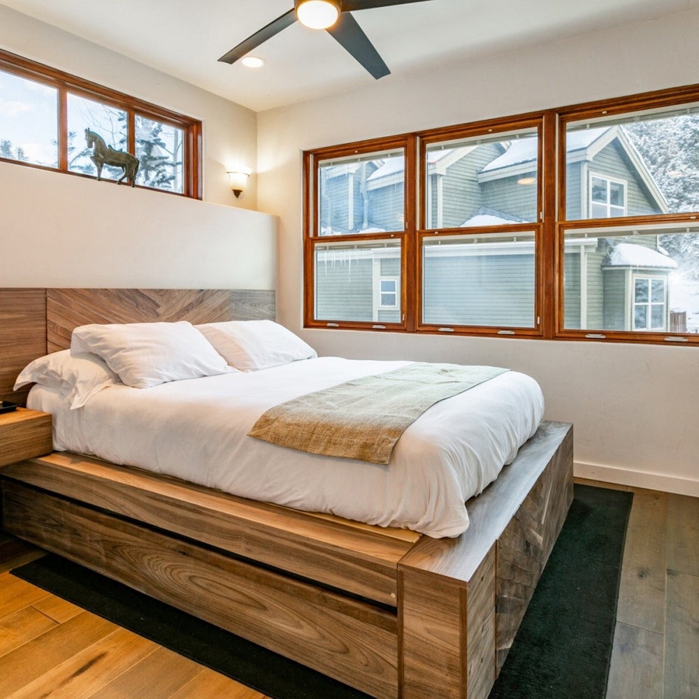 The Tux Buck bed frames is a perfect blend of style and functionality, ideal for farmhouse decor and a thoughtful gift for couples. With its handsome yet lean design, this updated version combines the natural beauty of wooden bed frame with a slimmer profile. The immaculately symmetrical frame showcases a unique walnut chevron variegation that elevates your bedroom ambiance.