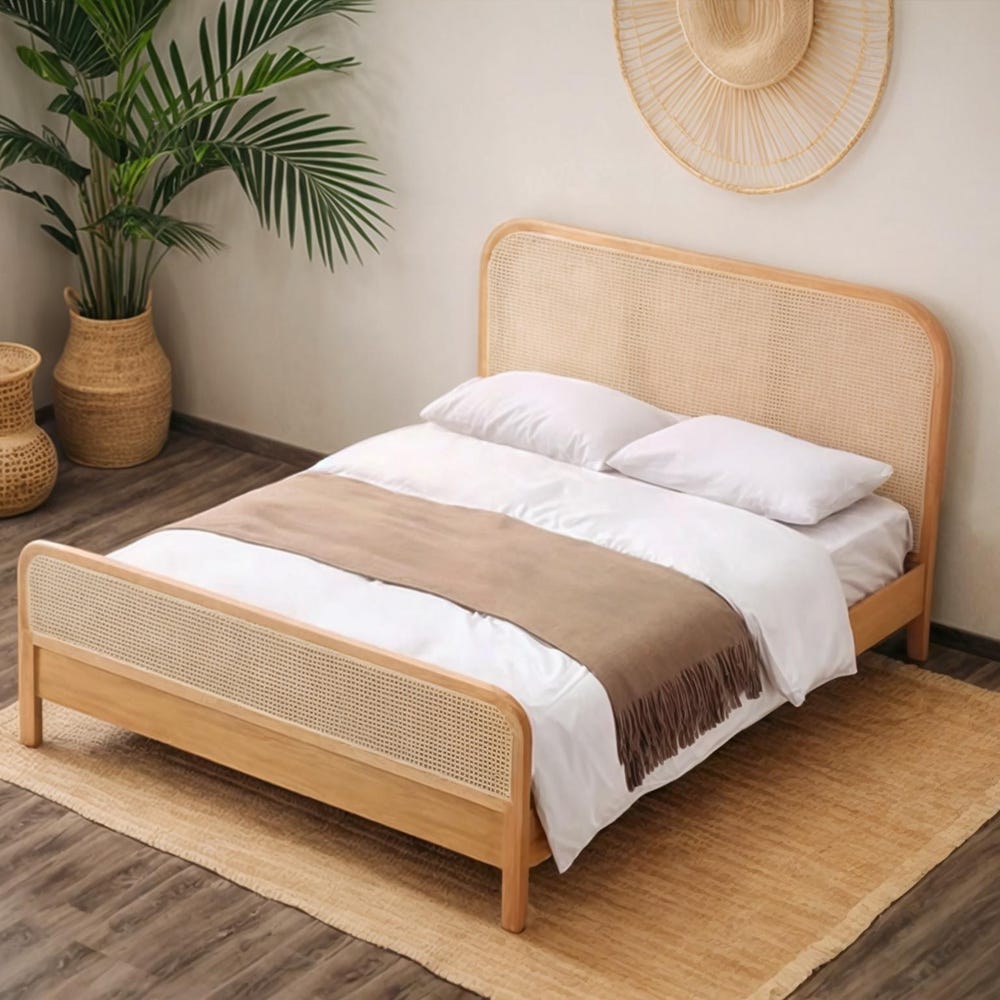 Beige Oak Bed with Rattan Headboard and Footboard Wooden Bed Frame, Boho Style Bed, Natural Rattan Accent Bed for Bedroom