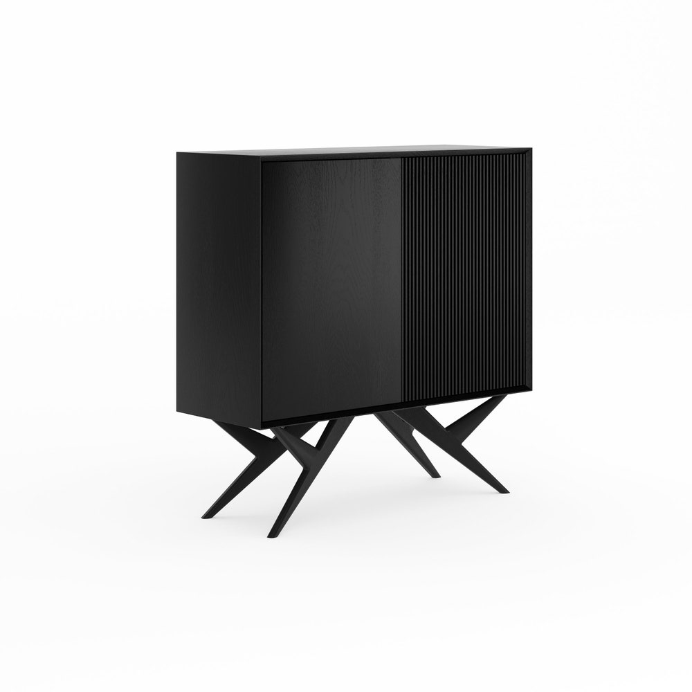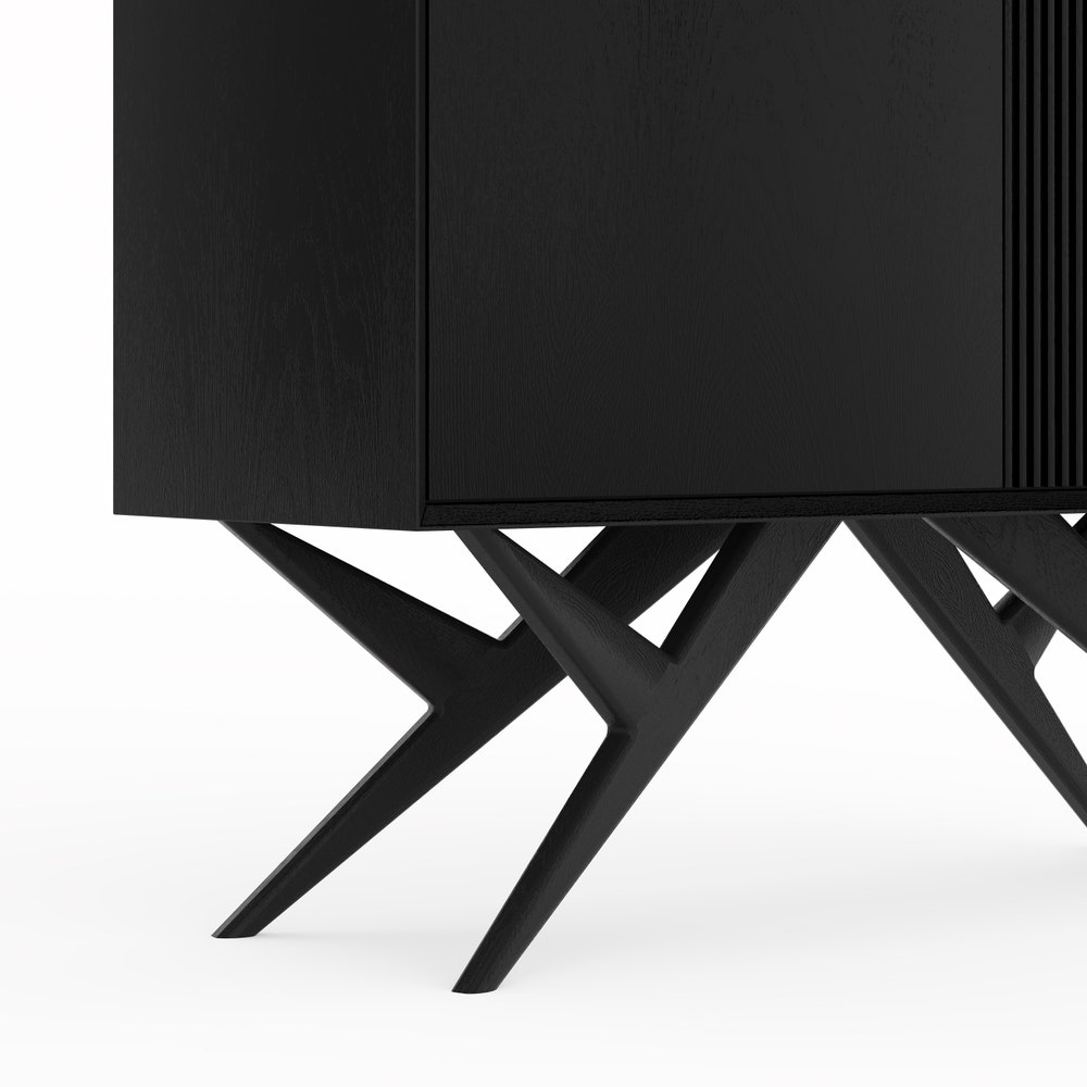 Black oak highboard with two slatted doors and organic shape base in mid century modern style, dresser, commode, media cabinet console