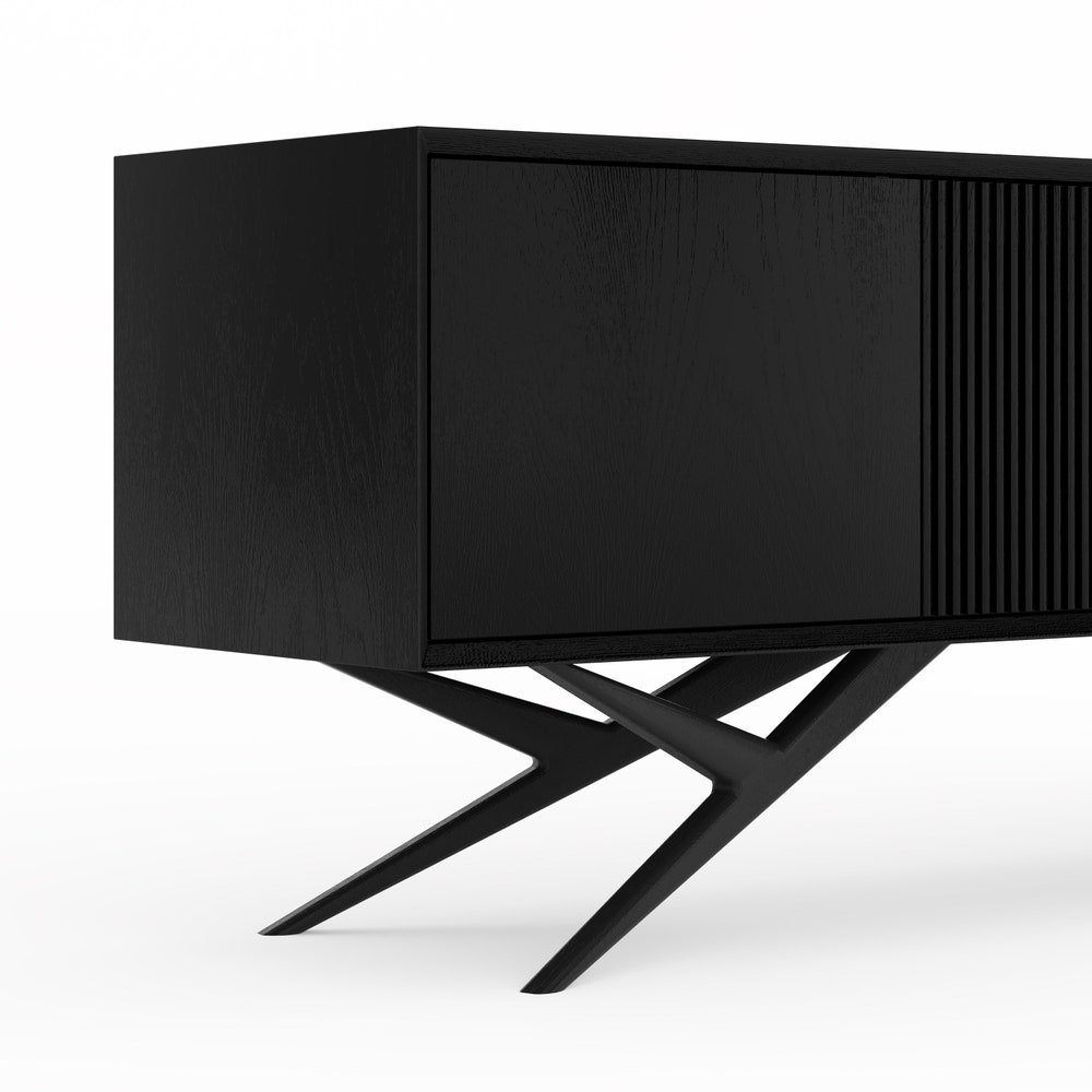 Black oak long sideboard with four slatted doors and organic shape base in mid century modern style, commode, TV stand, black media console